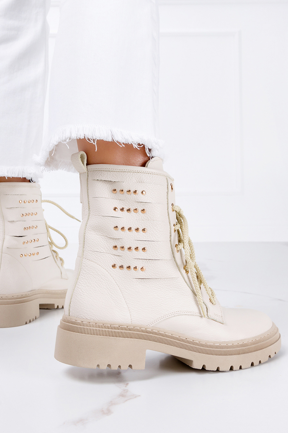Beżowe botki workery skórzane damskie na platformie z nitami sznurowane Casu model 1669-NO to doskonały wybór dla kobiet, które cenią sobie wysoką jakość, modny design i komfort noszenia. Wyprodukowane w Polsce z najlepszych gatunków skór, buty te łączą klasyczną elegancję z nowoczesnym, odważnym charakterem. Dzięki ręcznemu wykonaniu każda para gwarantuje perfekcyjne dopasowanie do stopy, a detale, takie jak złote nity i solidna bieżnikowana podeszwa, dodają im unikalnego stylu. To idealne połączenie miejskiego szyku z nutą rockowego pazura, które podkreśli Twój indywidualny charakter. Najwyższa jakość wykonania i luksusowe materiały Botki Casu model 1669-NO to synonim ręcznej precyzji i trwałości. Wykonane z naturalnej skóry najwyższej jakości, zapewniają perfekcyjne dopasowanie do stopy oraz doskonałą przewiewność, co sprawia, że możesz je nosić przez cały dzień bez uczucia zmęczenia. Skórzana wkładka oraz wnętrze buta gwarantują komfort i odpowiednią cyrkulację powietrza, zapobiegając przegrzewaniu się stóp. Solidna, bieżnikowana podeszwa nie tylko dodaje botkom charakteru, ale również zapewnia doskonałą przyczepność do podłoża, dzięki czemu sprawdzą się zarówno w miejskiej dżungli, jak i na bardziej wymagających nawierzchniach. Uniwersalny styl - idealne do każdej stylizacji Te beżowe botki workery to model, który łatwo dopasujesz do wielu outfitów - zarówno codziennych, jak i bardziej eleganckich. Ich subtelny odcień beżu nadaje im niezwykle uniwersalny charakter, który sprawia, że będą doskonałym uzupełnieniem zarówno klasycznych jeansów i skórzanej ramoneski, jak i romantycznej sukienki w stylu boho. Metalowe nity i solidna podeszwa nadają im wyrazistości, podkreślając Twoją niezależność i styl. Możesz je nosić zarówno na co dzień, jak i podczas wieczornych wyjść - ich modny, ale ponadczasowy design sprawia, że będą pasować do wielu sezonowych trendów. Funkcjonalność i wygoda na co dzień Botki to nie tylko modny dodatek, ale także niezwykle wygodny wybór. Sznurowanie pozwala na idealne dopasowanie do kształtu stopy, co zapewnia stabilność i komfort noszenia. Cholewka o odpowiedniej wysokości chroni kostkę, a jednocześnie nie ogranicza swobody ruchu. Solidna podeszwa na platformie sprawia, że buty są niezwykle wygodne nawet podczas długich spacerów. Jeśli szukasz butów, które będą niezawodne w każdych warunkach, a jednocześnie dodadzą Twoim stylizacjom wyjątkowego charakteru, ten model jest dla Ciebie idealnym wyborem. Cechy wyróżniające: Produkt polski - wykonane ręcznie z najwyższej jakości skóry Modny fason - połączenie klasyki z rockowym stylem Solidna, bieżnikowana podeszwa zapewniająca doskonałą przyczepność Skórzana wkładka i wnętrze gwarantujące komfort noszenia Stylowe złote nity dodające charakteru Sznurowane, co pozwala na idealne dopasowanie do stopy Uniwersalny, beżowy kolor pasujący do wielu stylizacji Podkreśl swój styl i wybierz niezawodną jakość! Beżowe workery skórzane na platformie to wybór dla kobiet, które cenią sobie połączenie stylu, wygody i wysokiej jakości. Ich modny, ale ponadczasowy design sprawia, że będą pasować do wielu stylizacji i okazji. Jeśli szukasz butów, które wyróżnią Cię z tłumu i jednocześnie zapewnią komfort przez cały dzień - ten model jest dla Ciebie! Zamów je już dziś w sklepie Casu. pl i ciesz się wyjątkowym stylem każdego dnia.