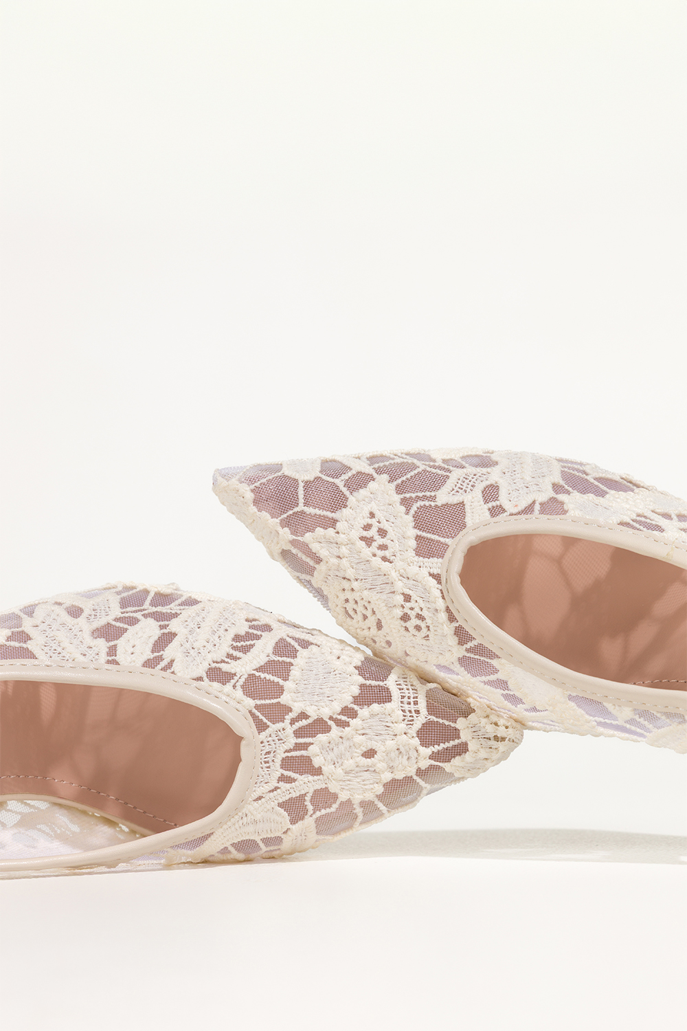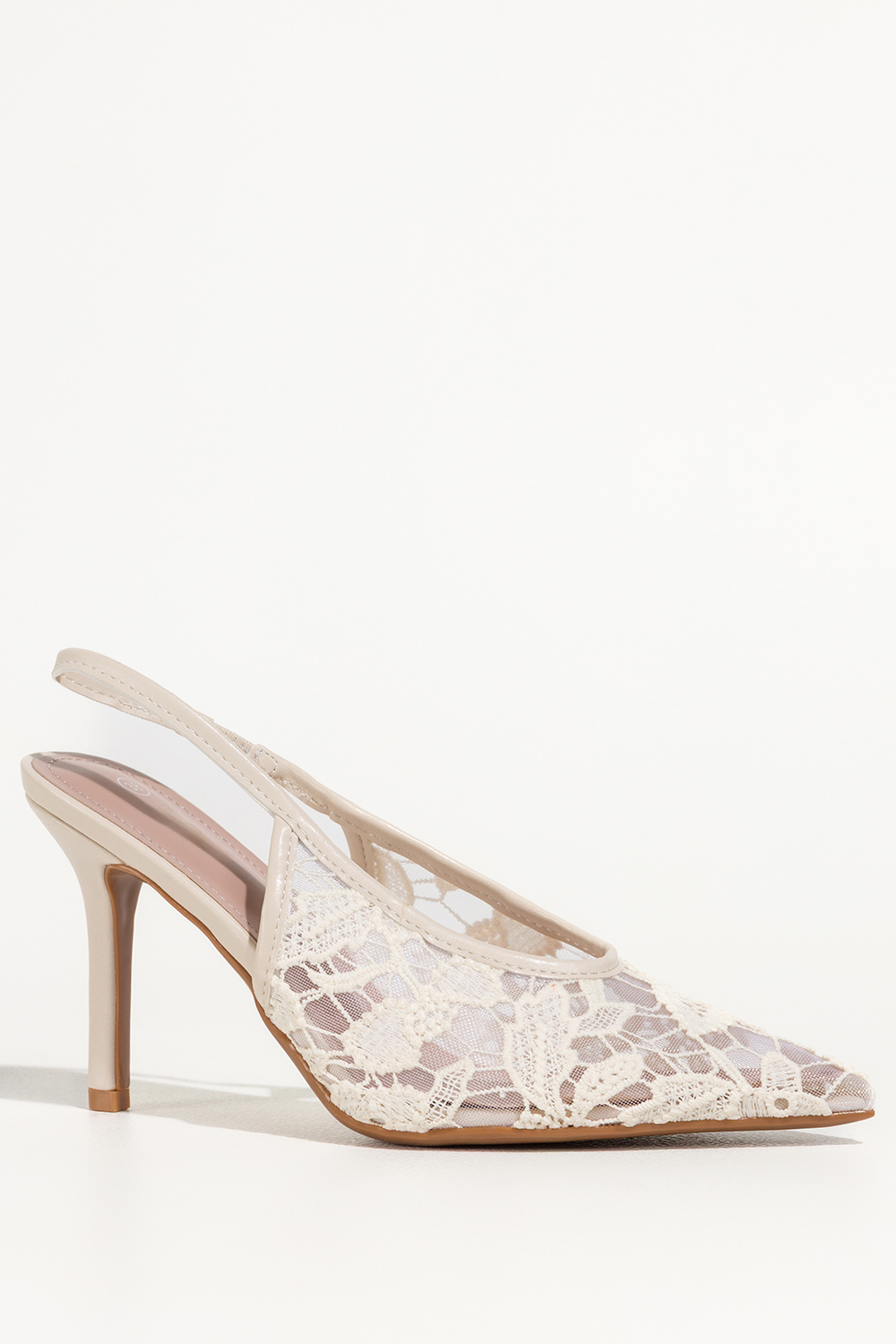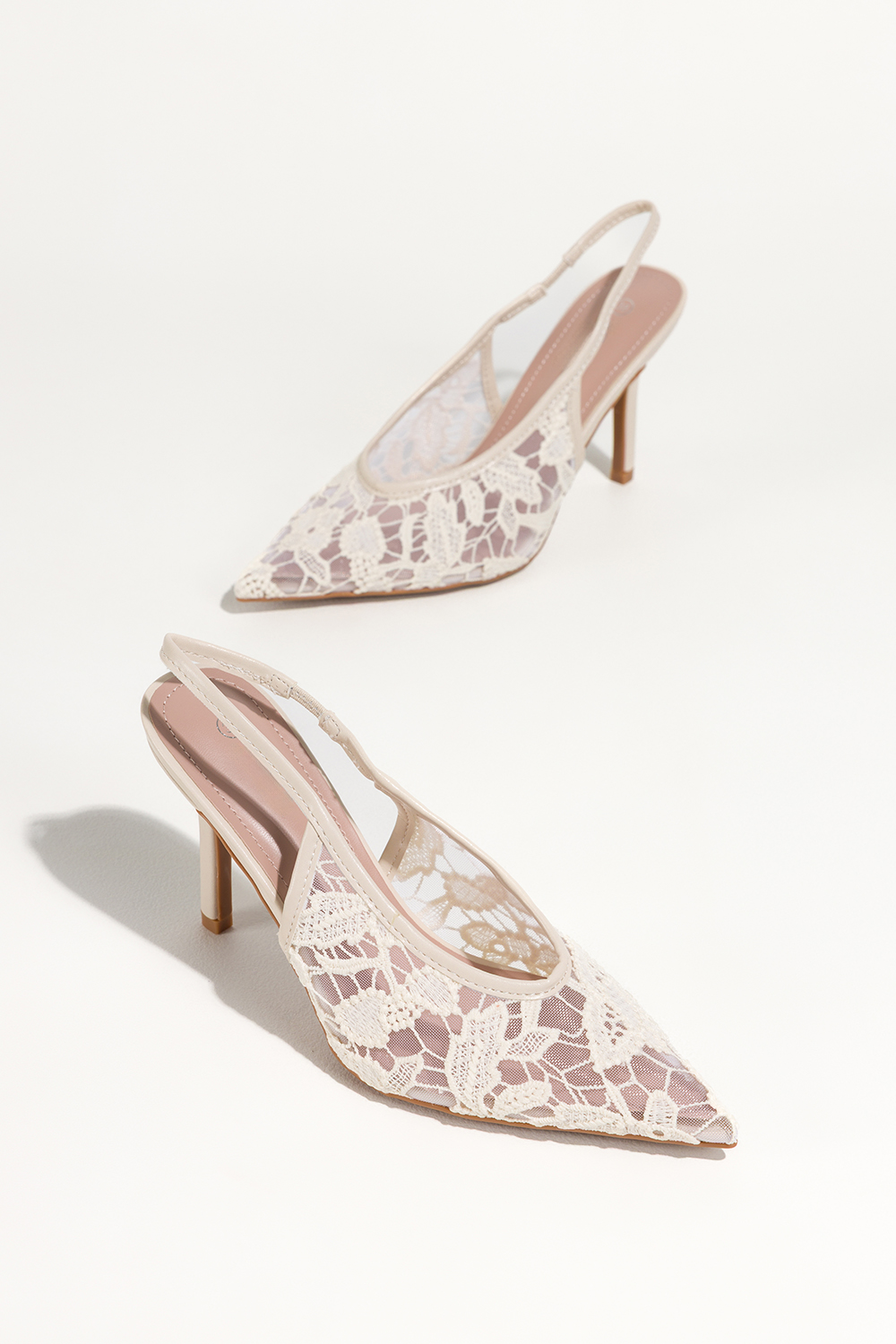 Beżowe czółenka damskie szpilki koronkowe odkryta pięta guma w pasku Carla S1-8844V