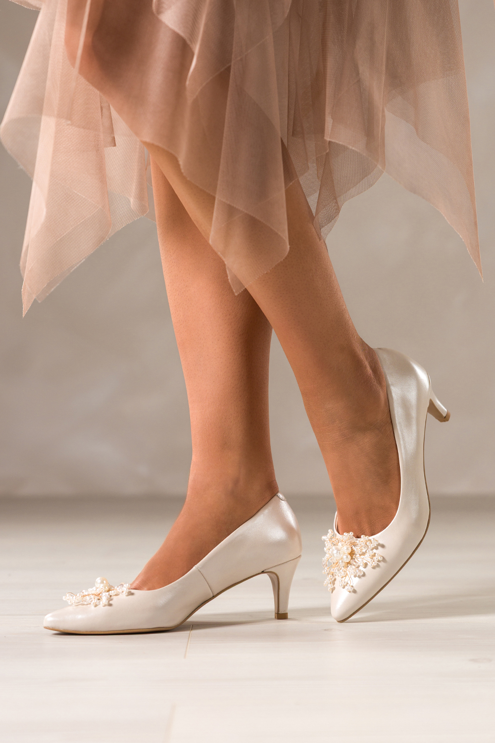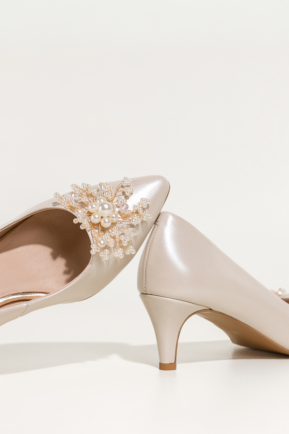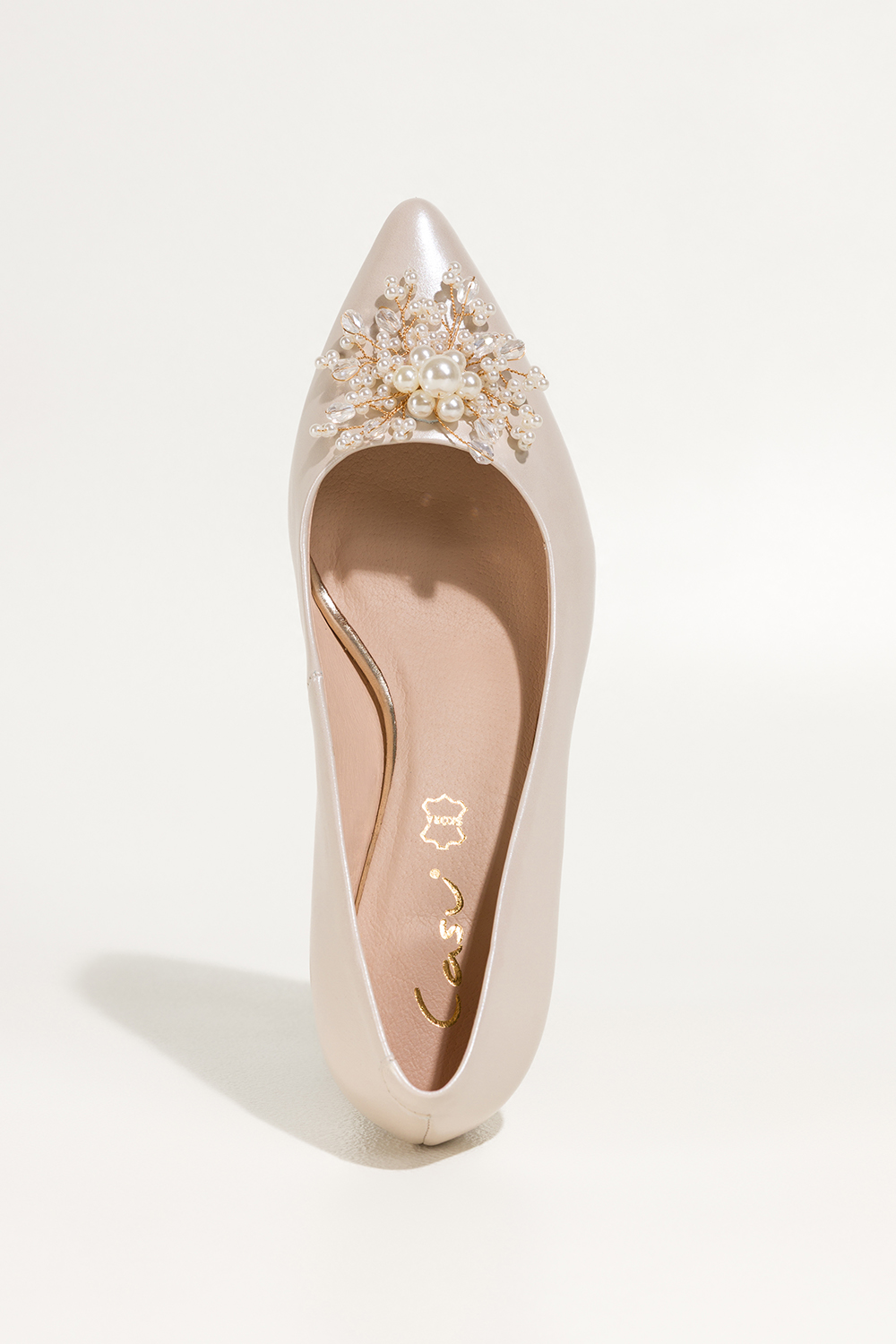 Beżowe czółenka skórzane damskie z perłową powłoką ozdoba z perełek i kryształków PRODUKT POLSKI Ca