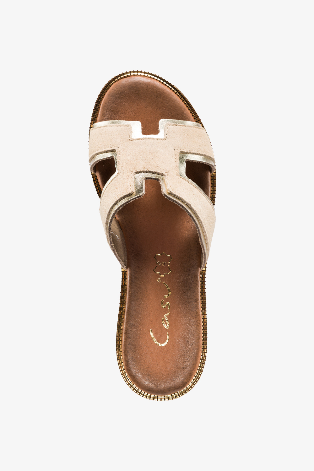 Beżowe klapki skórzane damskie na ozdobnej płaskiej podeszwie złota ozdoba PRODUKT POLSKI Casu 4042