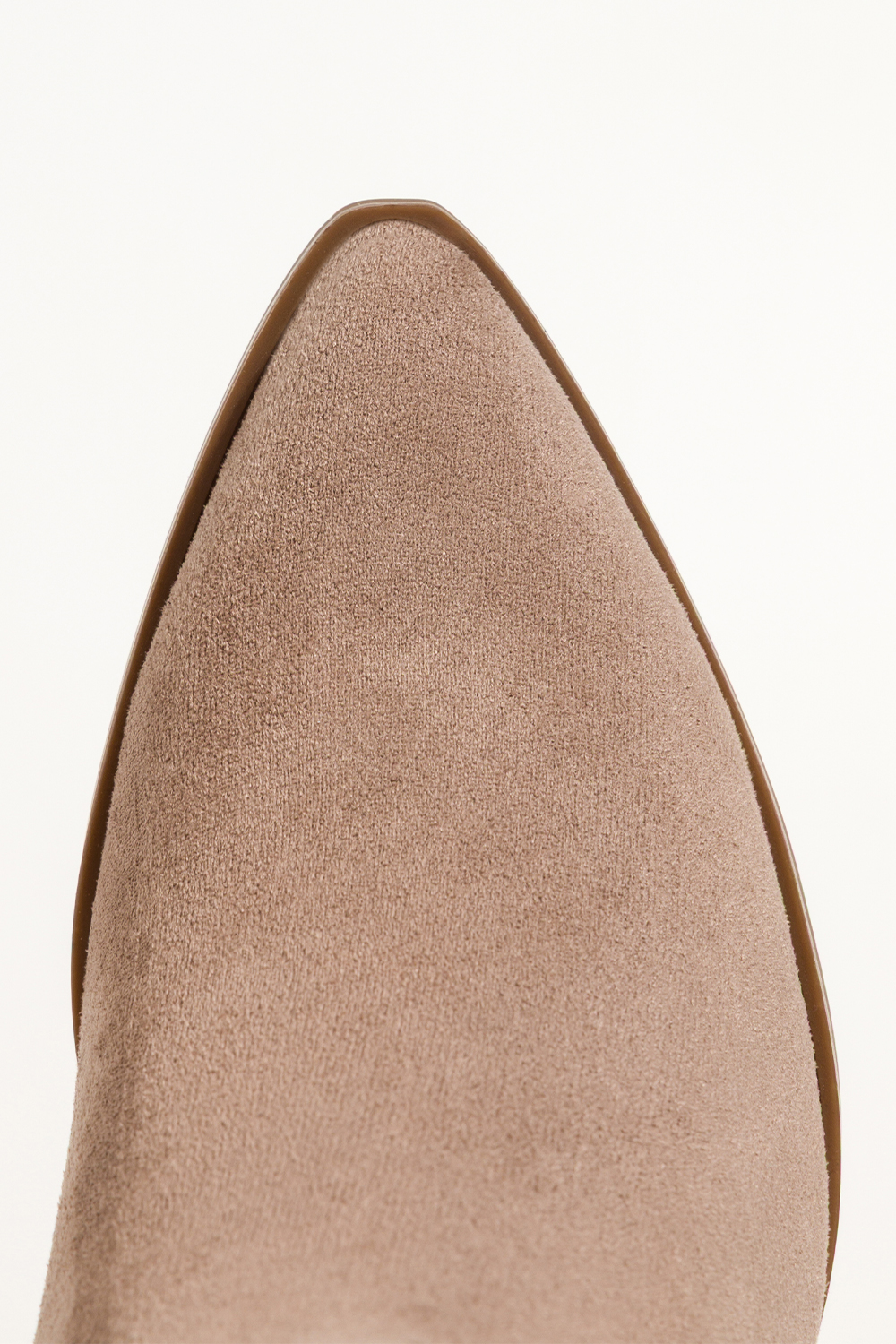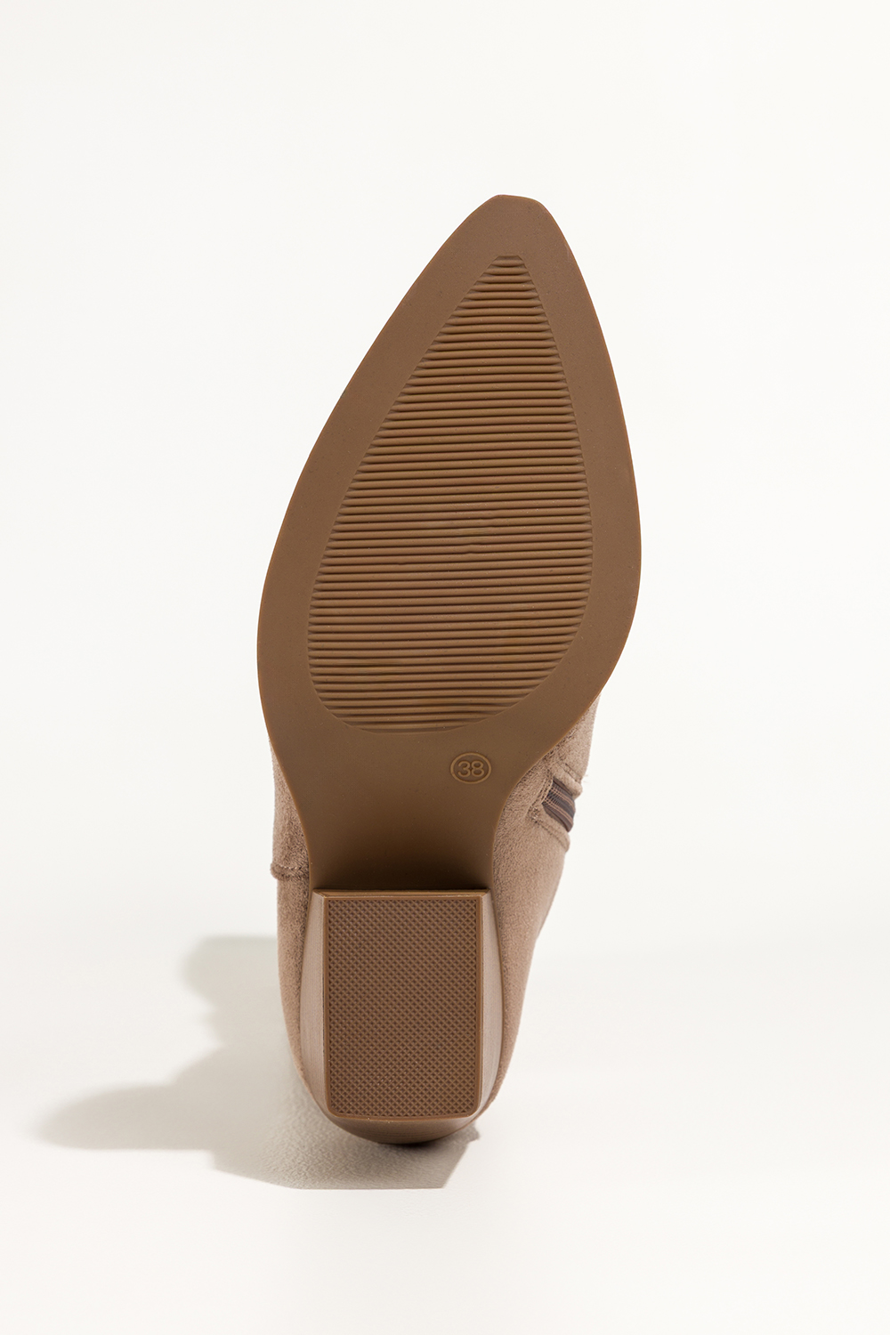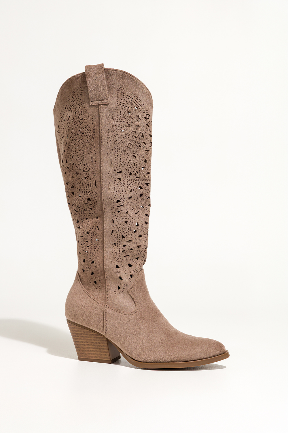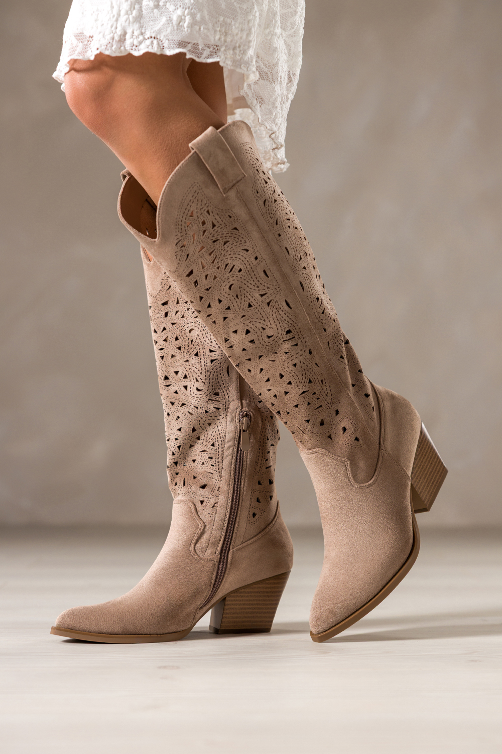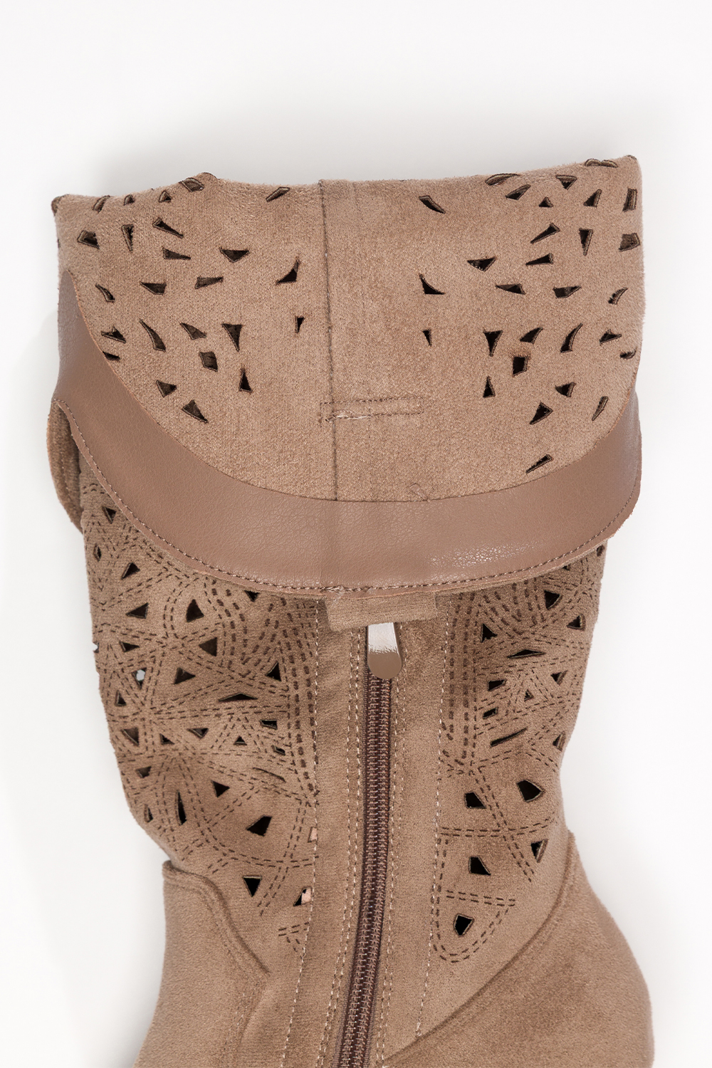 Beżowe kozaki damskie kowbojki z szeroką ażurową cholewką na ściętym klocku Carla MH402K
