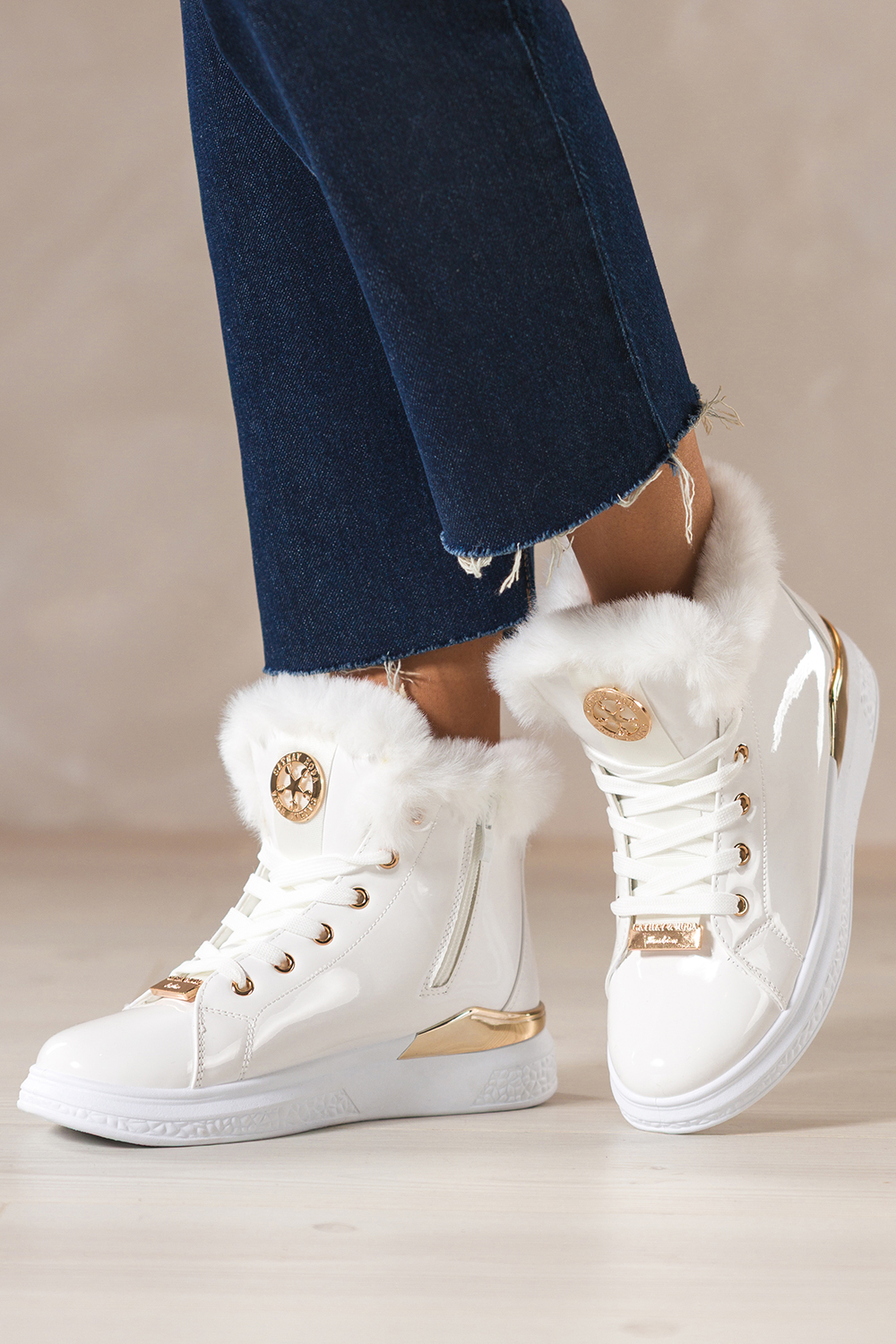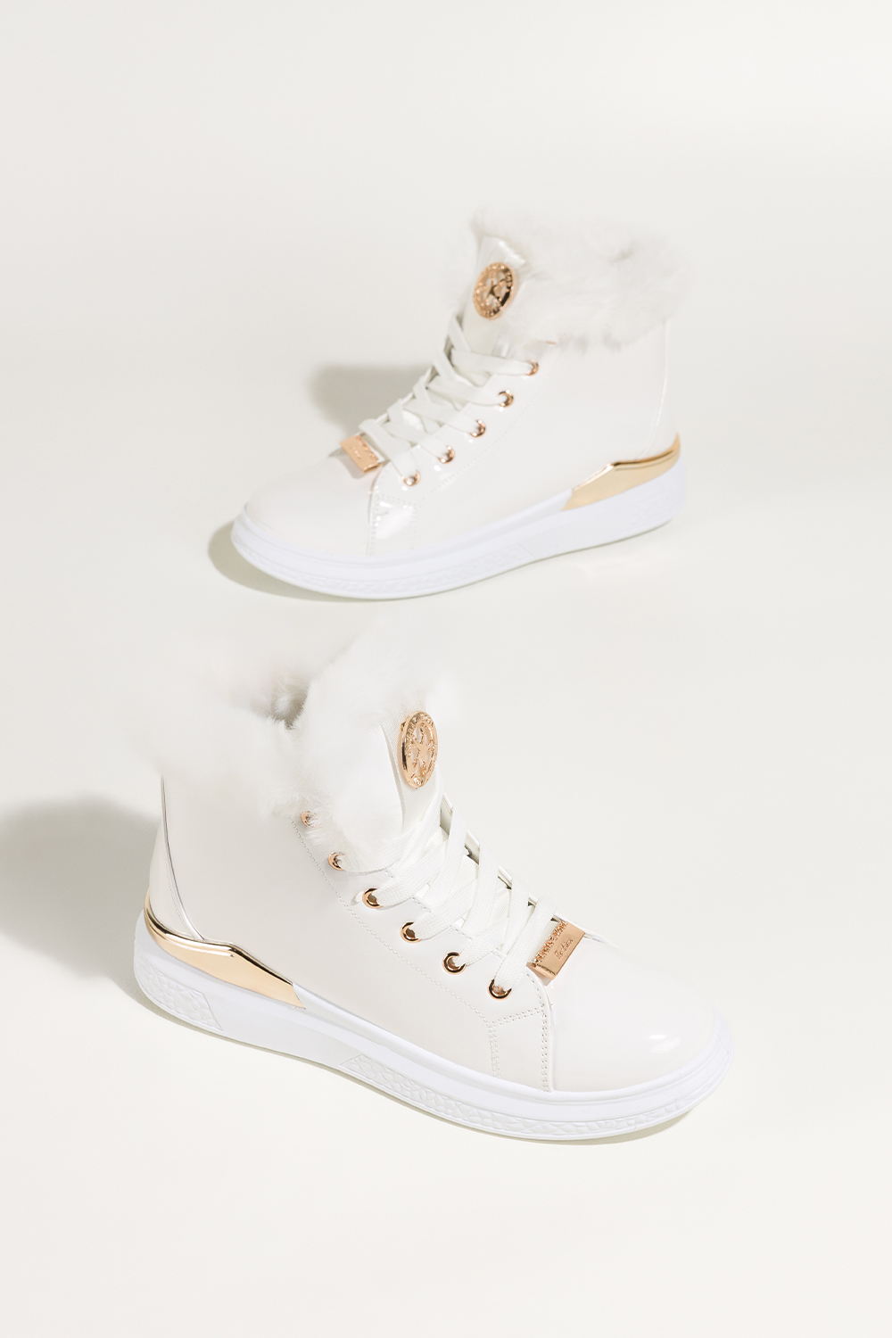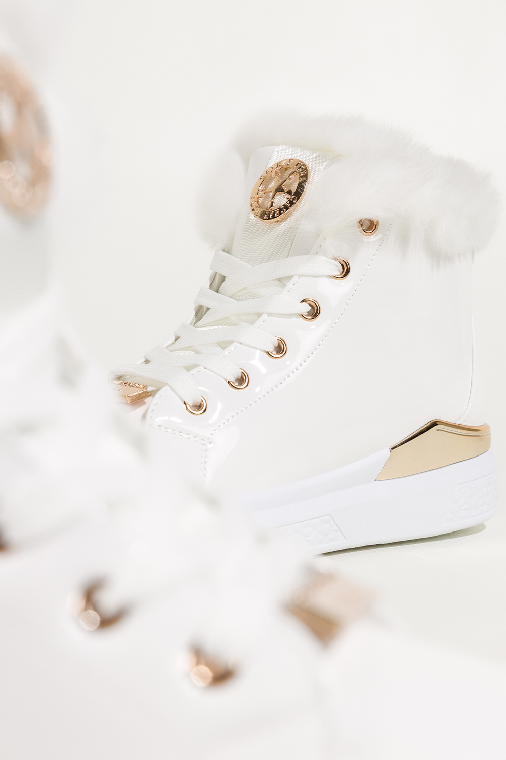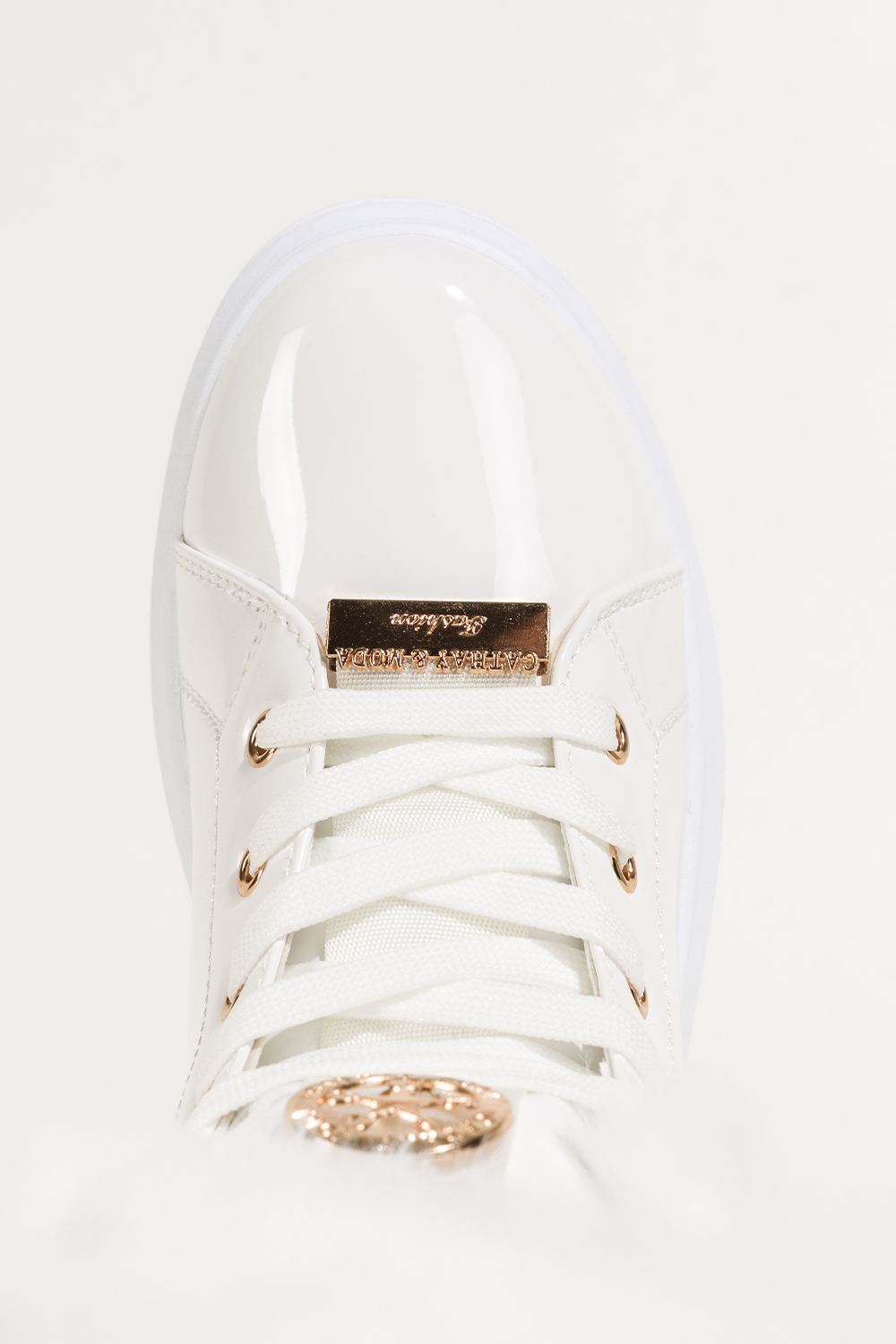 Białe botki damskie lakierowane platforma ze złotym akcentem złota ozdoba na języku sznurowane Casu