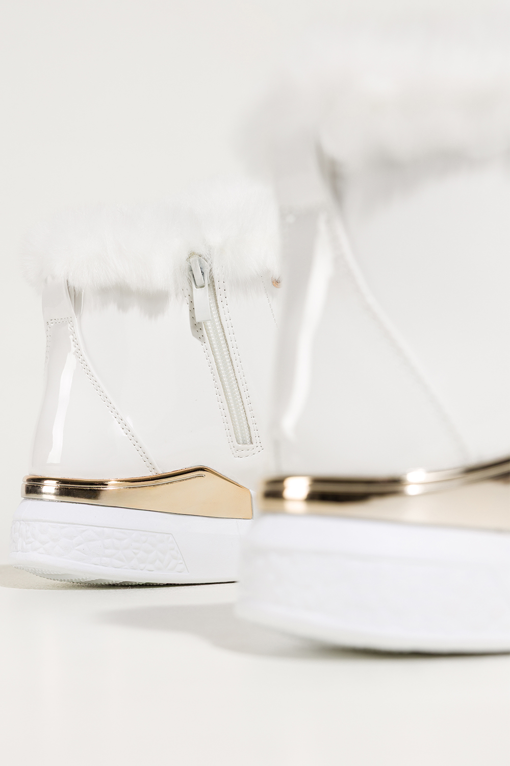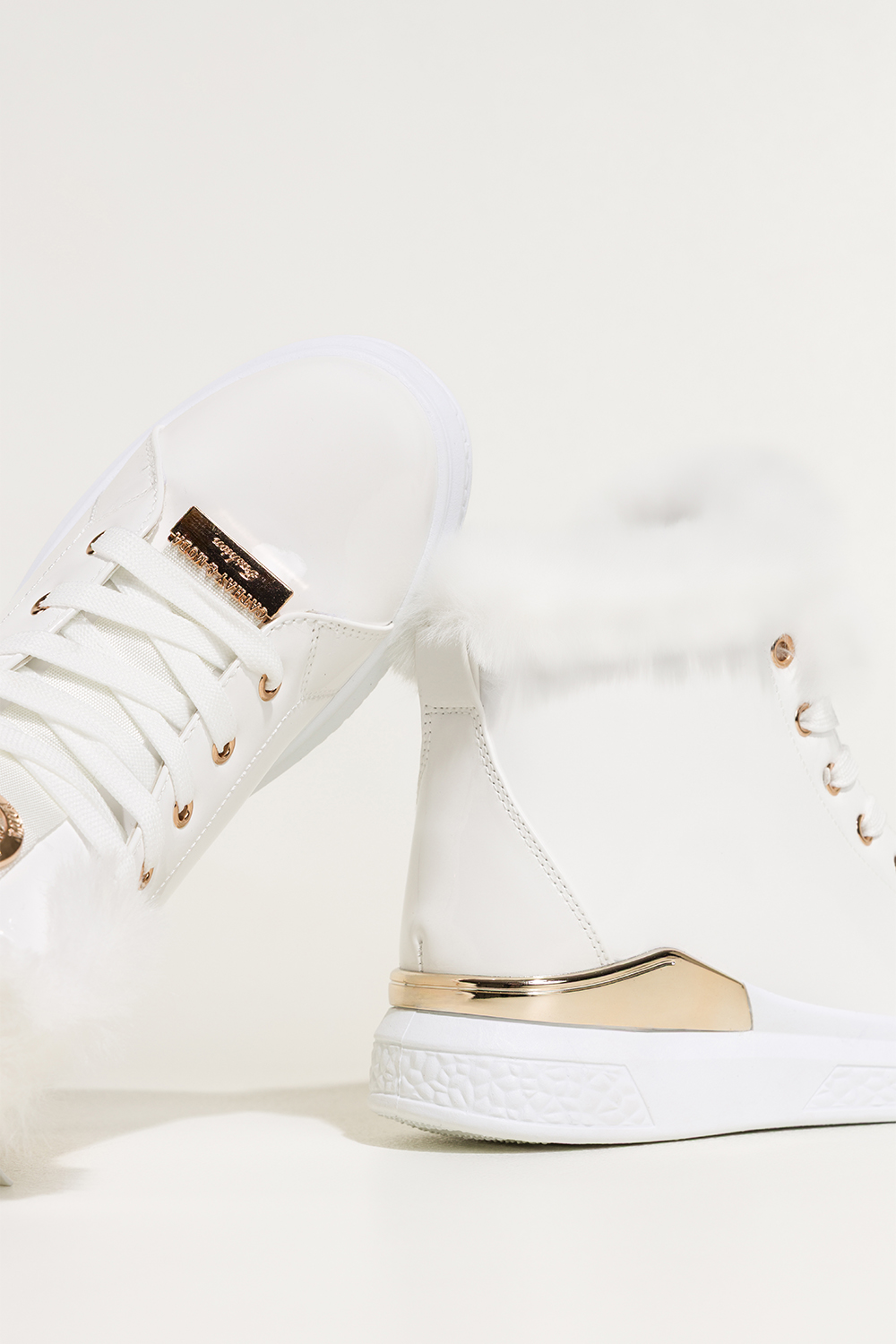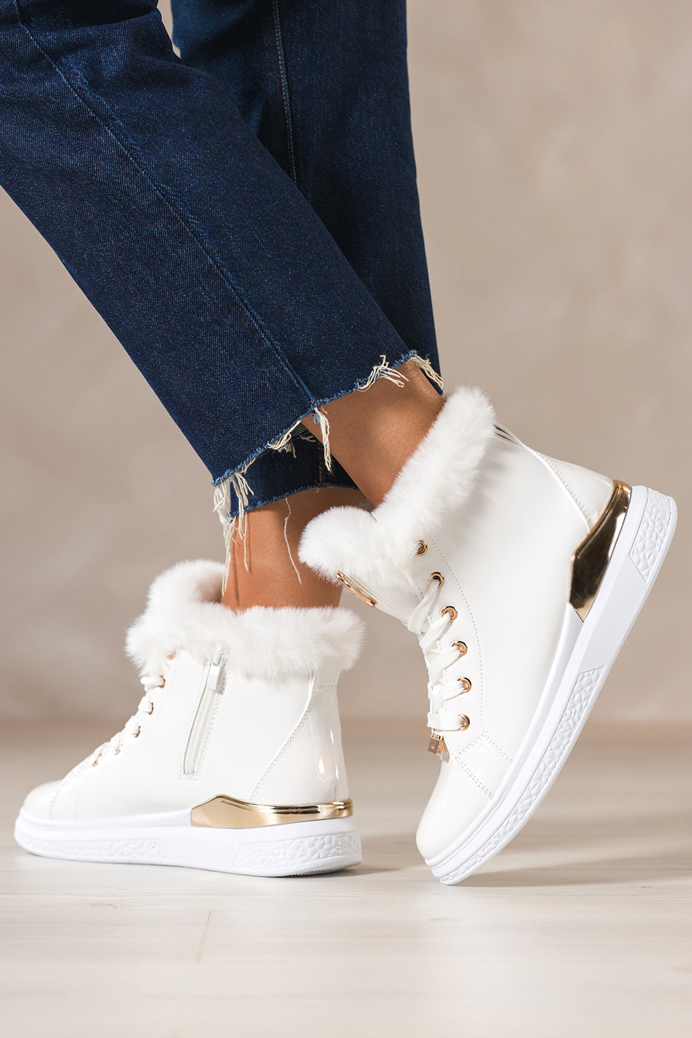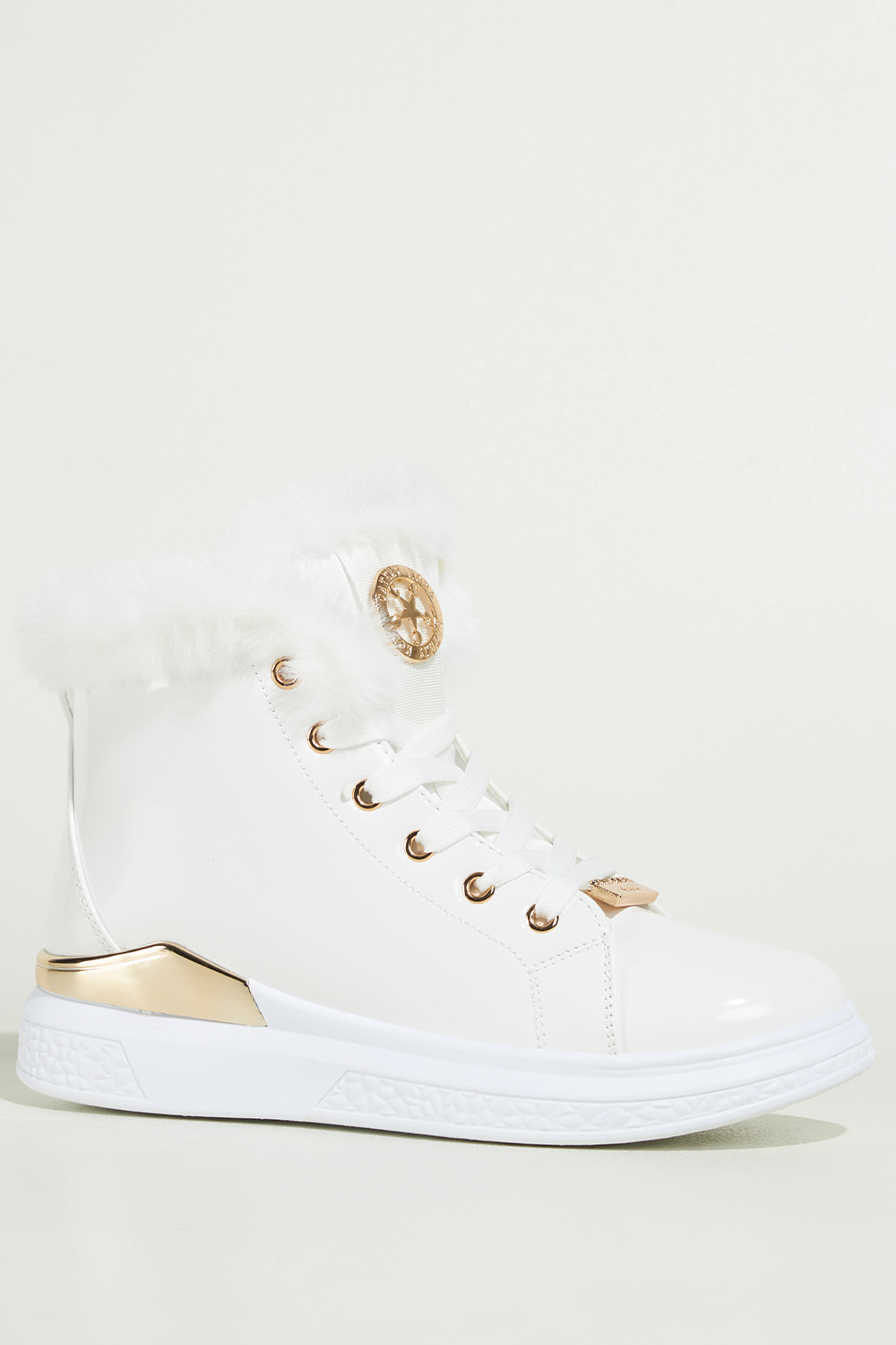 Białe botki damskie lakierowane platforma ze złotym akcentem złota ozdoba na języku sznurowane Casu