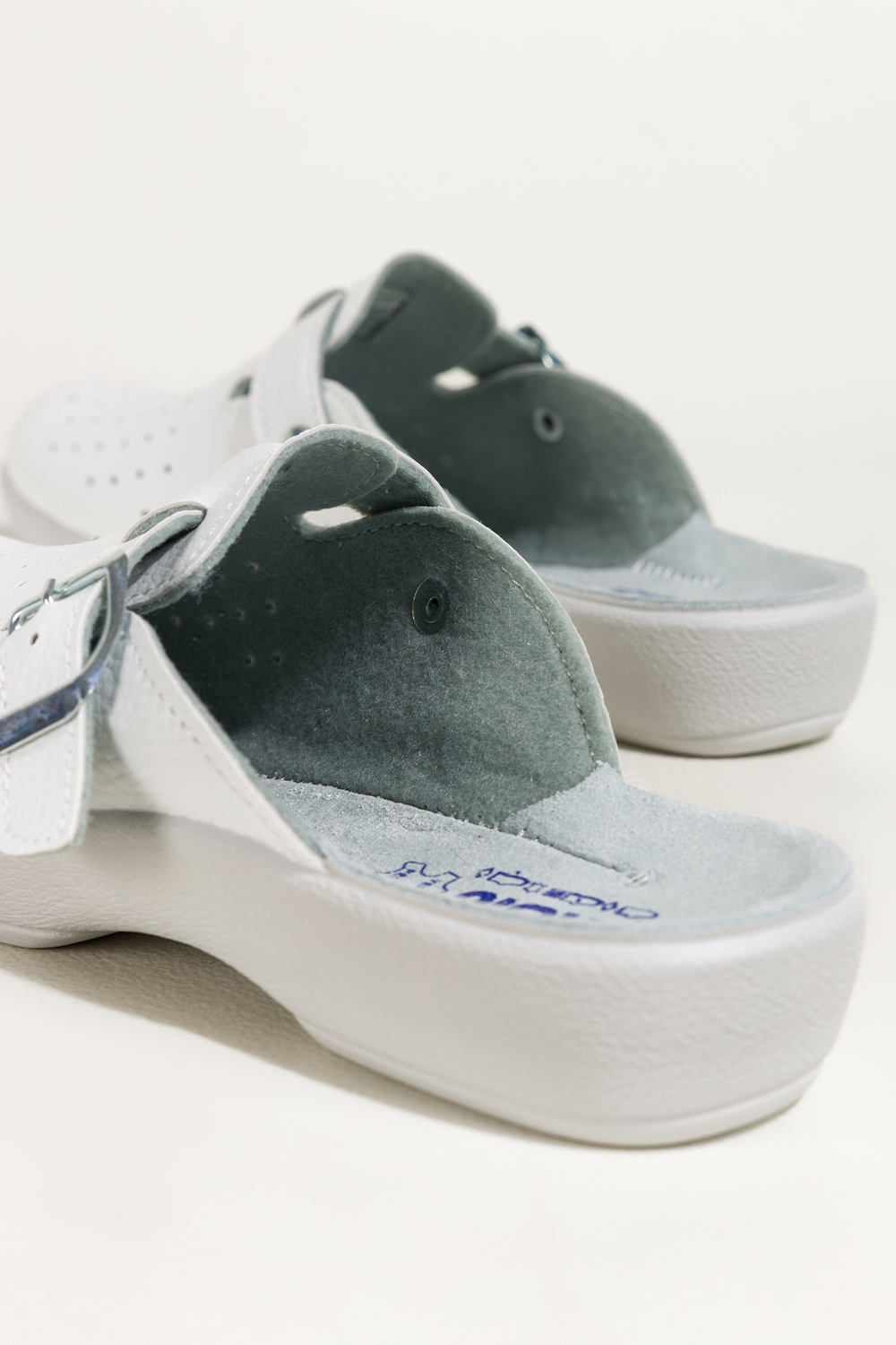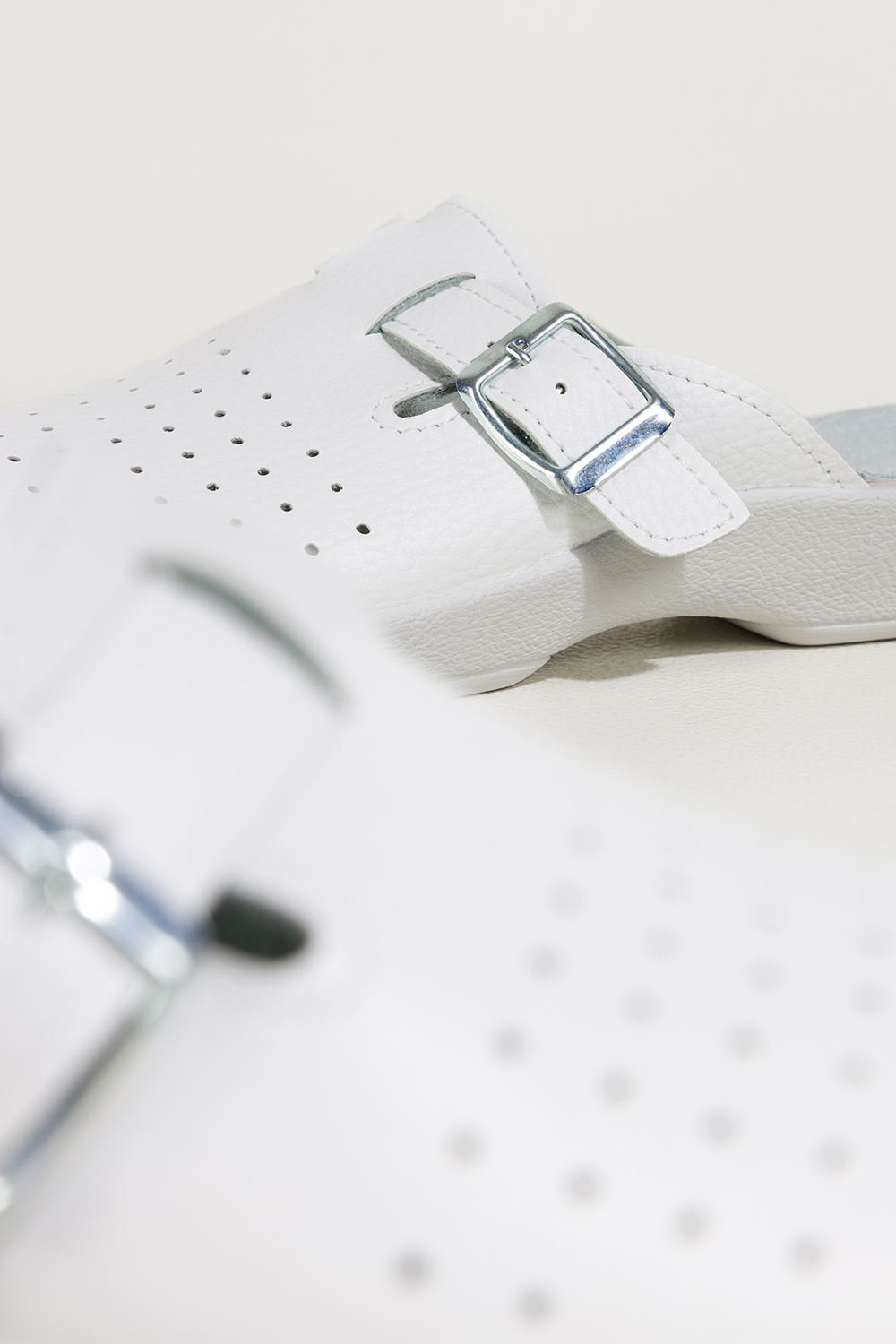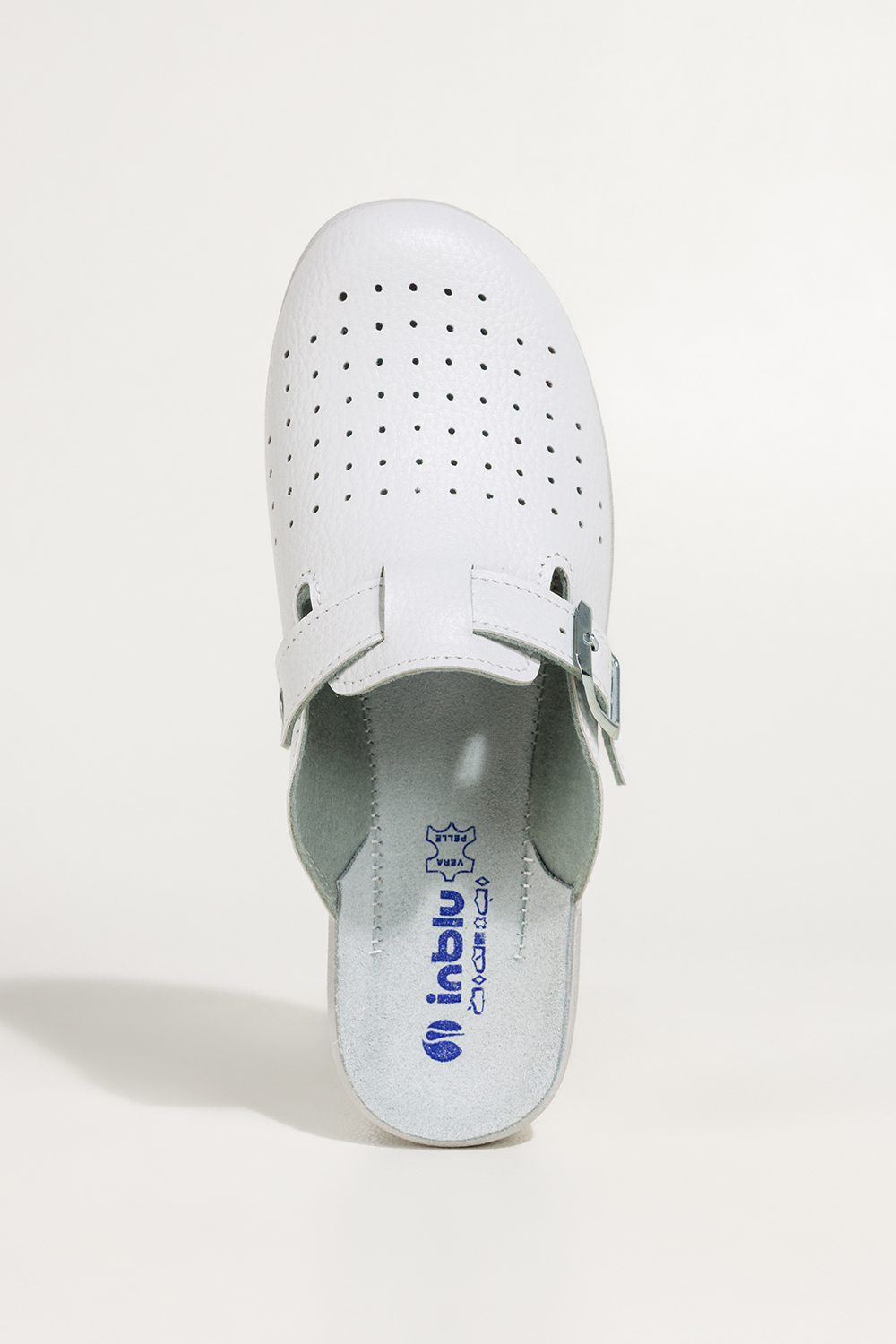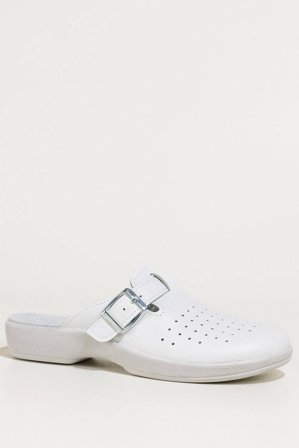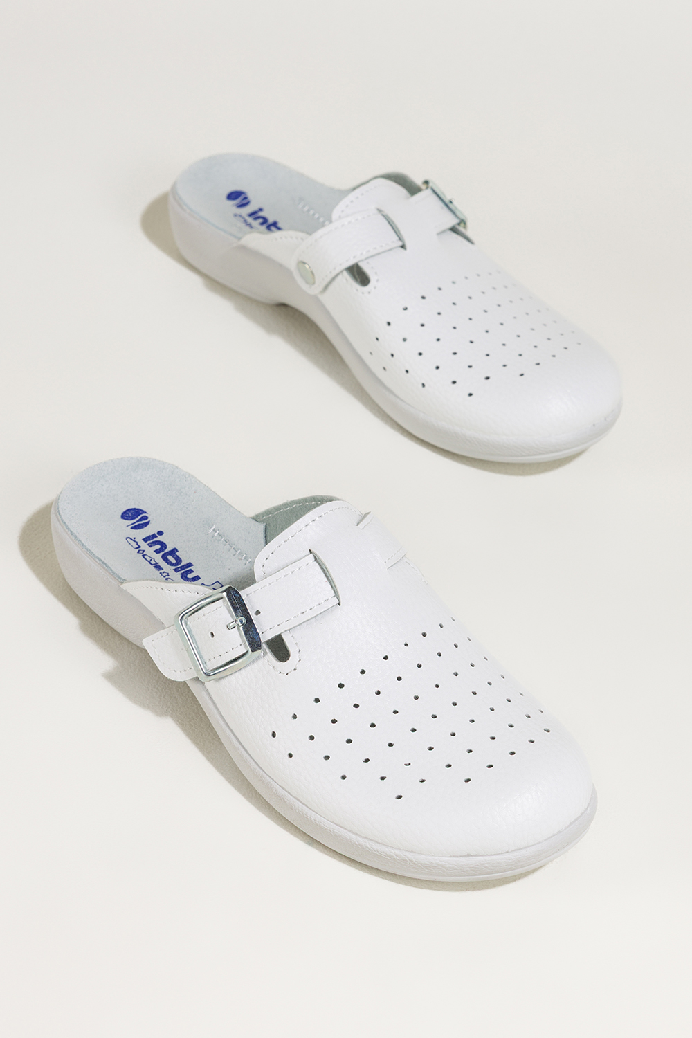 Białe klapki damskie Inblu sanitarne medyczne skórzana wkładka pasek ze srebrną klamrą ZV999998