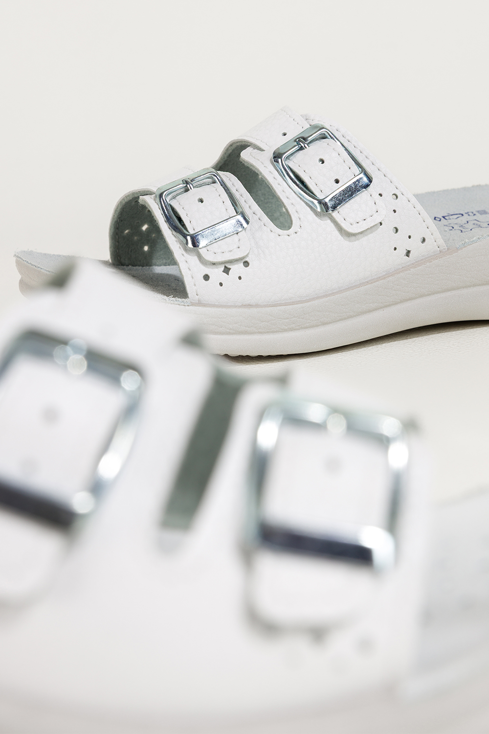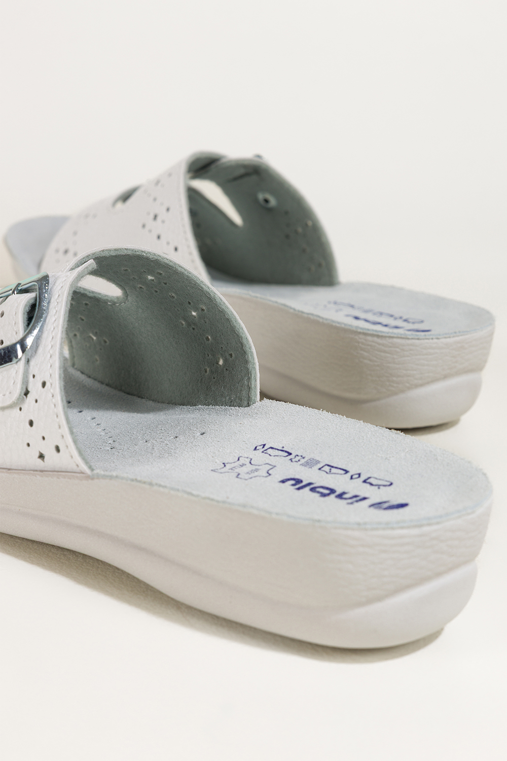 Białe klapki damskie Inblu sanitarne medyczne skórzana wkładka wąski pasek ze srebrną klamrą ZV9999