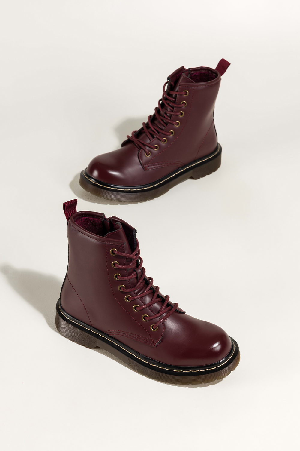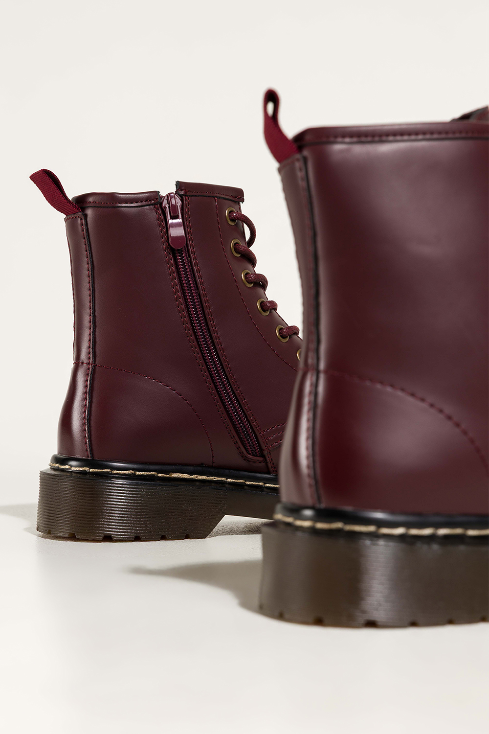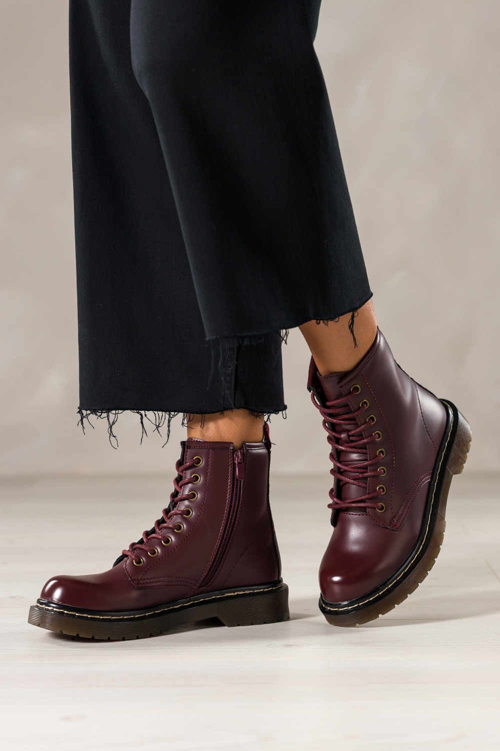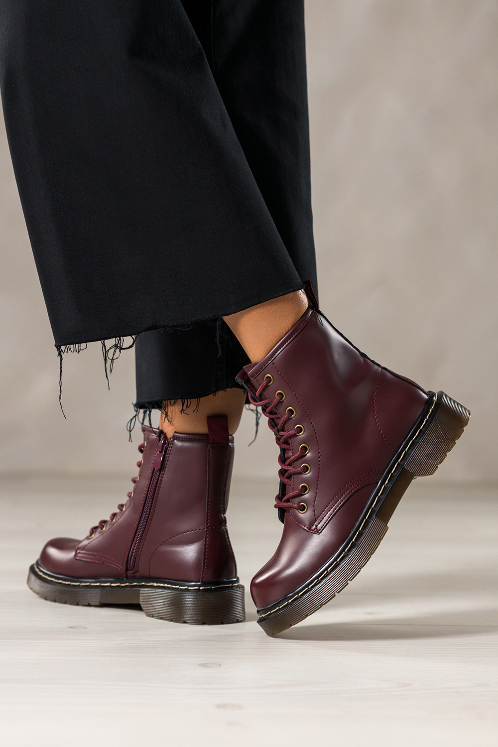 Bordowe botki damskie glany na bieżnikowanej platformie z przeszyciami sznurowane Casu D794-57