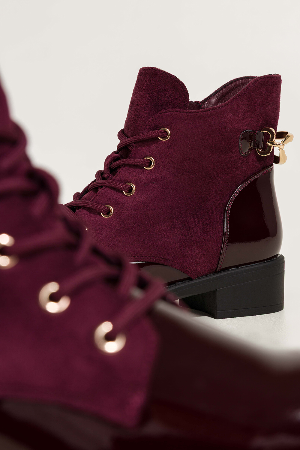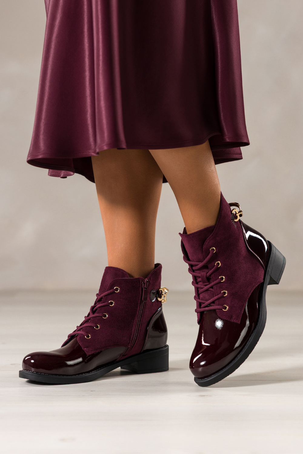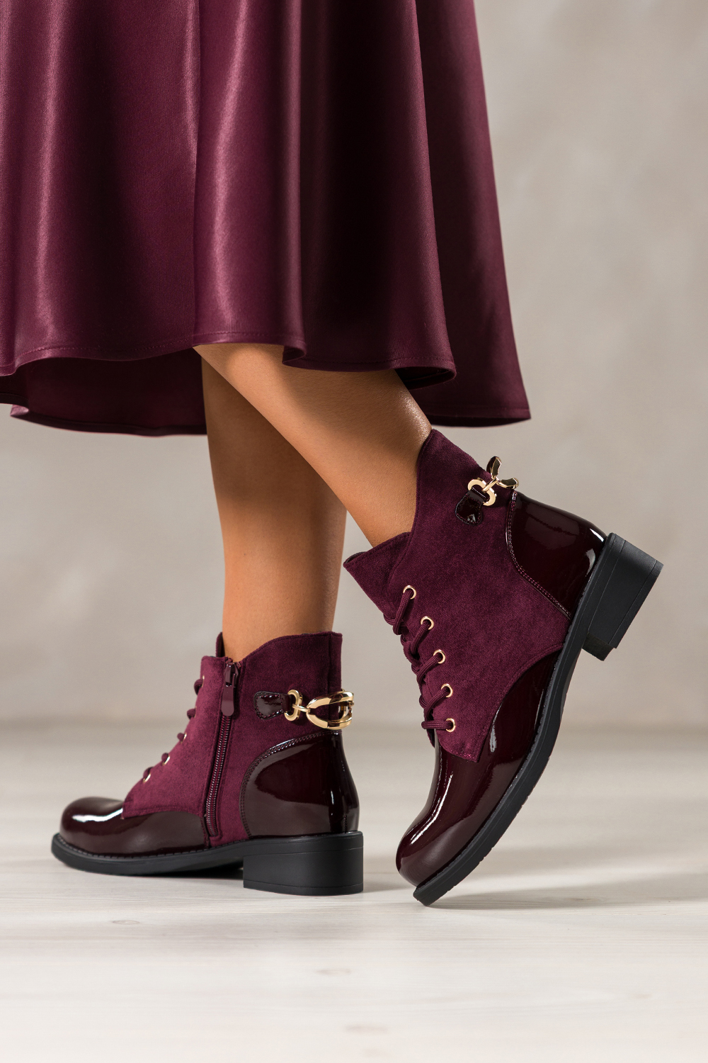 Bordowe botki damskie lakierowane na niskim klocku zamszowe wstawki złota ozdoba sznurowane Casu model NW2397-6, to kwintesencja elegancji i komfortu w jesienno-zimowym wydaniu. Wykonane z wysokogatunkowej lakierowanej skóry ekologicznej, zachwycają nie tylko intensywnym kolorem, ale i perfekcyjnym wykonaniem. Delikatne futerko wewnątrz zapewnia przyjemne ciepło, a szeroki, stabilny obcas typu klocek gwarantuje komfort nawet podczas całodziennego noszenia. Każdy detal został dopracowany z myślą o kobietach ceniących jakość i styl. Model łączy klasyczną formę z wyrazistym, nowoczesnym akcentem. Zamszowe wstawki subtelnie kontrastują z połyskującym lakierem, tworząc intrygujące połączenie tekstur. Złota ozdoba nadaje botkom wyjątkowego charakteru, dodając im nuty luksusu. Zaokrąglony nosek sprawia, że buty są nie tylko stylowe, ale i wygodne, a dodatkowe bordowe sznurówki i praktyczny zamek pozwalają na szybkie i łatwe zakładanie. To doskonały wybór do stylizacji casualowych i eleganckich. Sprawdzą się doskonale w chłodniejsze dni, zarówno do pracy, na zakupy, jak i na wieczorne wyjścia. Dzięki połączeniu klasyki i nowoczesności, pasują do jeansów, sukienek, spódnic i eleganckich płaszczy. To inwestycja w komfort i styl, który zostanie z Tobą na dłużej. Cechy wyróżniające Wysokogatunkowa lakierowana skóra ekologiczna Miękkie, ocieplane wnętrze z delikatnym futerkiem Złota ozdoba i zamszowe wstawki dla wyjątkowego wyglądu Szeroki, niski obcas typu klocek Praktyczne sznurowanie i zamek boczny Stylowy bordowy kolor idealny na sezon jesień-zima Ten model to perfekcyjna propozycja dla kobiet, które chcą wyglądać olśniewająco każdego dnia. Zamów online na stronie Casu i poczuj różnicę w jakości oraz stylu już od pierwszego założenia!