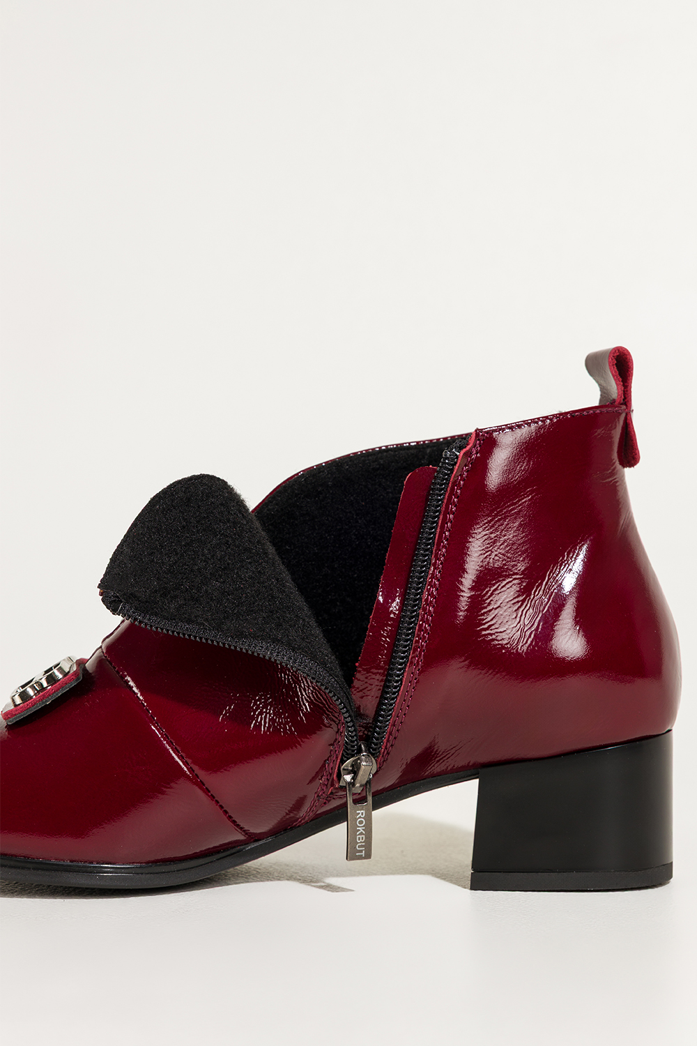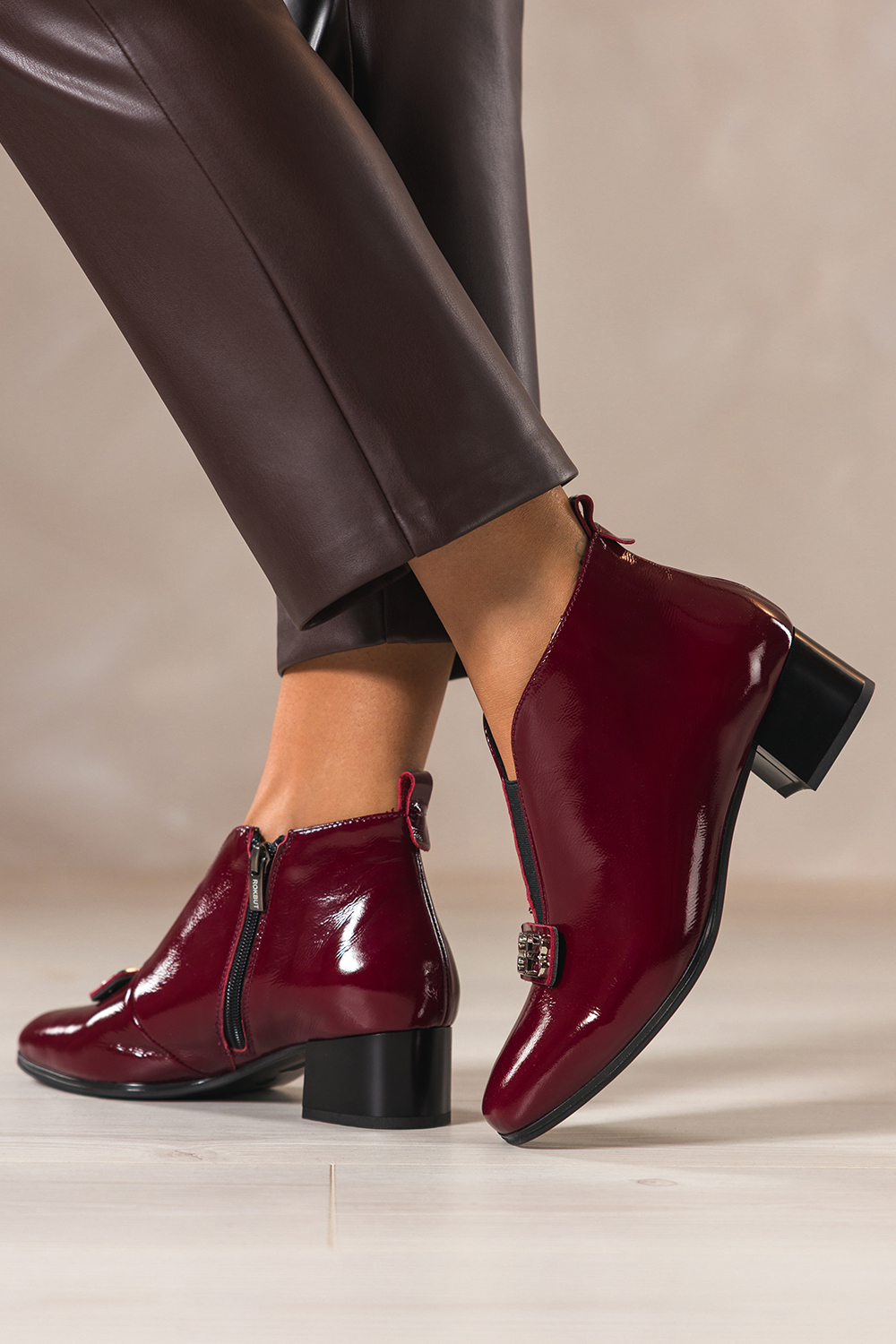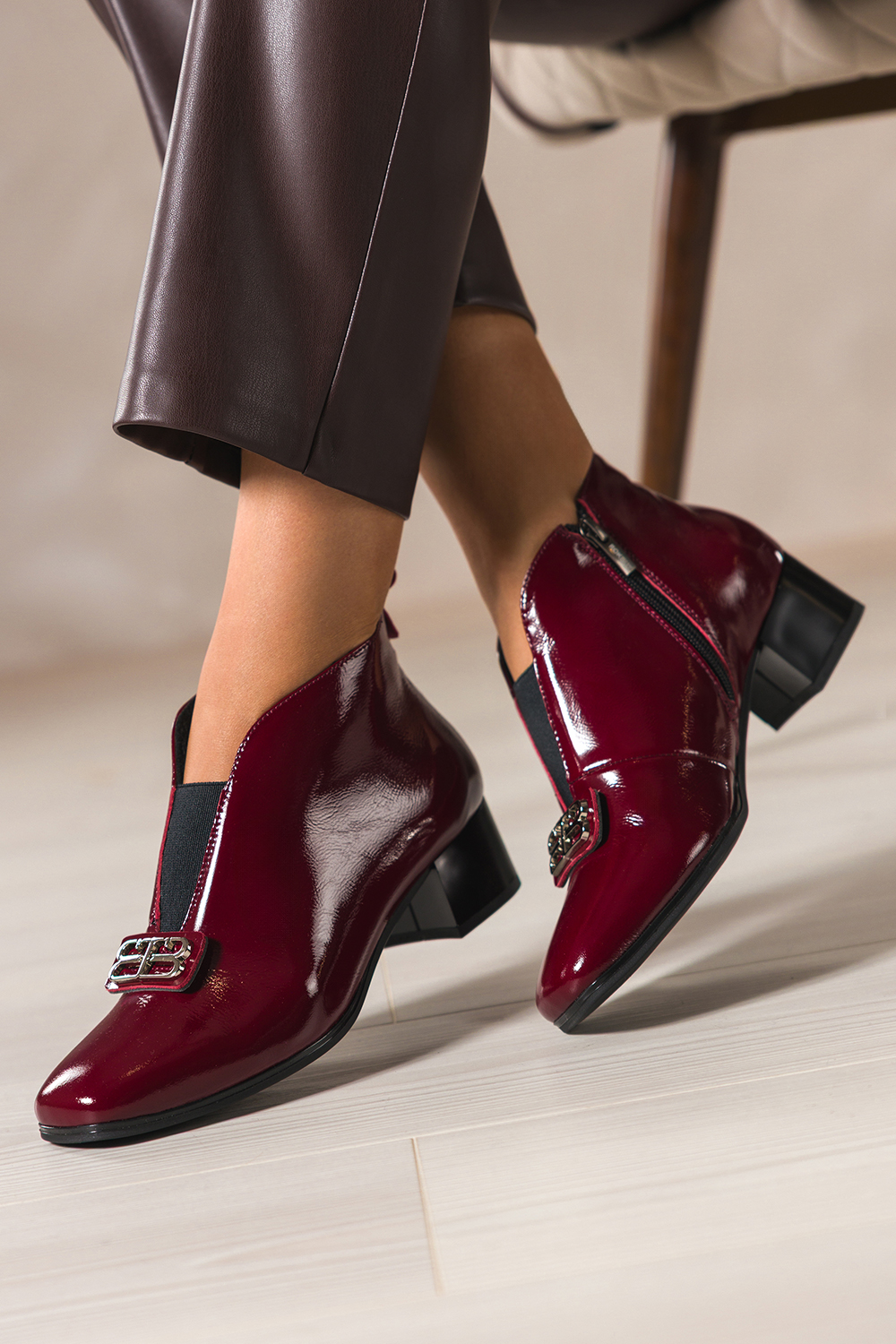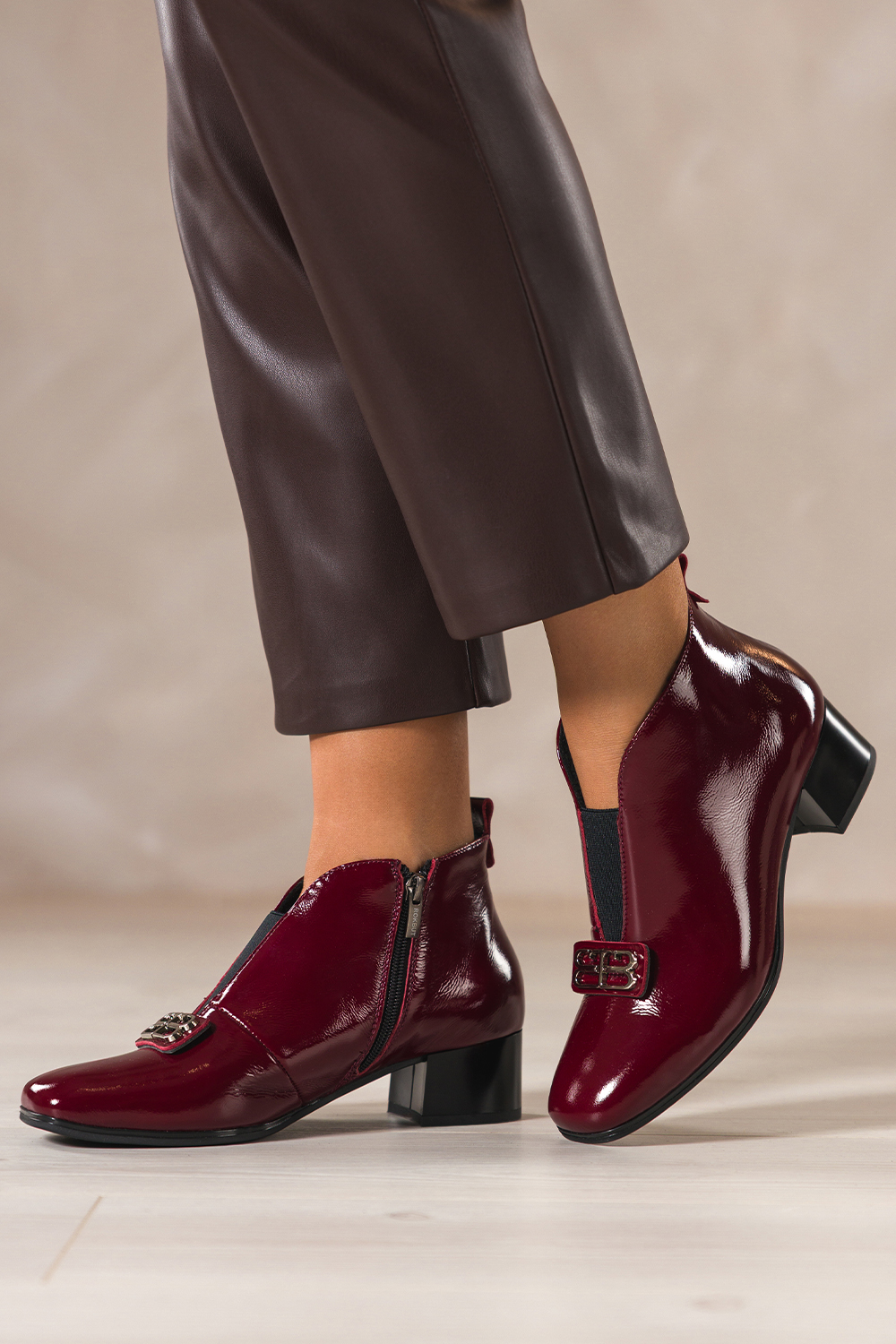 Bordowe botki skórzane damskie lakierowane obcas klocek elastyczna guma na przodzie srebrna ozdoba