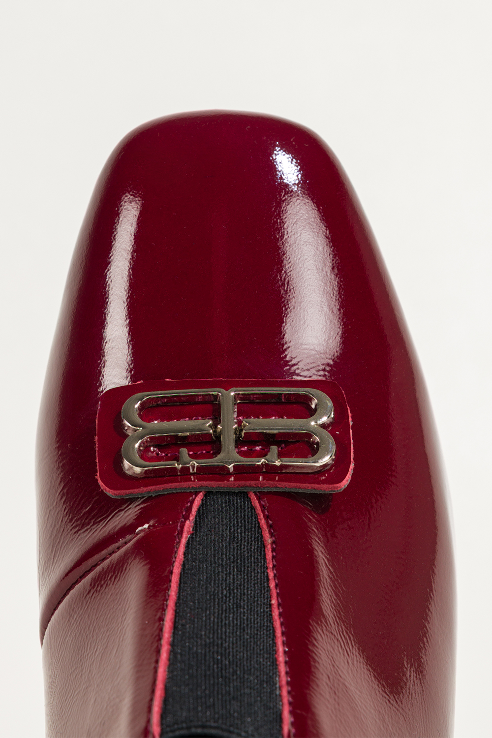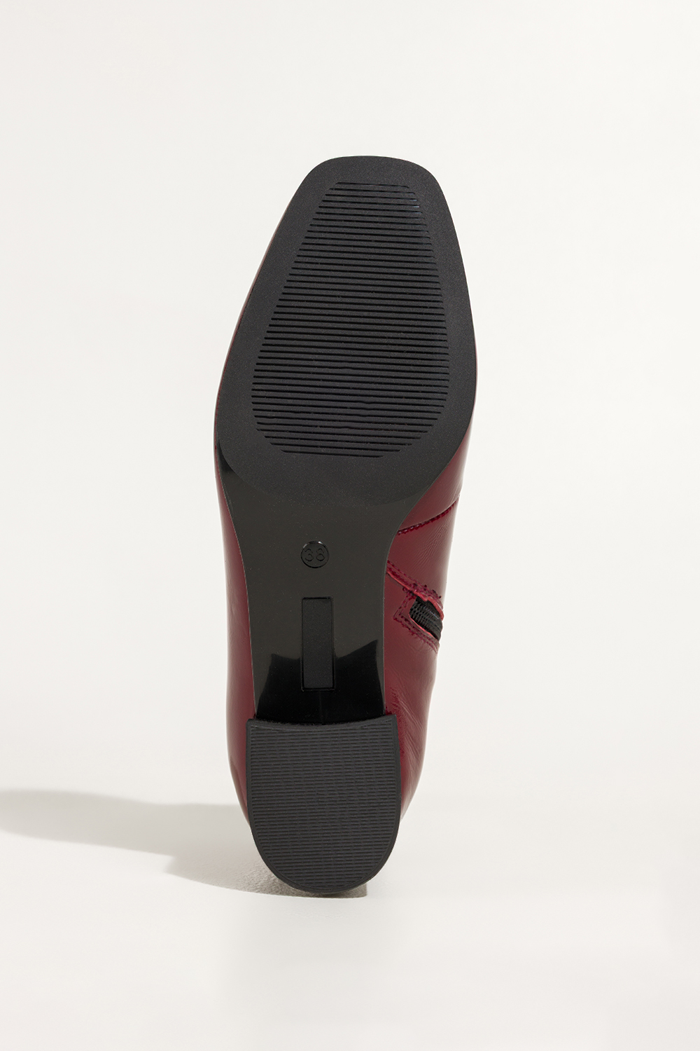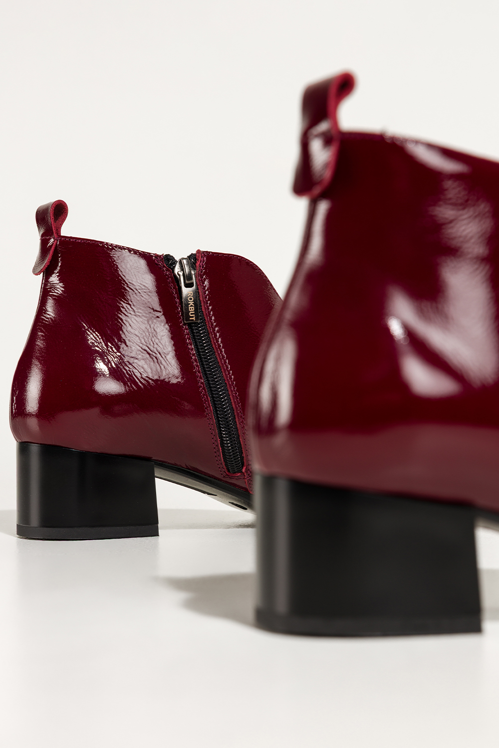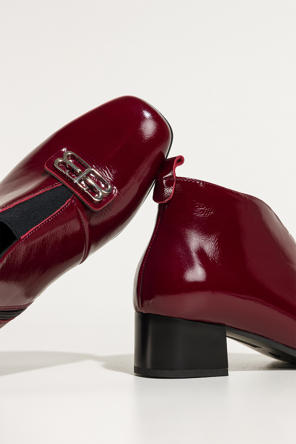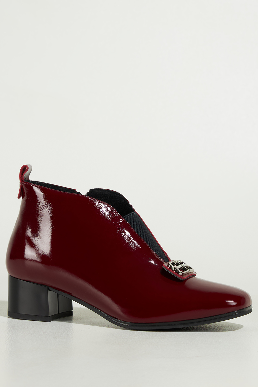 Bordowe botki skórzane damskie lakierowane obcas klocek elastyczna guma na przodzie srebrna ozdoba