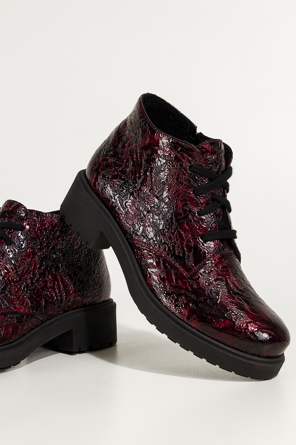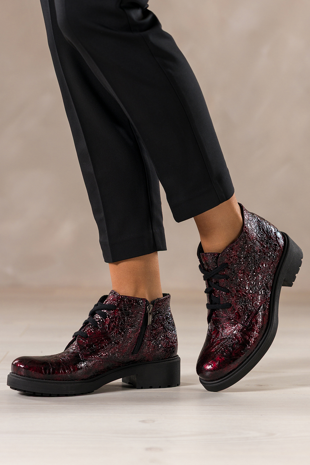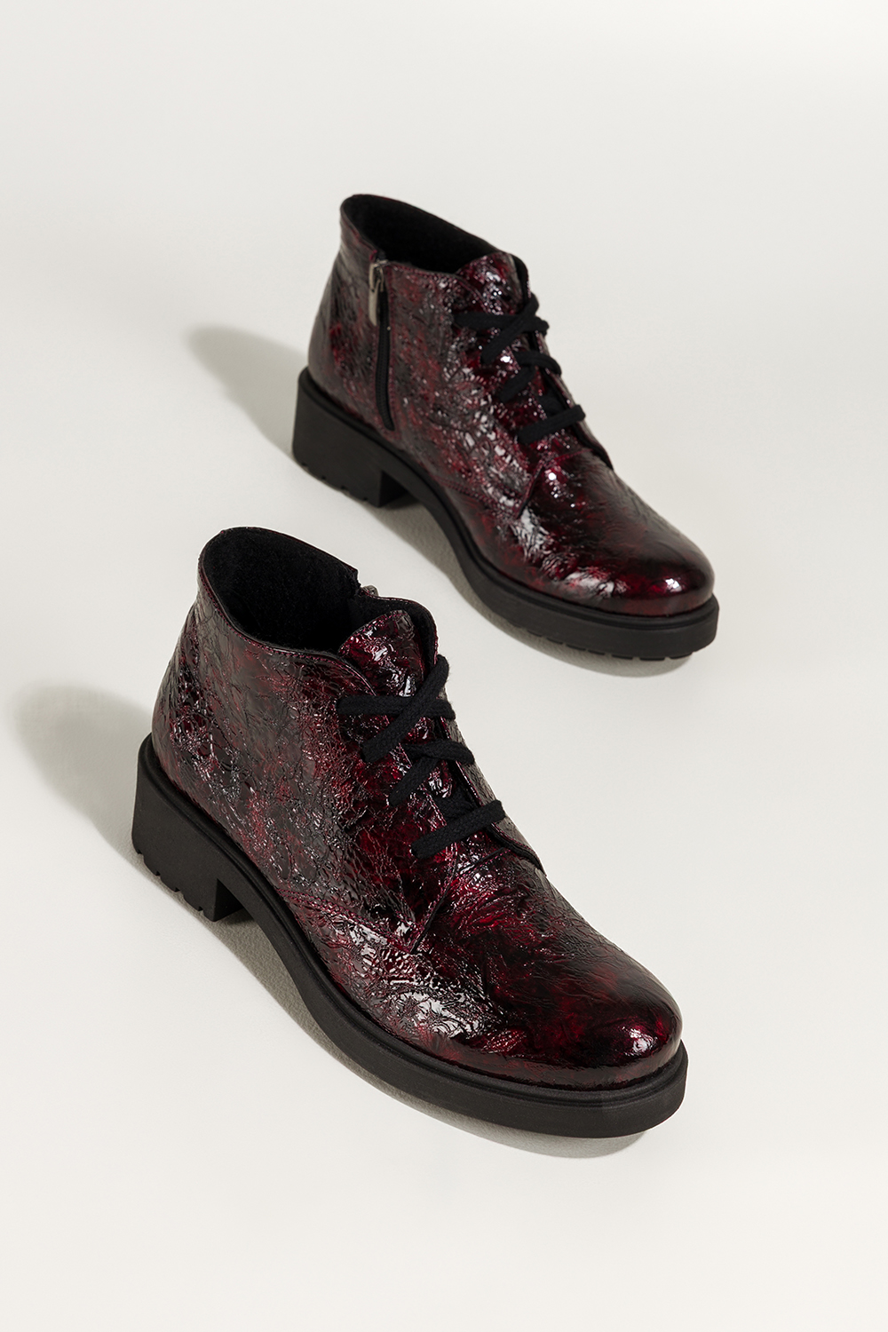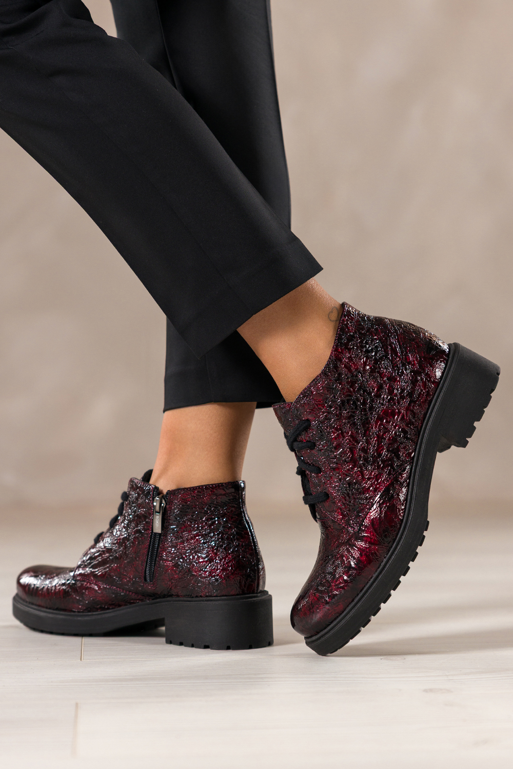 Bordowe botki skórzane damskie lakierowane z wzorem sznurowane PRODUKT POLSKI Casu model 444, to połączenie precyzji rzemiosła z wyrazistym stylem. Wykonane z wysokogatunkowej skóry lakierowanej, zachwycają głębokim połyskiem i unikalnym tłoczonym wzorem, który dodaje im charakteru. Solidna konstrukcja, dbałość o detale oraz ocieplenie kocem obuwniczym sprawiają, że są to buty idealne na chłodniejsze dni. Unikalna barwa doskonale komponuje się z jesienno-zimowymi stylizacjami, podkreślając indywidualny charakter właścicielki. Zaokrąglony nosek i niski obcas typu klocek gwarantują komfort nawet podczas całodniowego noszenia, a klasyczne sznurowanie połączone z bocznym zamkiem ułatwia zakładanie. To idealne uzupełnienie zarówno miejskich, jak i bardziej eleganckich outfitów. Dzięki swojej uniwersalności, świetnie sprawdzą się zarówno do pracy, jak i na wieczorne wyjście czy weekendowy spacer. Polski producent zadbał o to, by obuwie nie tylko pięknie się prezentowało, ale też służyło na co dzień, niezawodnie, modnie i wygodnie. Cechy wyróżniające Wysokogatunkowa lakierowana skóra naturalna z tłoczonym wzorem Ocieplenie miękkim kocem obuwniczym Niski, stabilny obcas typu klocek Podwójne zapięcie: sznurówki i zamek Produkcja polska, gwarancja jakości Uniwersalna, głęboka bordowa kolorystyka Nie pozwól, aby ten wyjątkowy model Cię ominął. Postaw na modne, trwałe i wygodne obuwie dostępne już teraz na stronie Casu i dodaj swojej garderobie nutę eleganckiej oryginalności! Obuwie ma zawyżoną rozmiarówkę, dlatego przed zakupem prosimy o dokładne zapoznanie się z tabelą rozmiarów, aby dobrać idealny rozmiar.