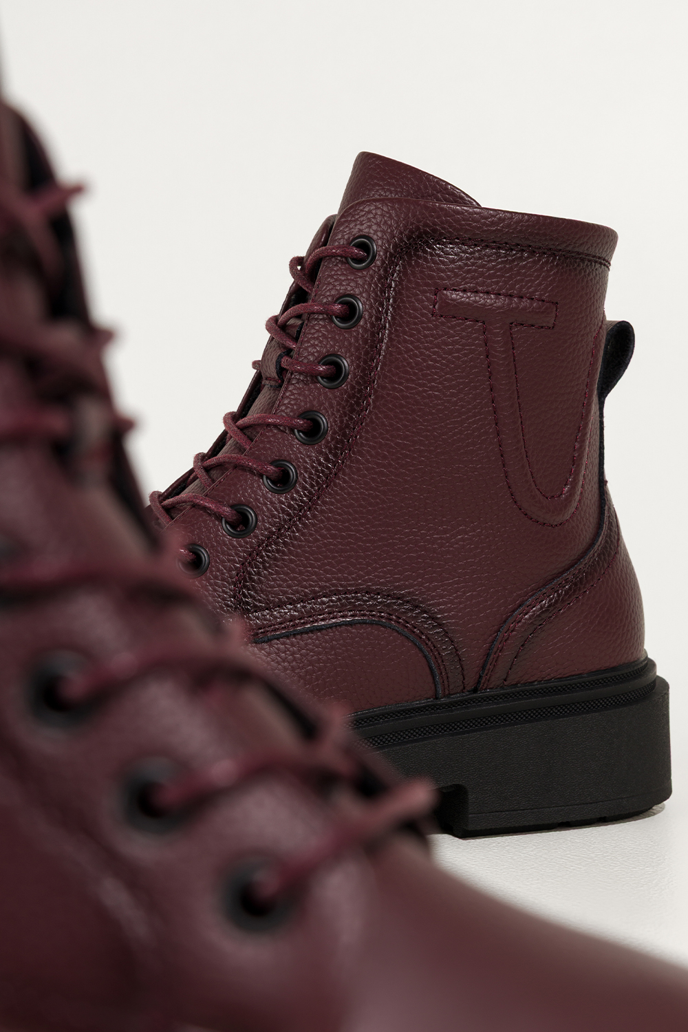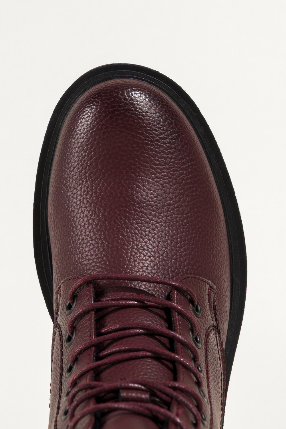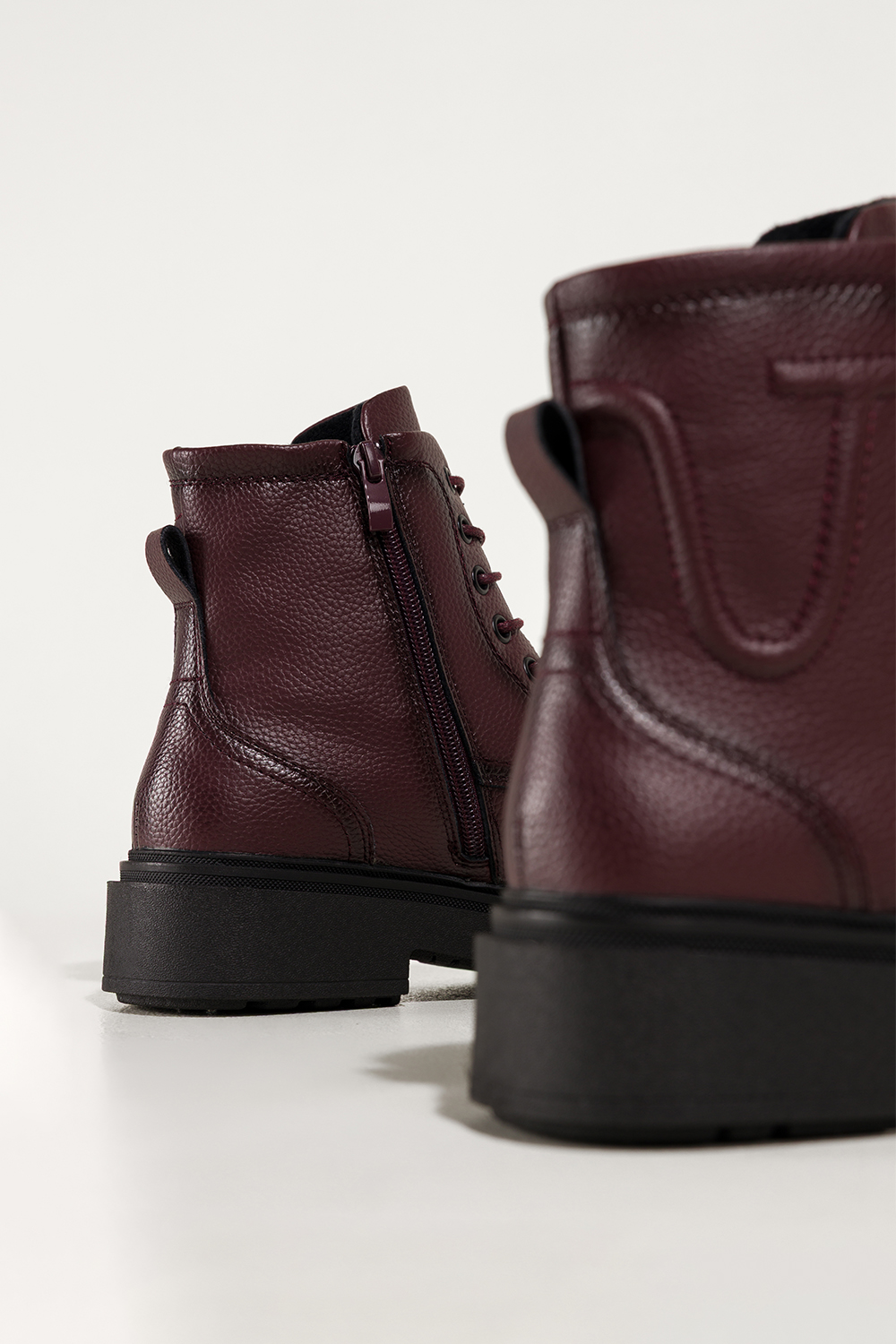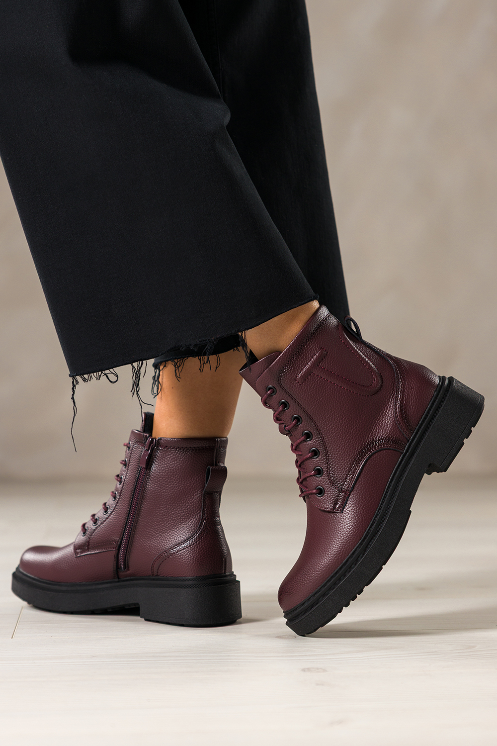 Bordowe botki skórzane damskie Sergio Leone na czarnej żłobionej platformie ozdobne przeszycia na c