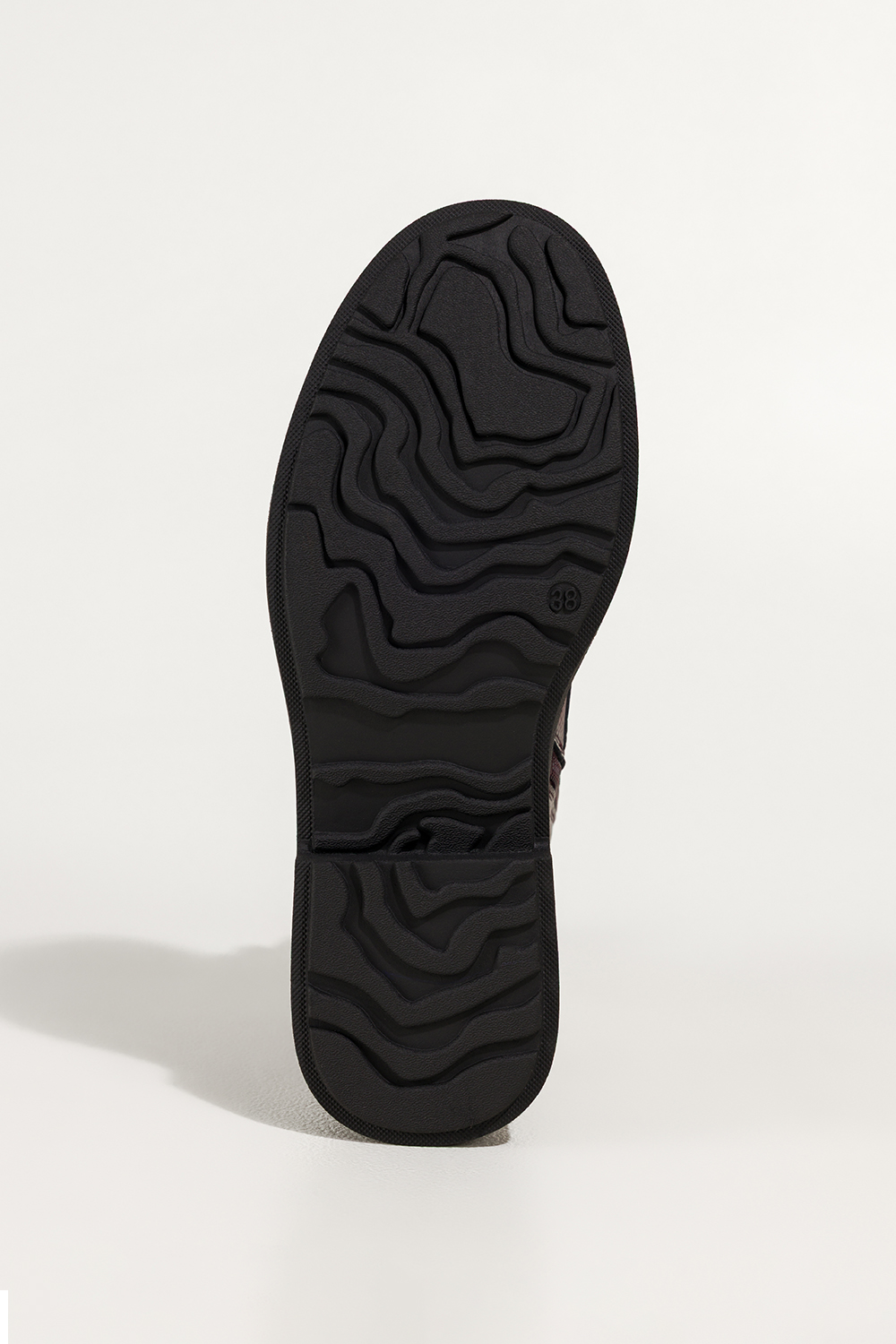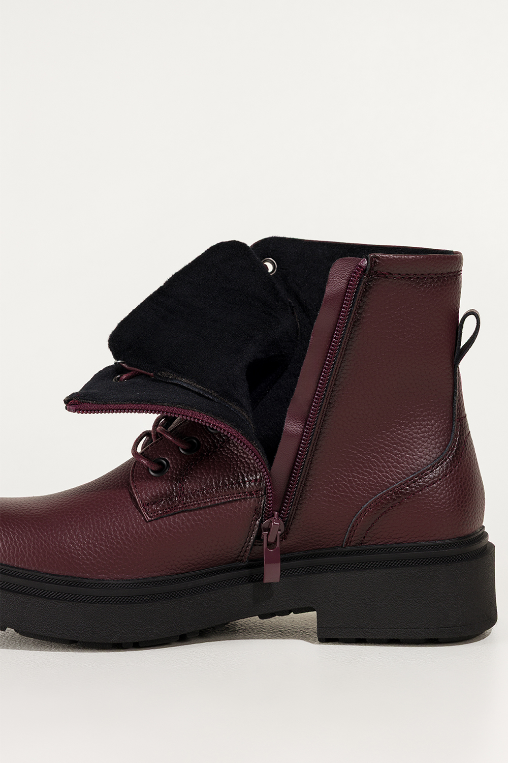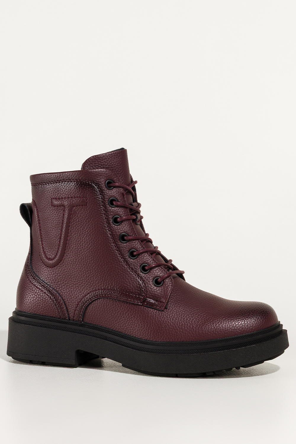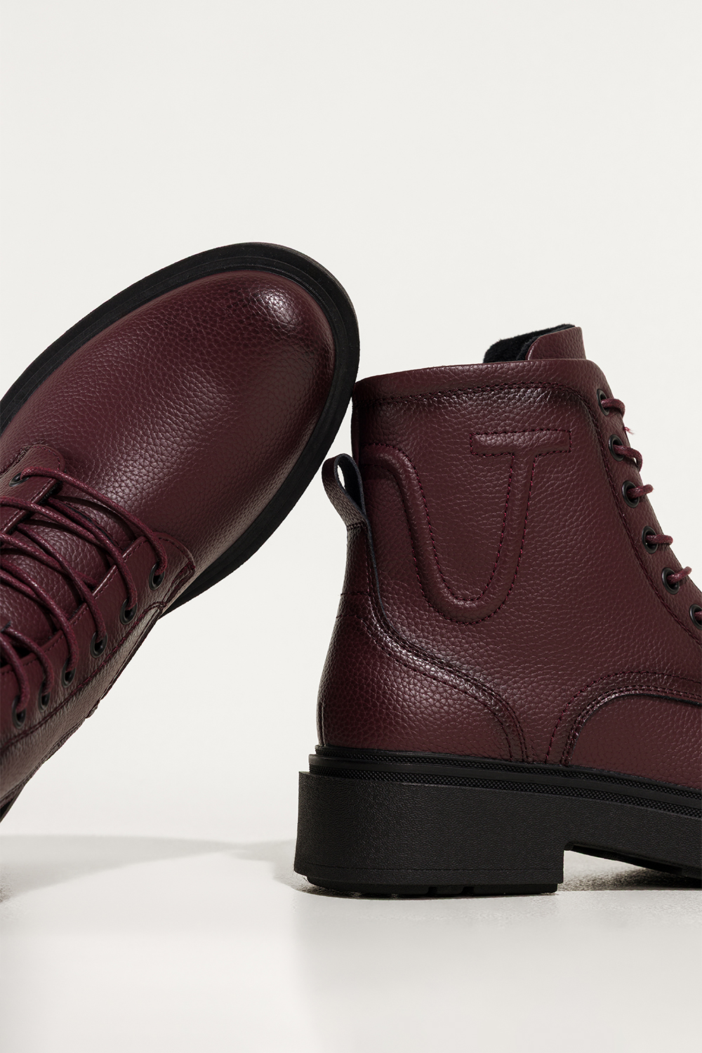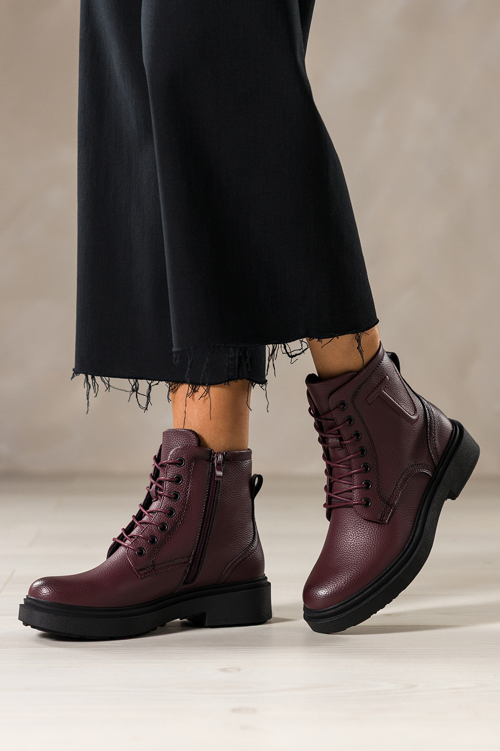 Bordowe botki skórzane damskie Sergio Leone na czarnej żłobionej platformie ozdobne przeszycia na c