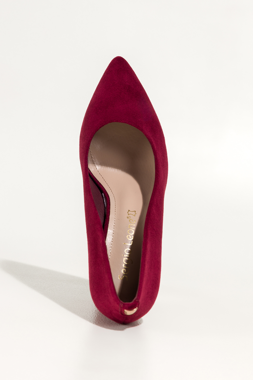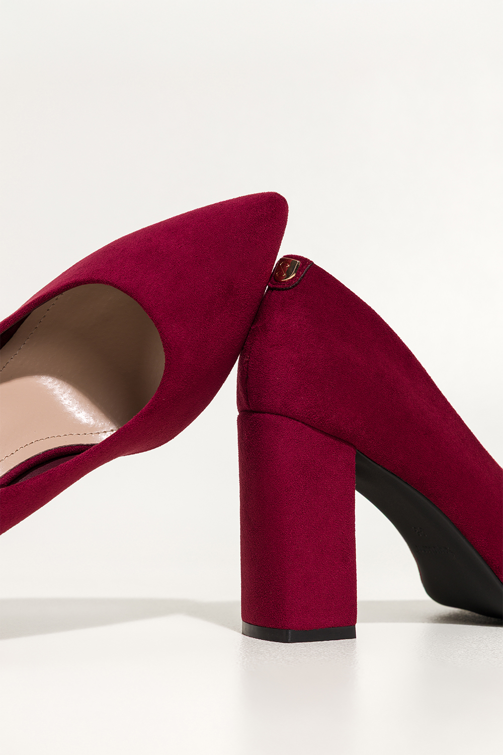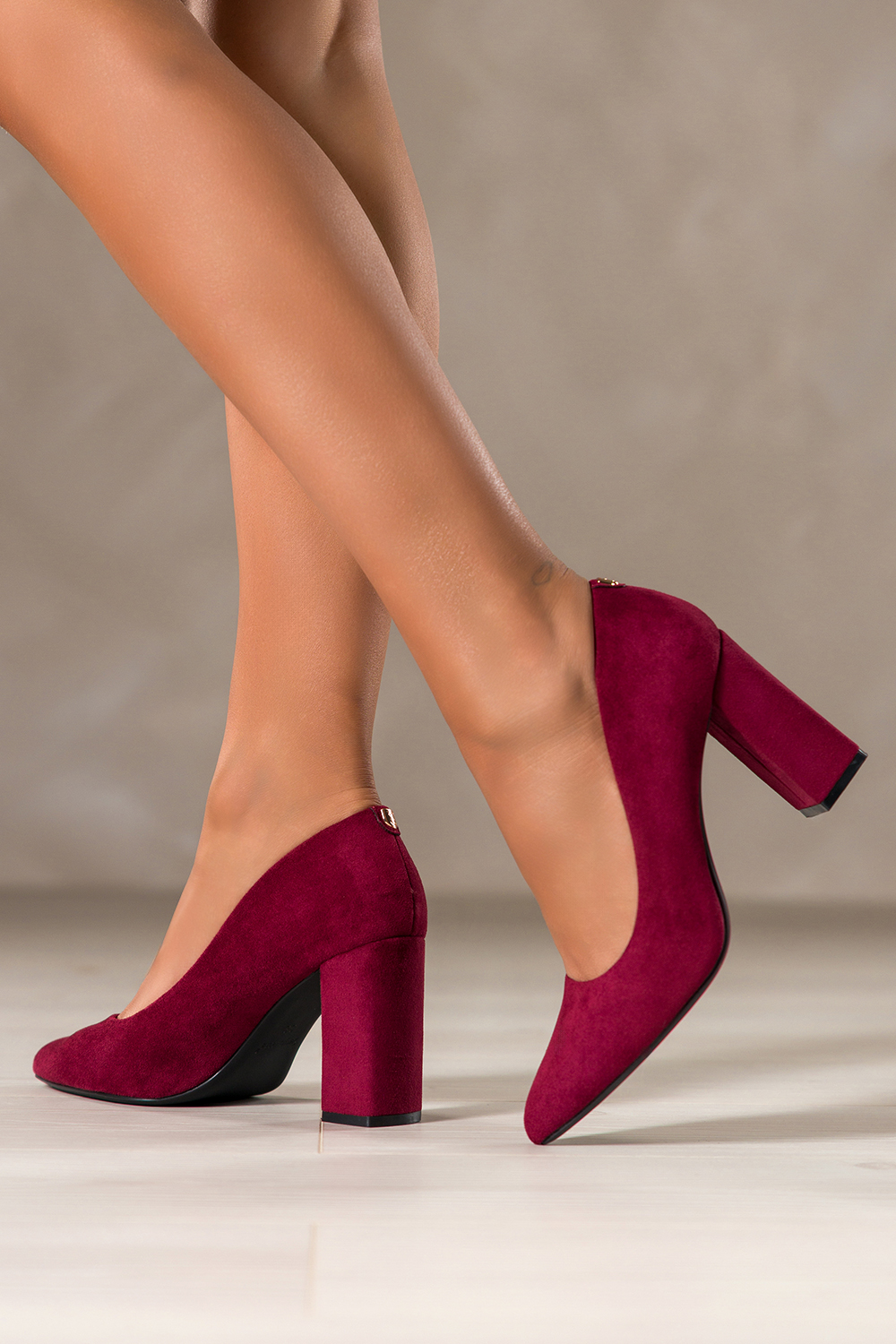 Bordowe czółenka damskie Sergio Leone obcas słupek skórzana wkładka złota ozdoba na pięcie KY783