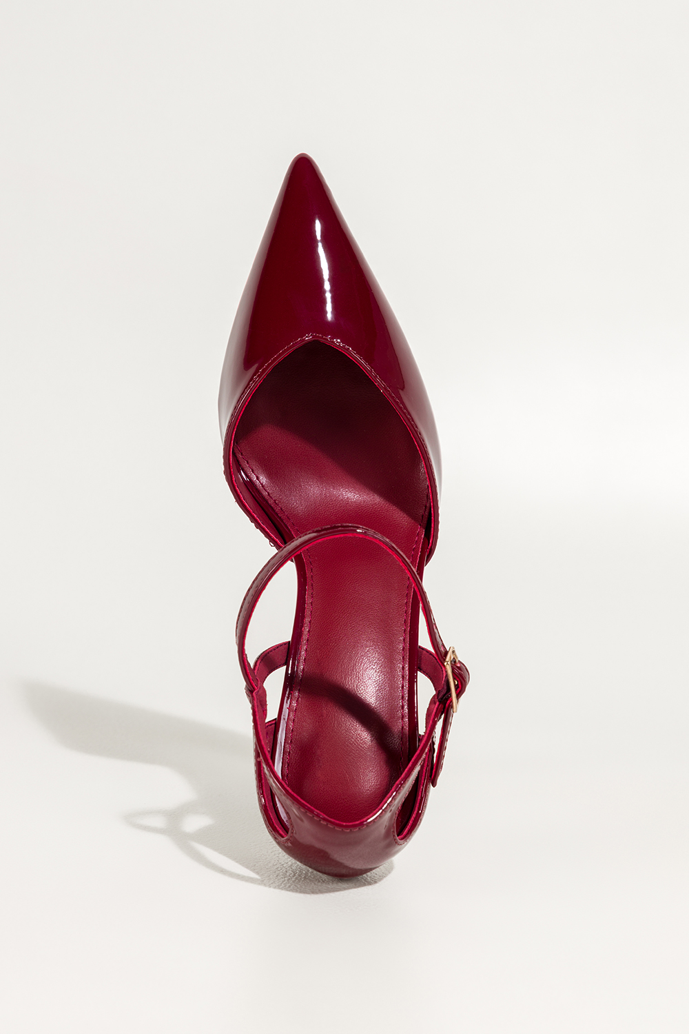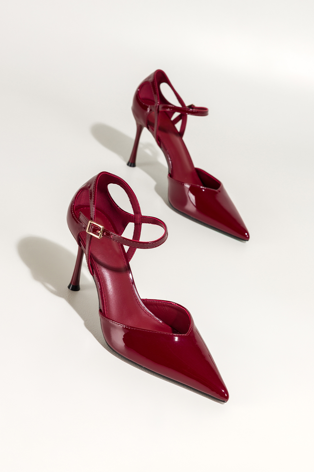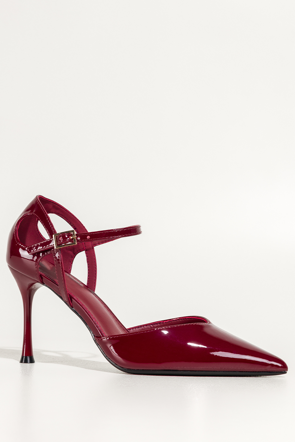 Bordowe czółenka damskie lakierowane szpilki wycięcia na cholewce pasek wokół kostki Carla 641-8