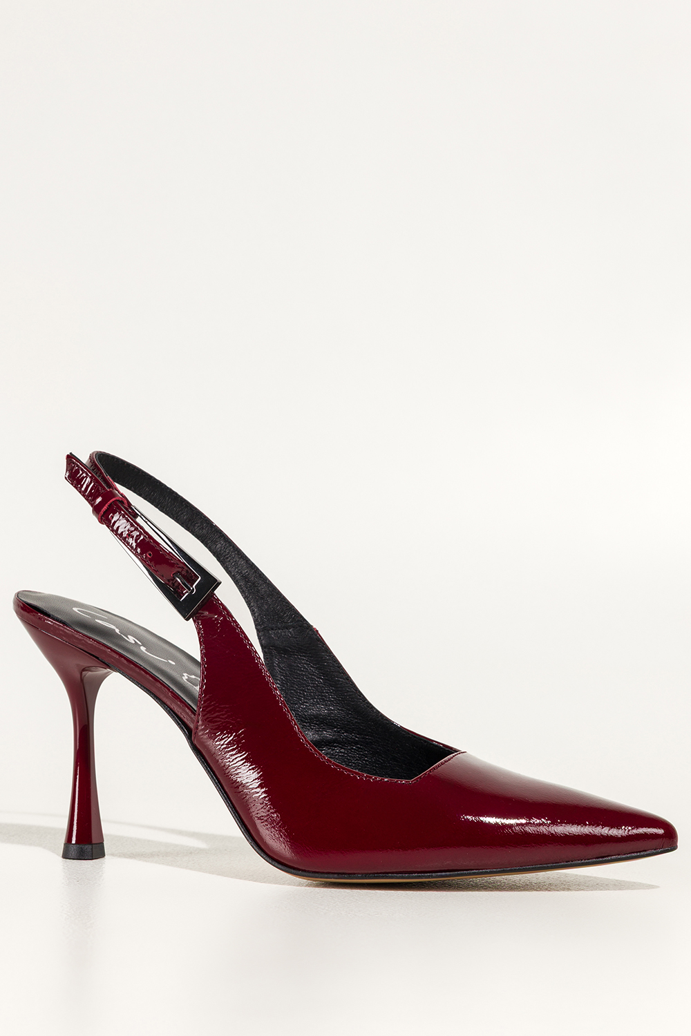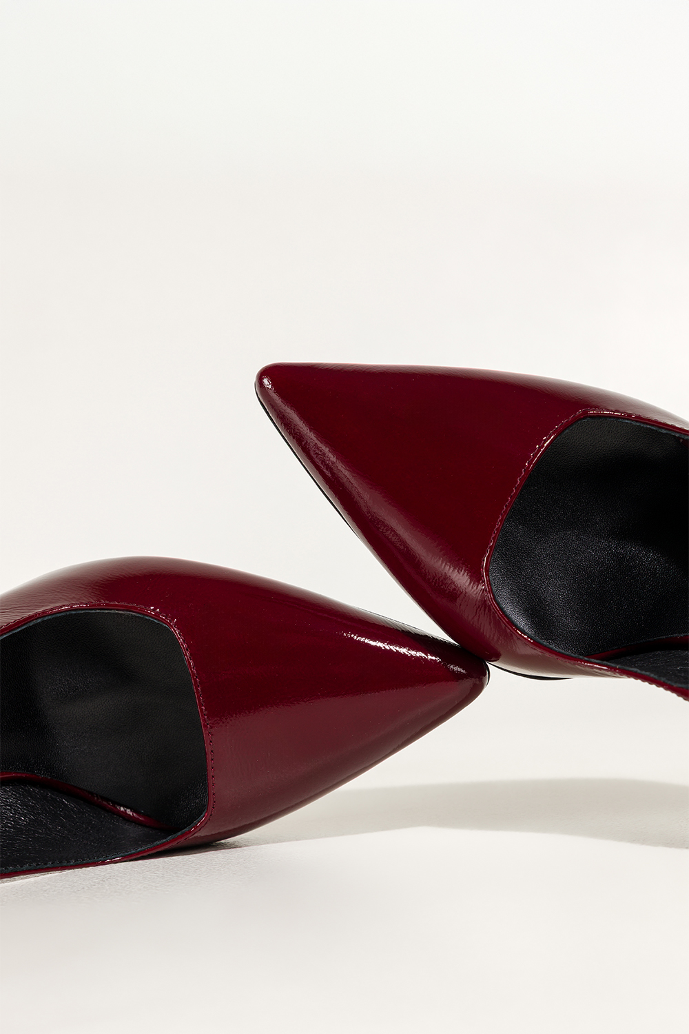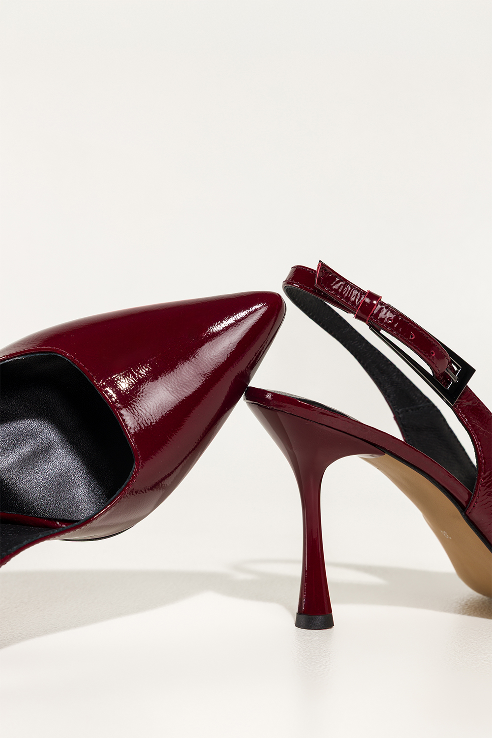 Bordowe czółenka skórzane damskie szpilki lakierowane z odkrytą piętą obcas kieliszek PRODUKT POLSK