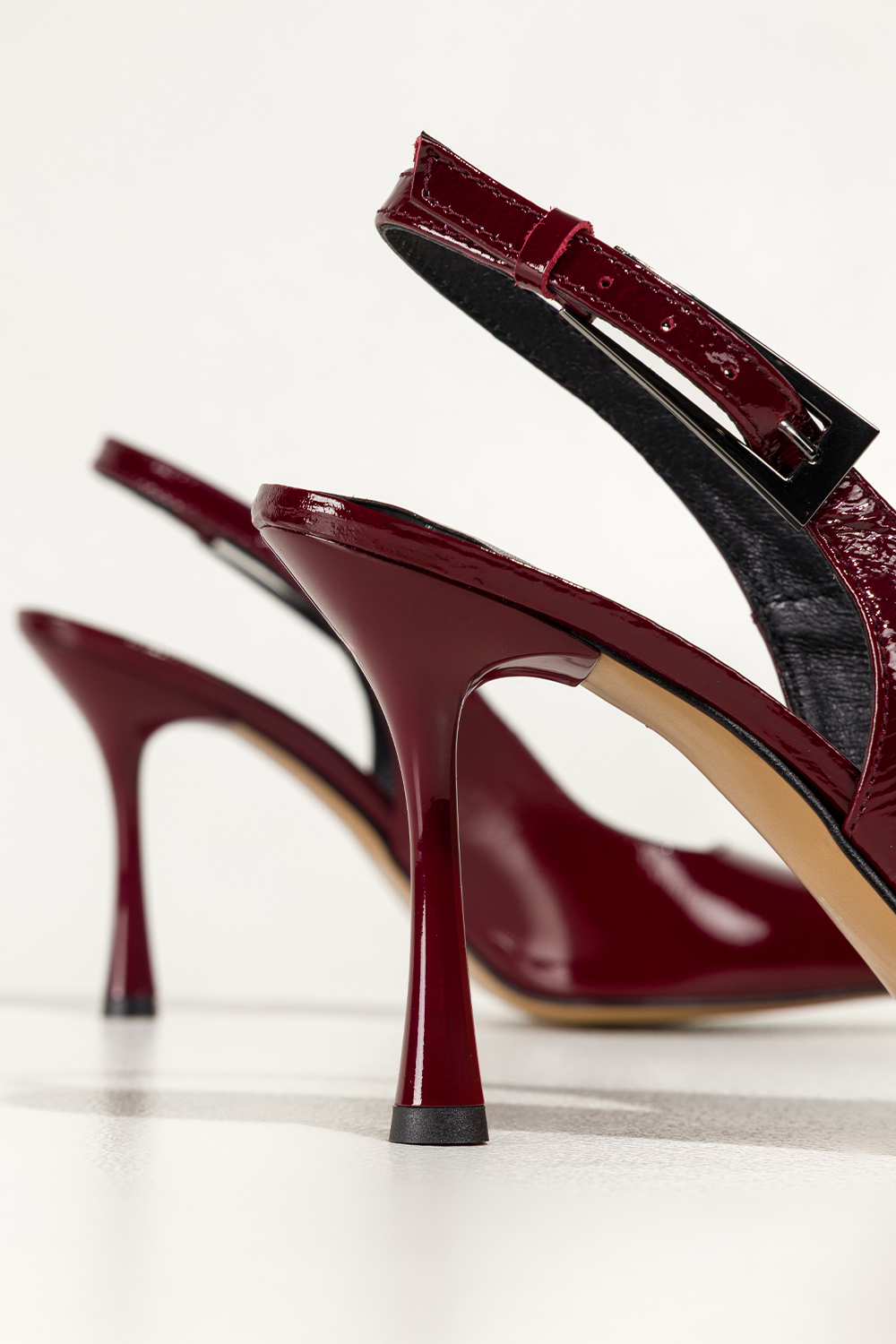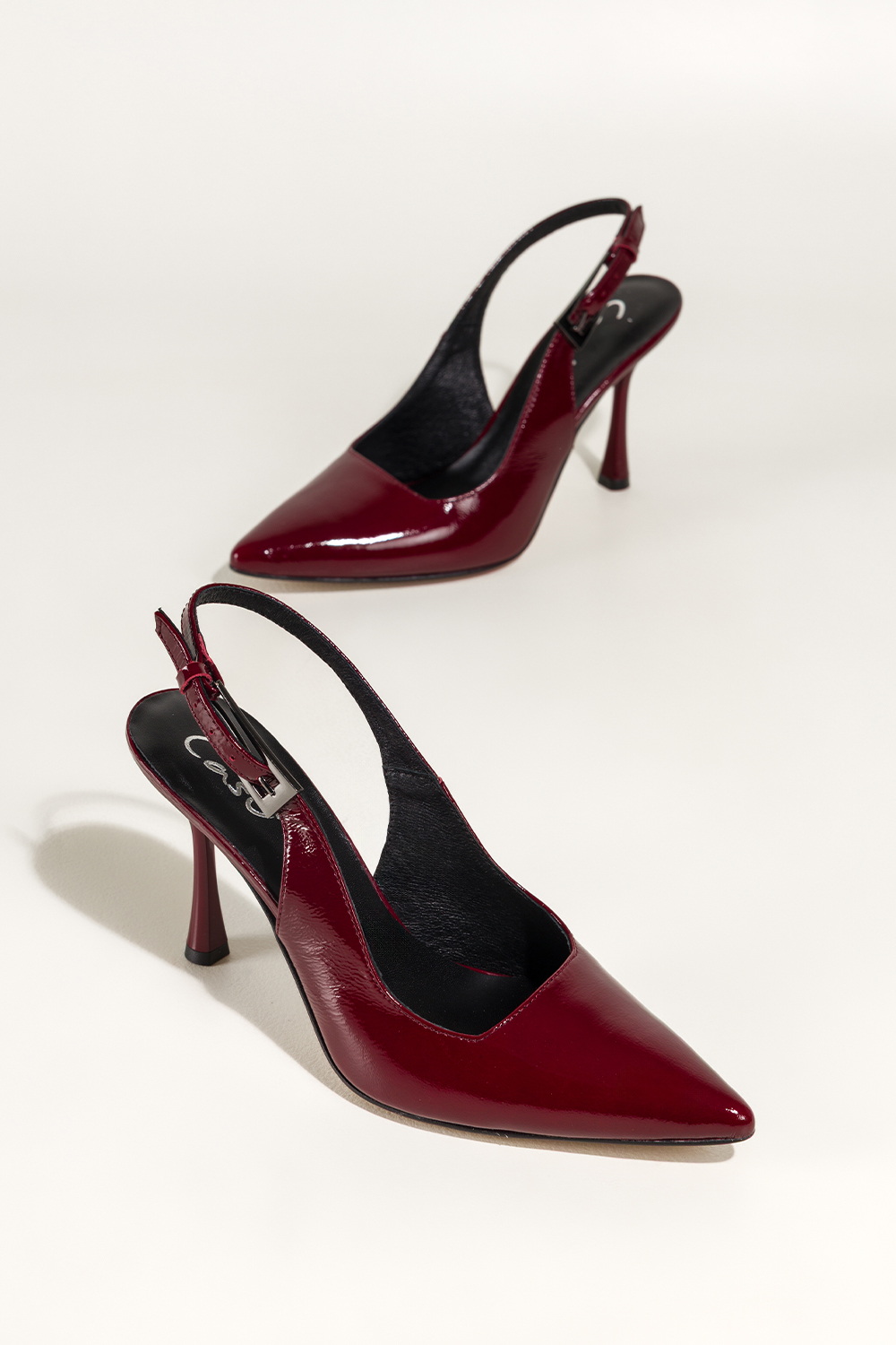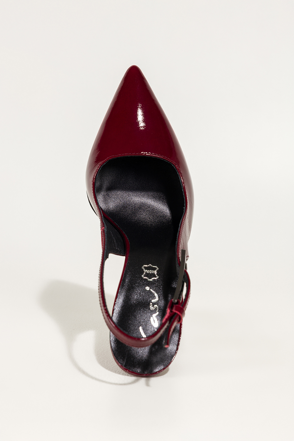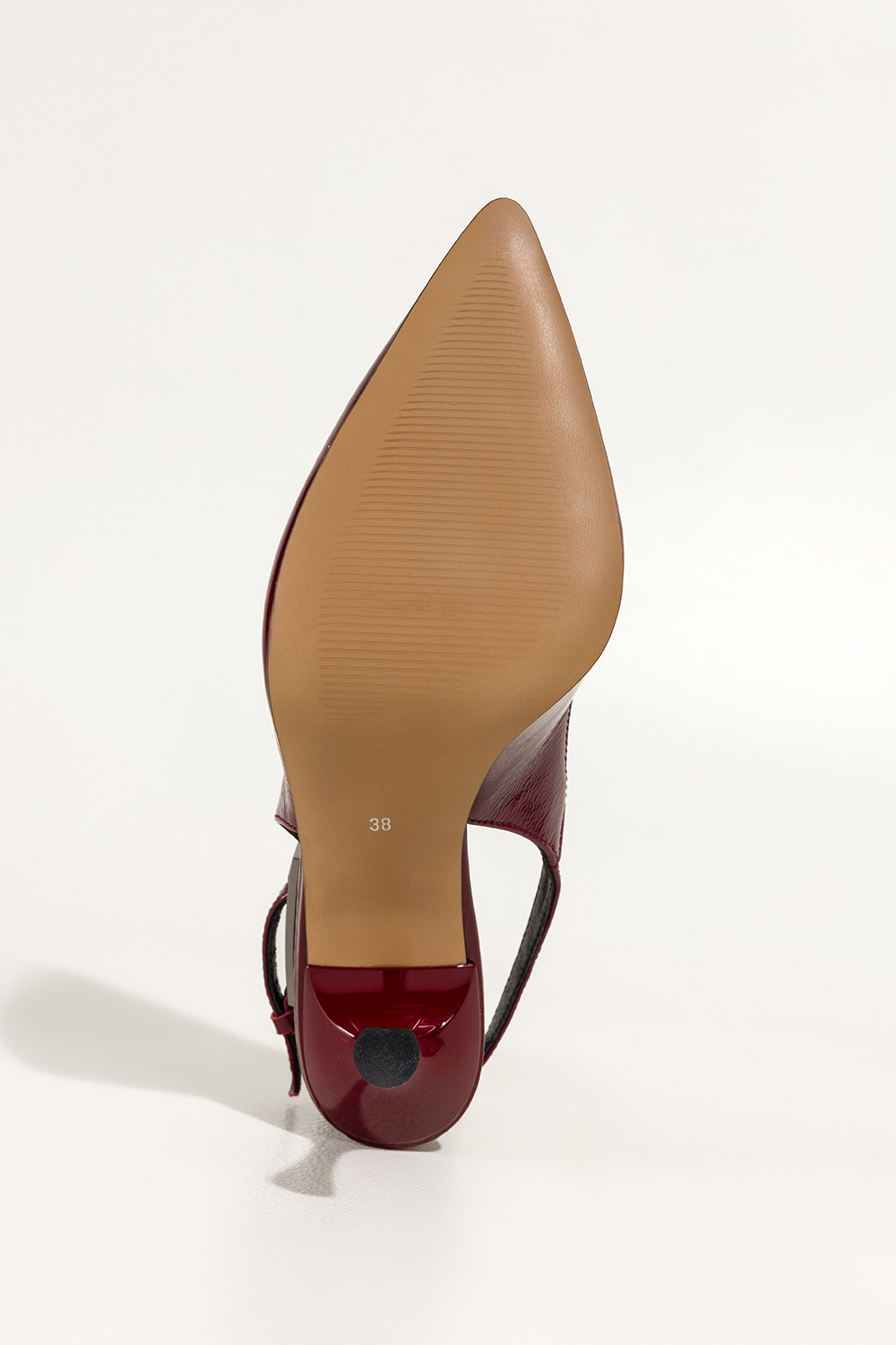 Bordowe czółenka skórzane damskie szpilki lakierowane z odkrytą piętą obcas kieliszek PRODUKT POLSK