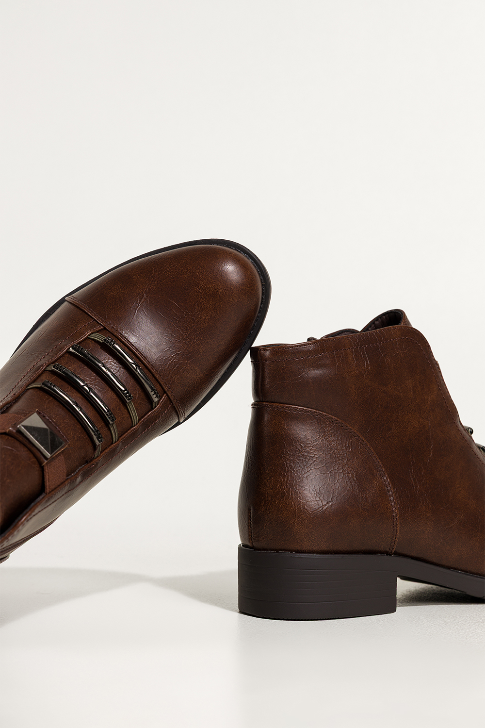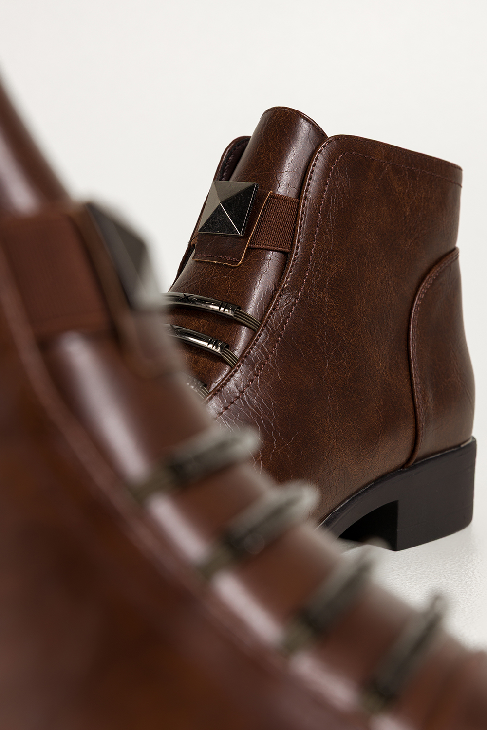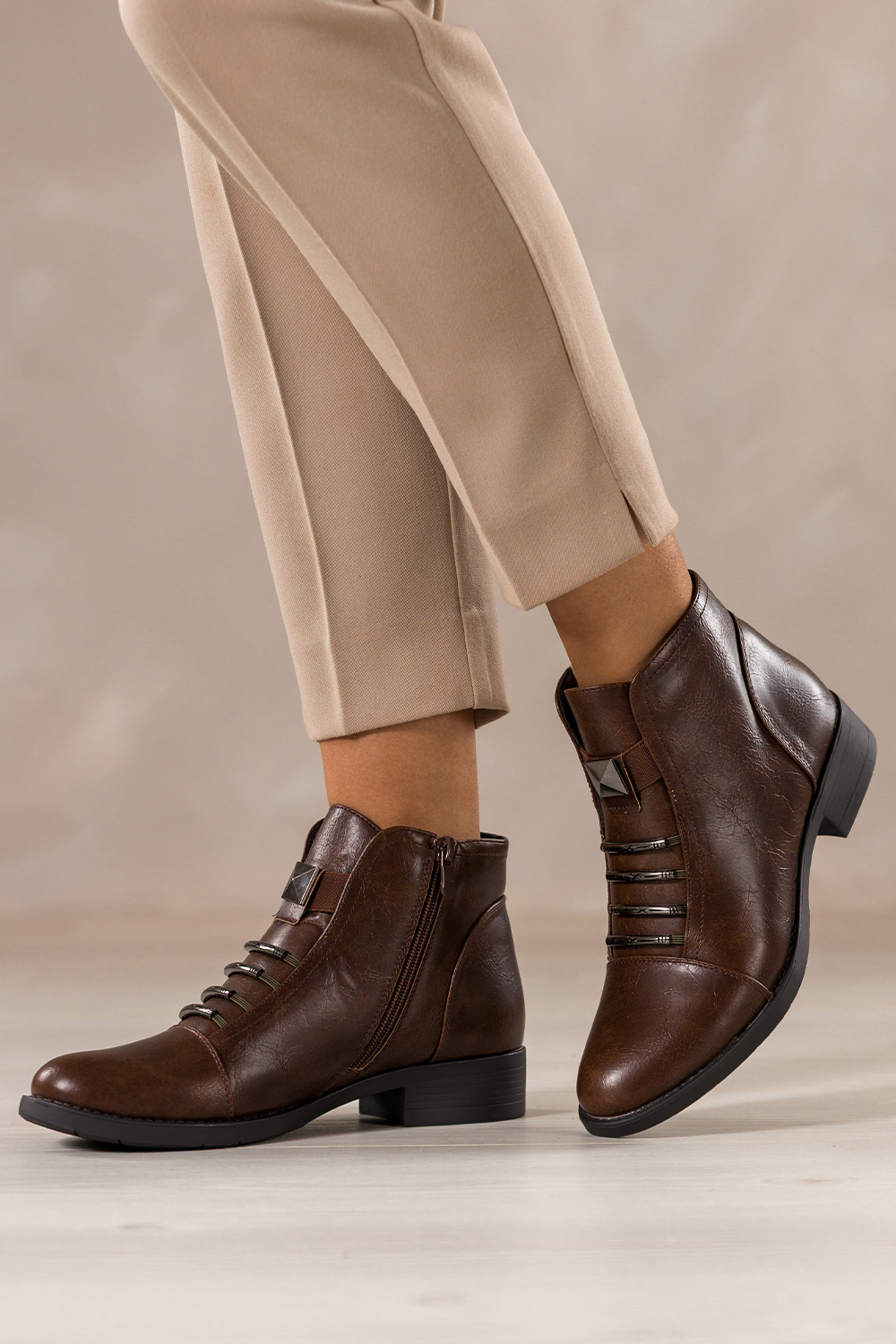 Brązowe botki damskie na szerokim niskim klocku ze stalowymi ozdobami Carla model Y-6-8636, to doskonały wybór dla kobiet ceniących ponadczasową elegancję. Wykonane z wysokogatunkowej skóry ekologicznej, zachwycają miękkością, solidnym wykończeniem i ocieplanym wnętrzem z futerkiem, które gwarantuje ciepło nawet w najchłodniejsze dni. Zaokrąglony nosek oraz wygodna, płaska podeszwa z niskim klockiem zapewniają stabilność i wygodę przez cały dzień. Brązowy kolor świetnie komponuje się z jesiennymi i zimowymi stylizacjami, a stalowe ozdoby i elastyczna wstawka z przodu nadają botkom unikalny, lekko rockowy charakter. Zamek błyskawiczny ułatwia zakładanie, a przemyślany krój doskonale dopasowuje się do nogi, dodając jej smukłości. To idealny wybór zarówno do spodni, jak i sukienek, doskonale sprawdzający się w pracy, na spacerze czy wieczornym spotkaniu. Dzięki uniwersalnemu fasonowi, świetnie odnajdują się w różnych stylizacjach i okazjach, od casualowych po bardziej eleganckie. Ocieplenie sprawia, że idealnie nadają się na sezon jesienno-zimowy, a ich stonowany, ale wyrazisty design przyciąga uwagę i podkreśla indywidualny styl. Ich przemyślana konstrukcja gwarantuje komfort użytkowania przez wiele godzin. Cechy wyróżniające Wysokiej jakości skóra ekologiczna Wnętrze ocieplone miękkim futerkiem Stabilny, szeroki, niski obcas klocek Efektowne stalowe ozdoby i elastyczna wstawka Zaokrąglony nosek i wygodna konstrukcja Łatwe zakładanie dzięki bocznemu zamkowi Połącz styl, jakość i wygodę, wybierz botki od Casu i ciesz się wyjątkowym komfortem każdego dnia. Sprawdź dostępność rozmiarów i zamów już dziś, zanim znikną!