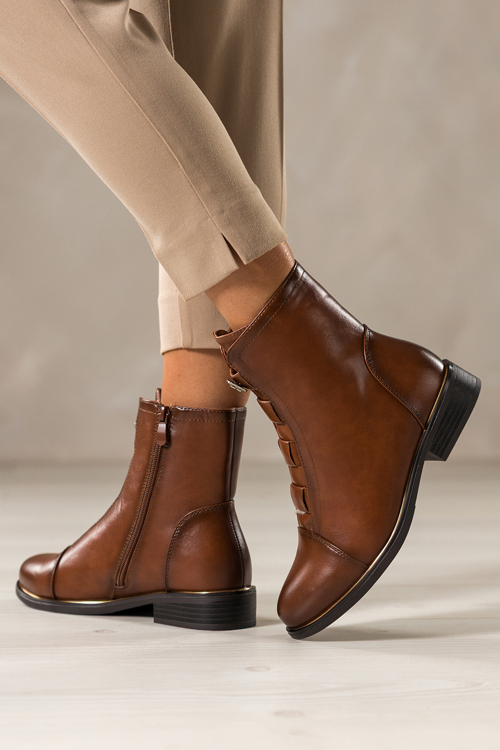Brązowe botki damskie płaskie srebrna ozdoba elastyczne gumy na przodzie Casu model HT-062-7. Wykonane z miękkiej, wysokogatunkowej skóry ekologicznej, zapewniają wygodę noszenia przez cały dzień, a jednocześnie dbają o środowisko. Wnętrze zostało starannie ocieplone delikatnym futerkiem, które otula stopy ciepłem nawet w chłodniejsze dni. Płaska podeszwa ze złotym otokiem oraz niski obcas w formie wygodnego klocka gwarantują stabilność i swobodę ruchu, a zaokrąglony nosek dodaje kobiecego uroku. Zapięcie na zamek i elastyczne gumy umieszczone na przodzie ułatwiają zakładanie i dopasowanie botków do stopy, a srebrna ozdoba w subtelny sposób przełamuje klasykę, dodając nowoczesnego sznytu. Świetnie komponują się zarówno z casualowymi jeansami, jak i bardziej eleganckimi stylizacjami z sukienką czy spódnicą. Te uniwersalne botki damskie sprawdzą się znakomicie zarówno w codziennym użytkowaniu, jak i podczas bardziej formalnych wyjść. Idealne na jesień i zimę, pasują do każdej garderoby, niezależnie od stylu. Szukasz butów, które będą wygodne, modne i praktyczne Ten model to wybór, który spełni wszystkie oczekiwania. Cechy wyróżniające Wysokogatunkowa skóra ekologiczna, trwała i przyjazna dla środowiska Ocieplane wnętrze z miękkim futerkiem, komfort nawet w zimne dni Elastyczne gumy z przodu, łatwe zakładanie i idealne dopasowanie Srebrna ozdoba, subtelny, nowoczesny akcent Niski obcas typu klocek, stabilność i wygoda Uniwersalny kolor, pasuje do wielu stylizacji Zamów już teraz na stronie Casu i przekonaj się, jak doskonale mogą wyglądać i sprawdzać się botki na co dzień. Dzięki połączeniu modnego wyglądu i praktycznych rozwiązań, ten model stanie się Twoim ulubionym wyborem na sezon jesienno-zimowy.