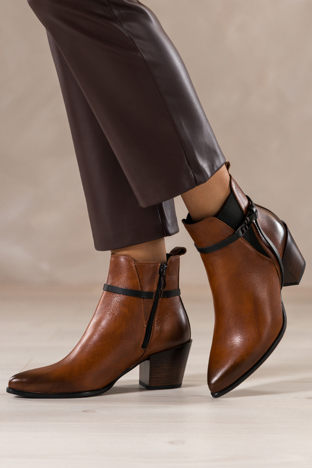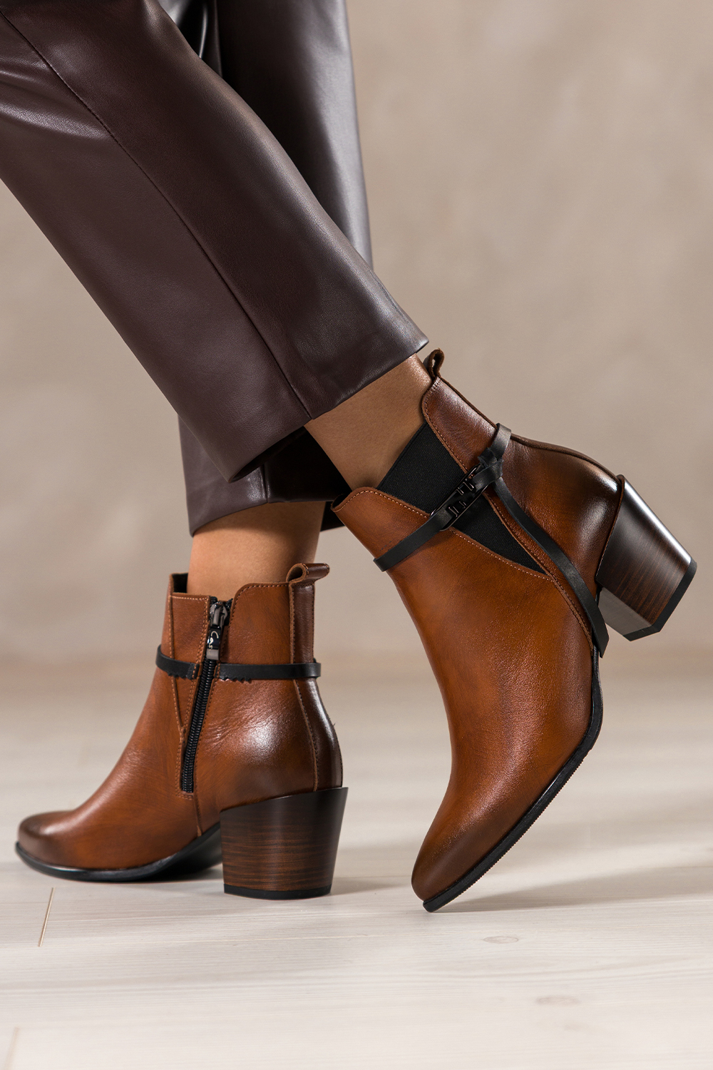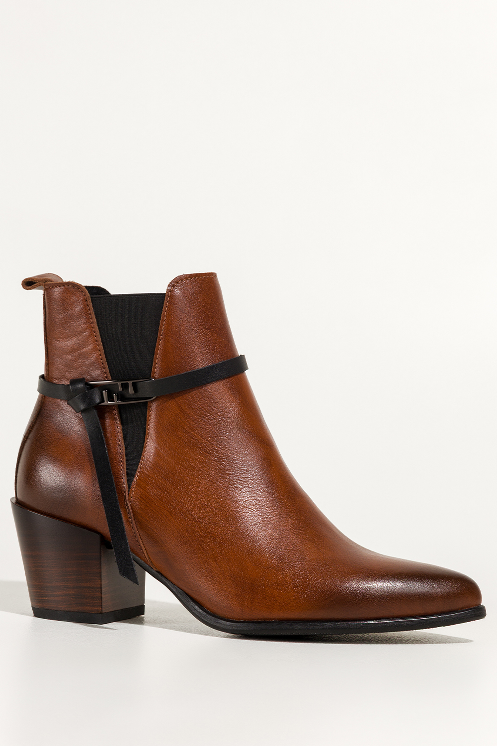 Brązowe botki skórzane damskie kowbojki na ściętym klocku guma w cholewce pasek ze stalową ozdobą P