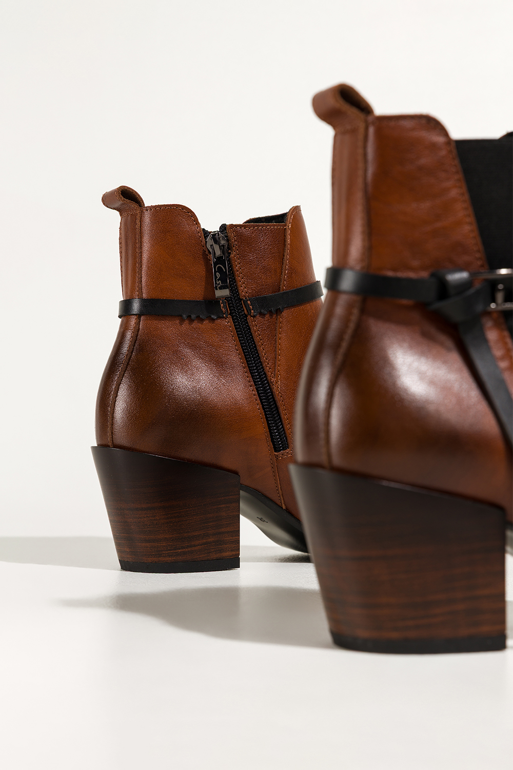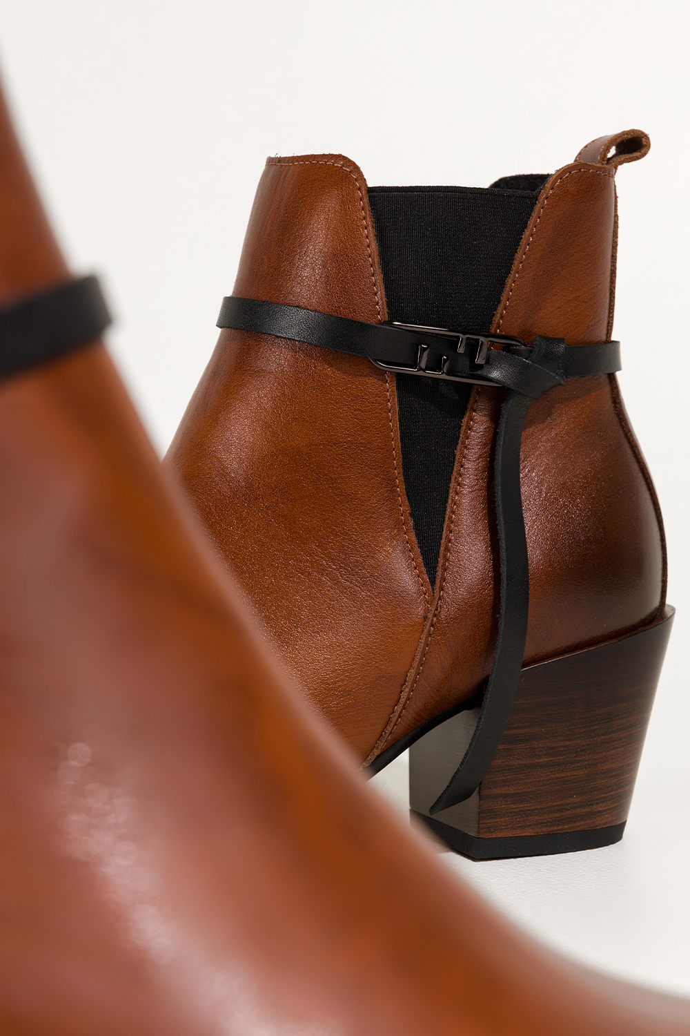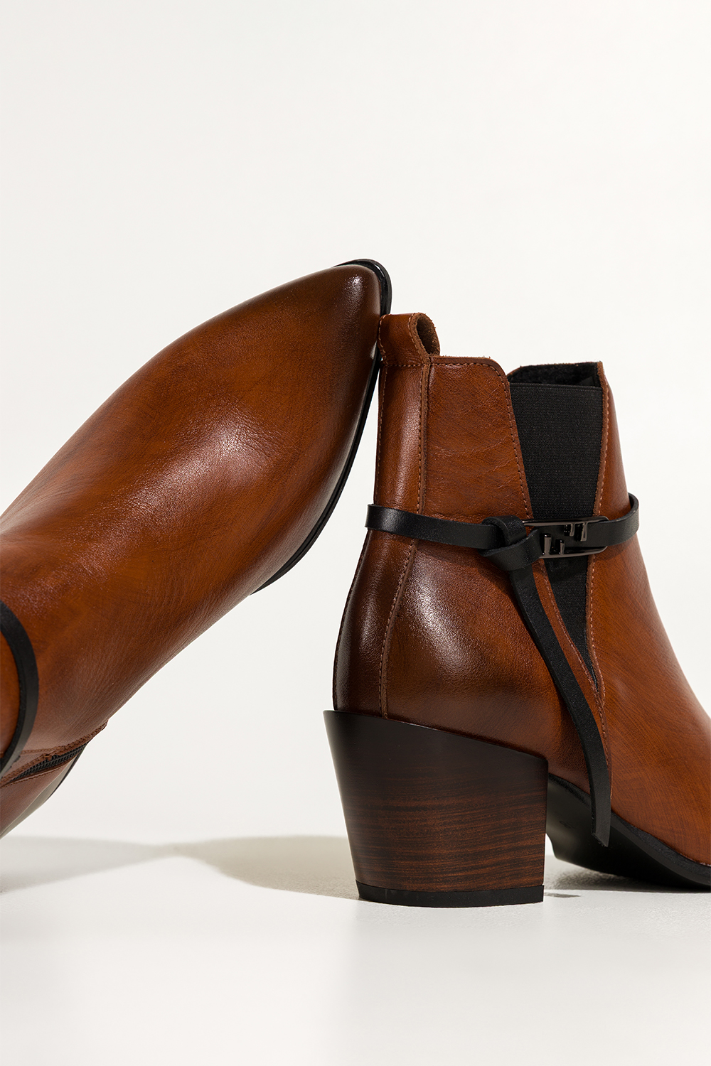 Brązowe botki skórzane damskie kowbojki na ściętym klocku guma w cholewce pasek ze stalową ozdobą P