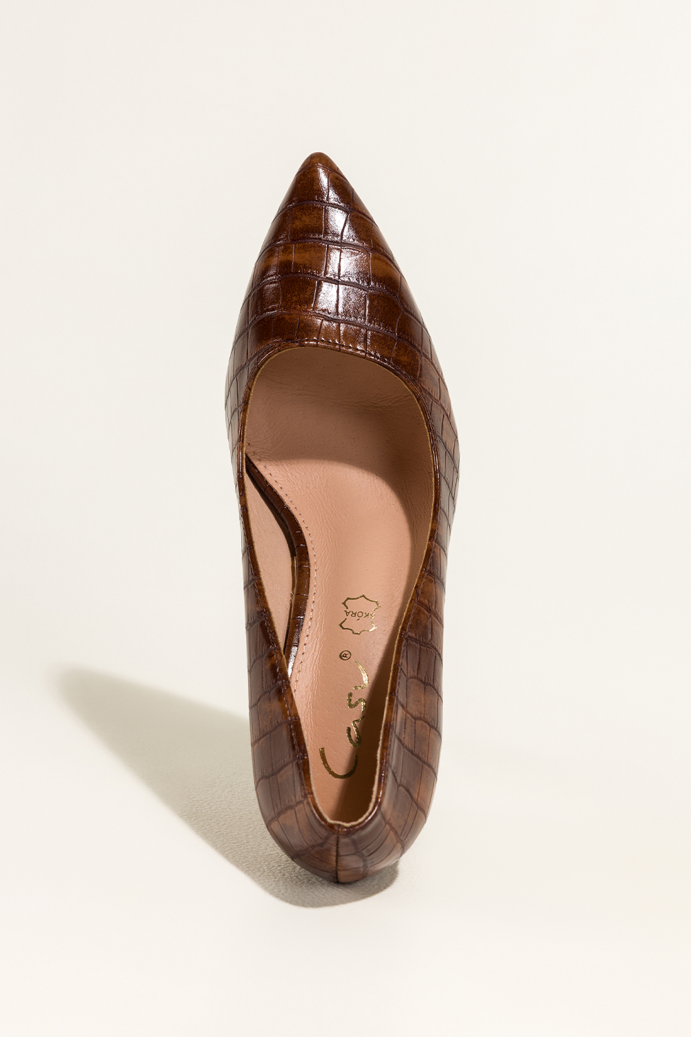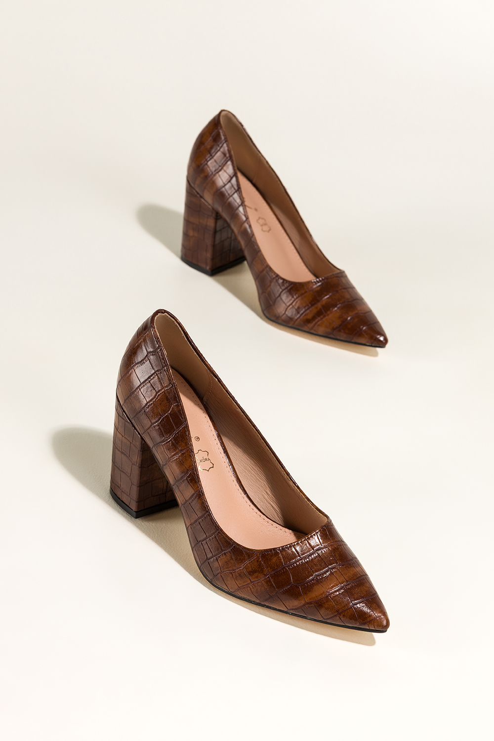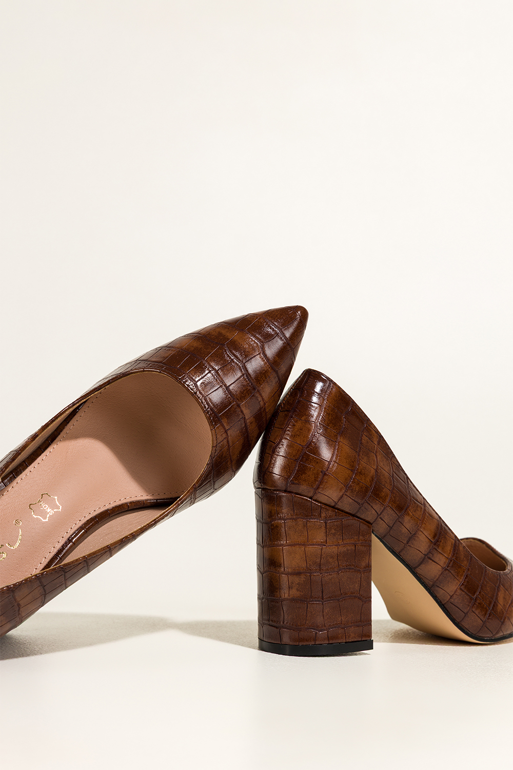 Brązowe czółenka damskie na słupku krokodyli wzór skórzana wkładka Casu D212X4-BR