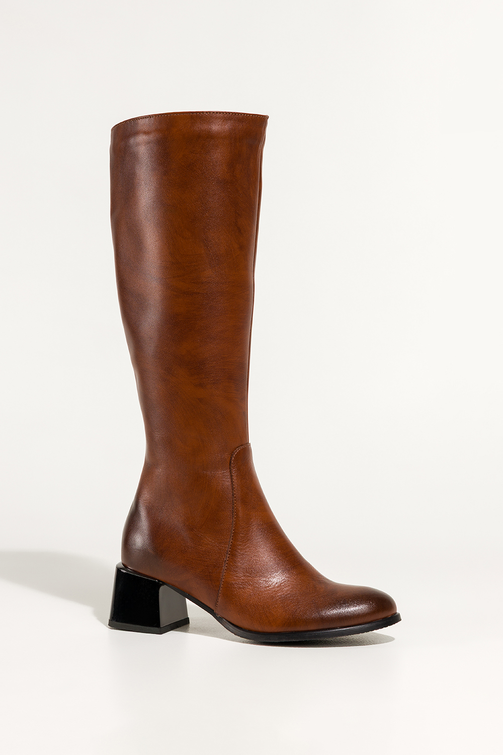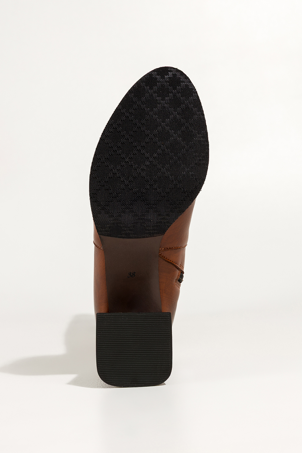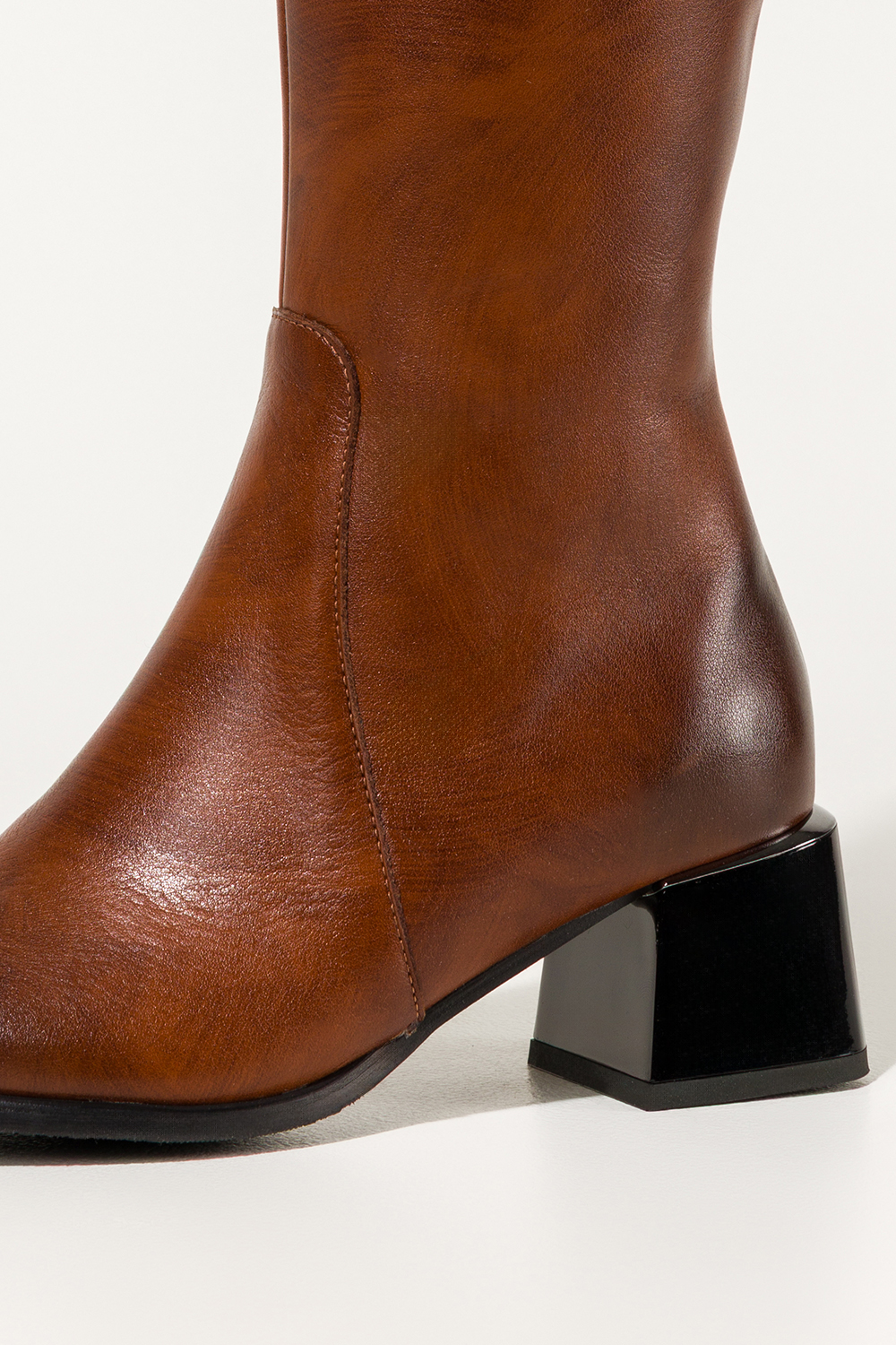 Brązowe kozaki skórzane damskie przed kolano na niskim ozdobnym klocku PRODUKT POLSKI Casu 29845