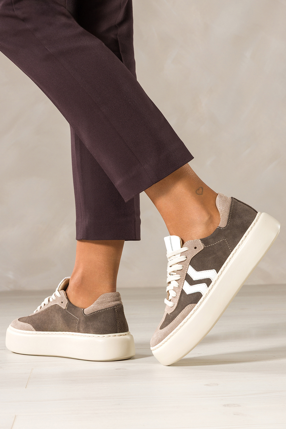 Brązowe sneakersy skórzane damskie buty sportowe na platformie z białymi i beżowymi wstawkami sznur