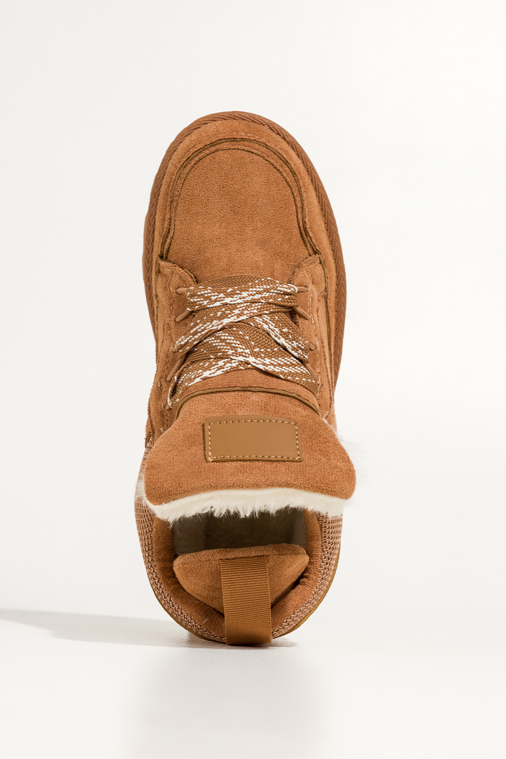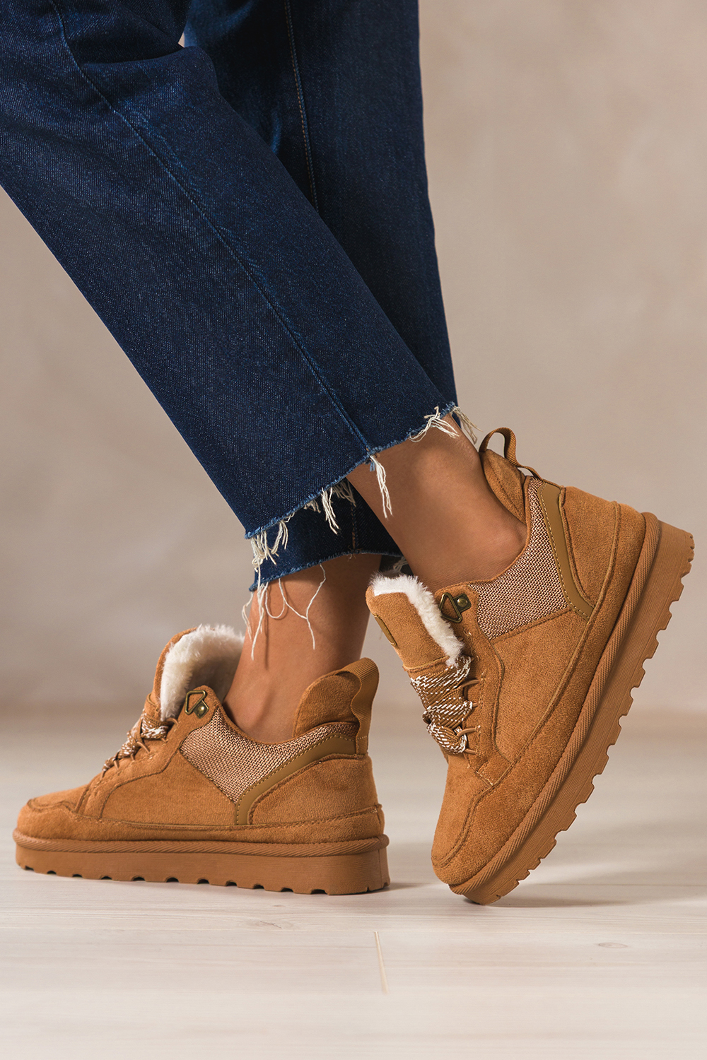 Camelowe sneakersy damskie z futerkiem na bieżnikowanej platformie ozdobne sznurówki z wzorem Casu