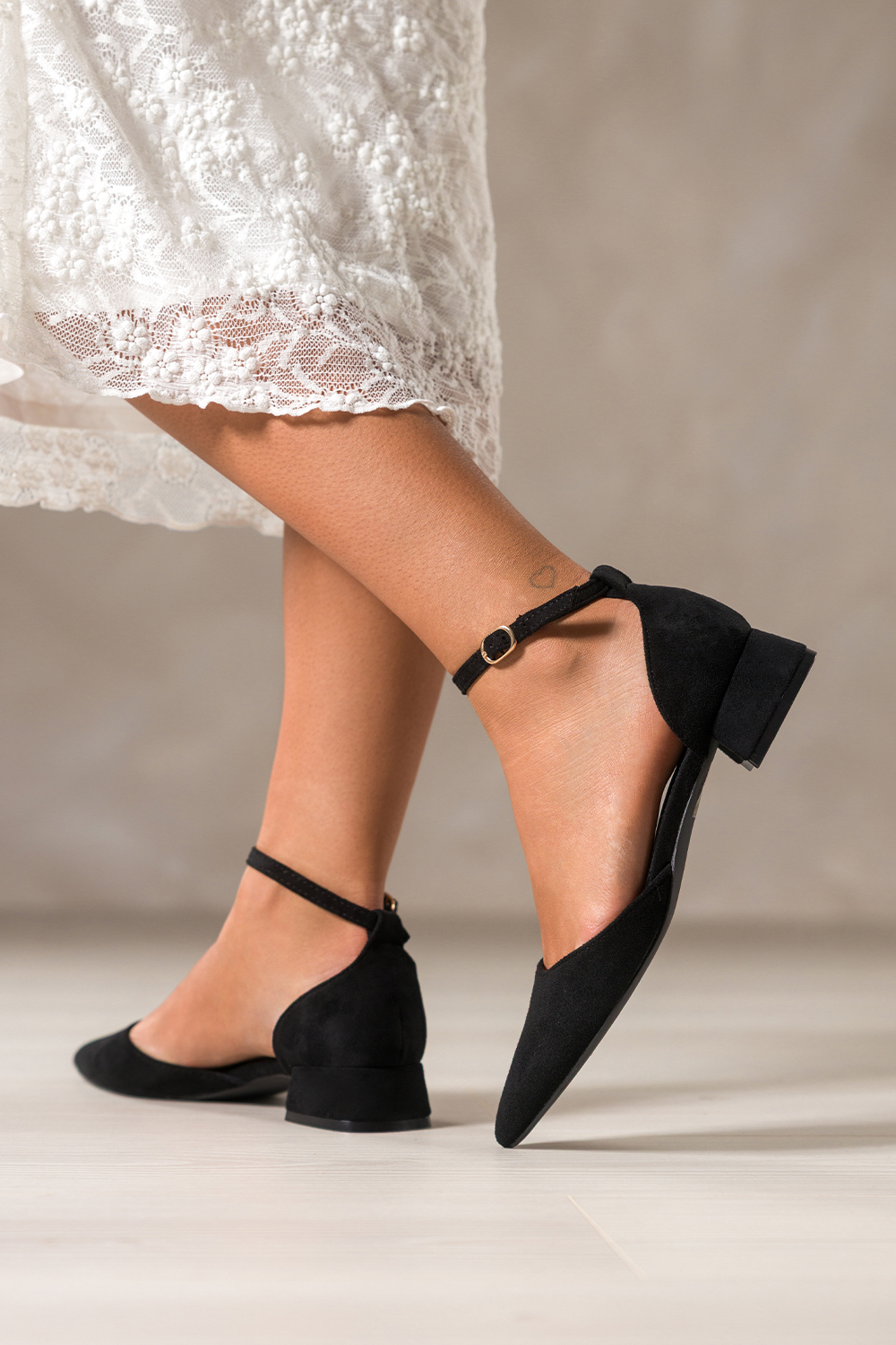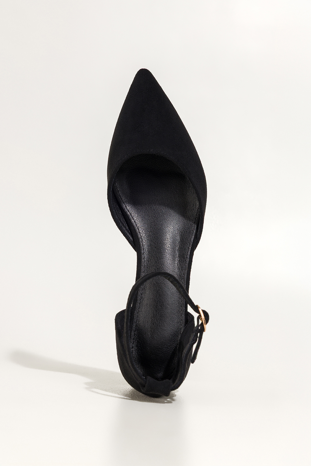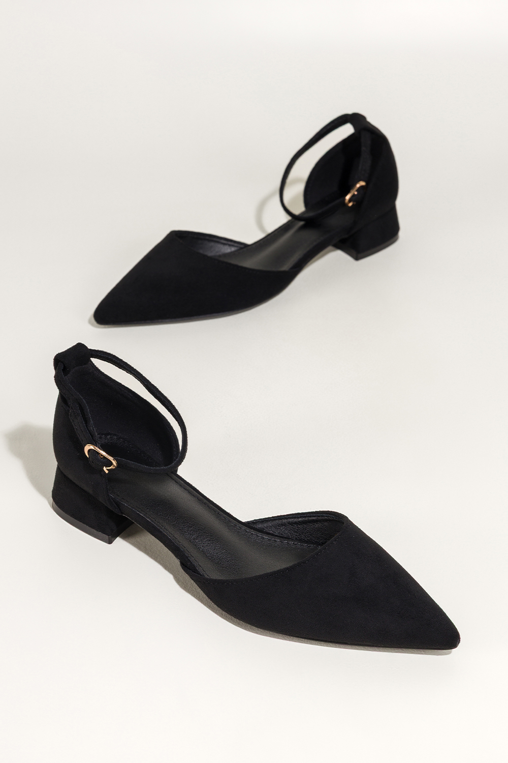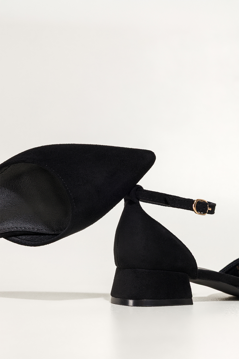 Czarne baleriny damskie z zamszu ekologicznego na niskim obcasie zakryta pięta pasek wokół kostki C