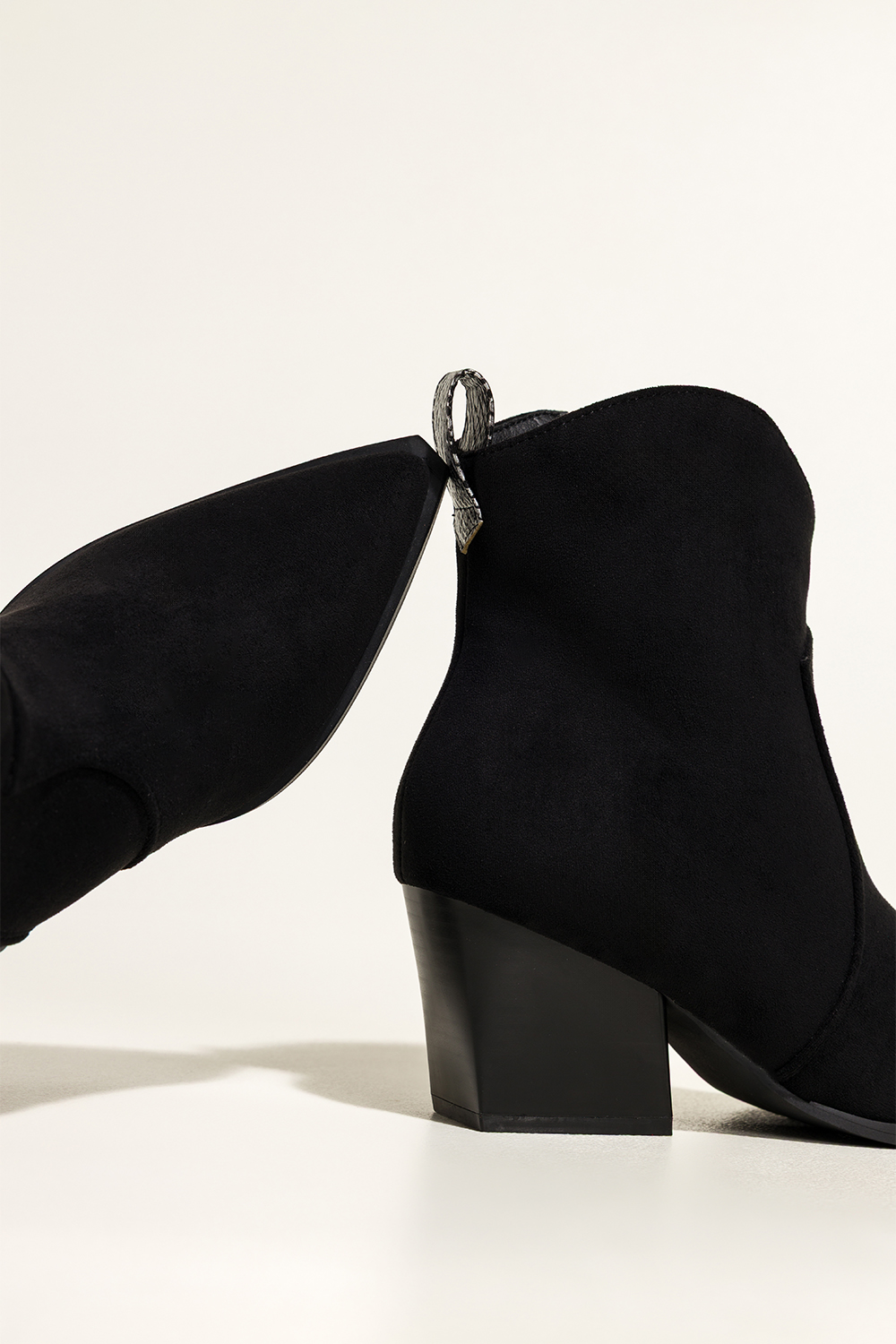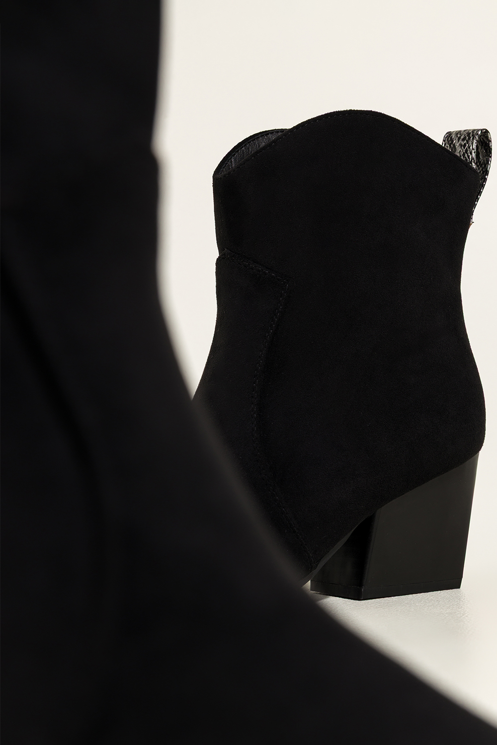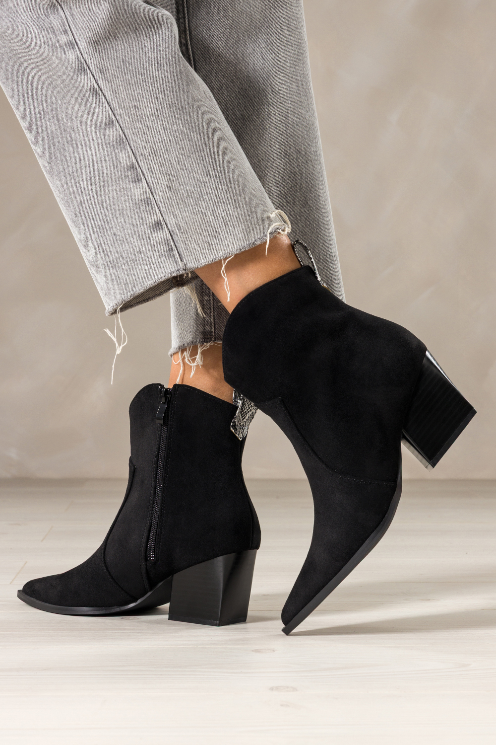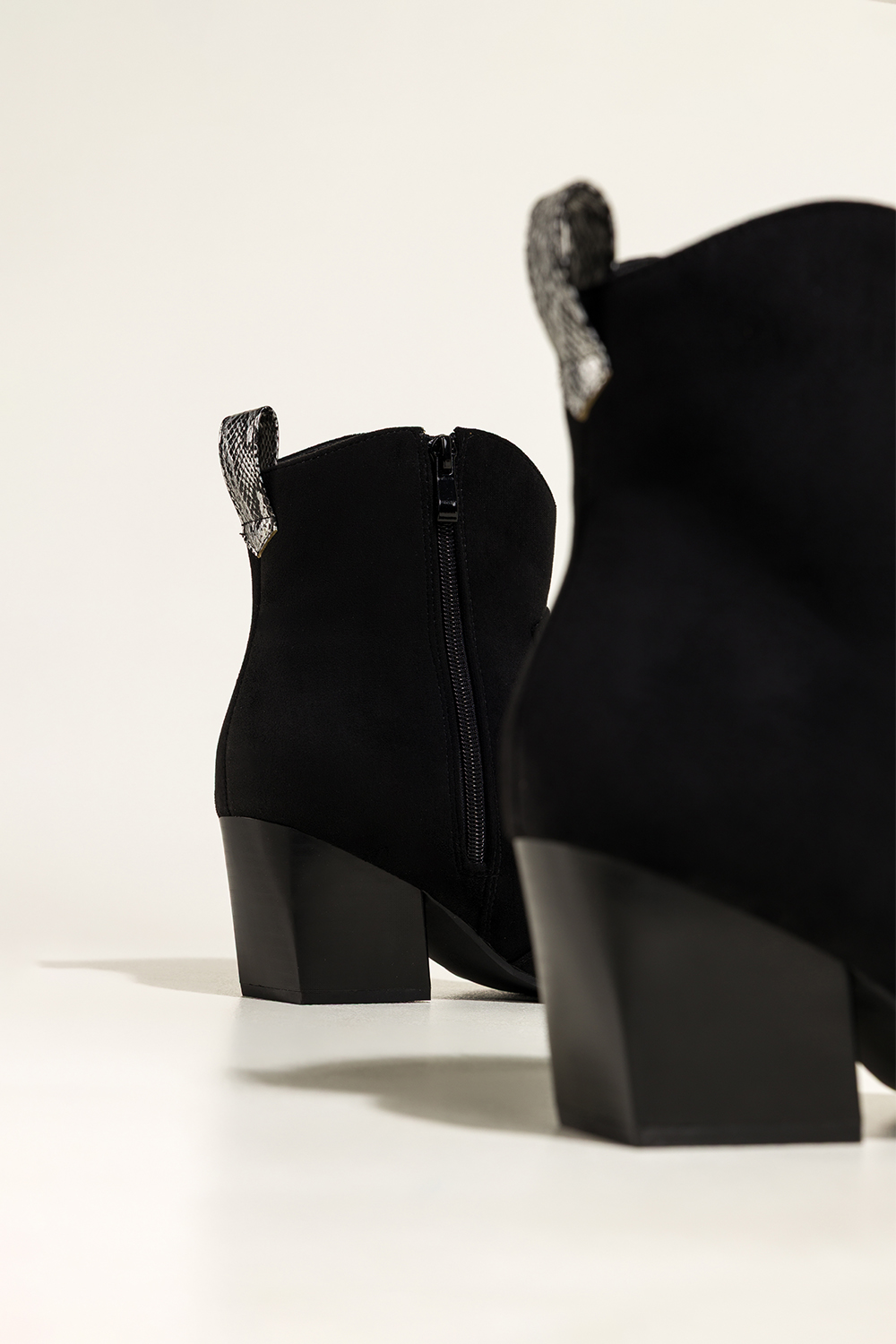 Czarne botki damskie kowbojki ozdobny pasek z wzorem wężowym szeroki ścięty obcas Casu D25WX4-B
