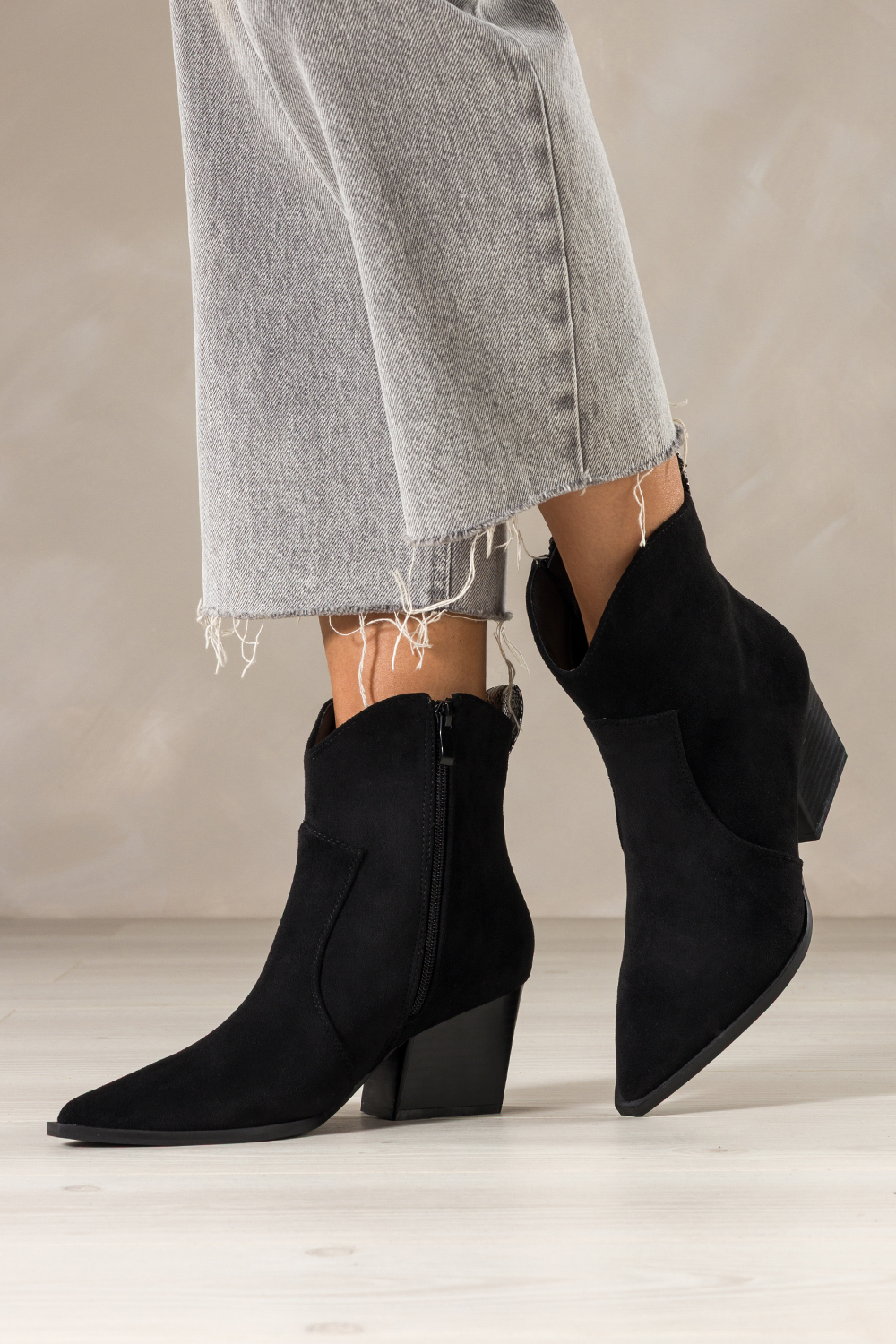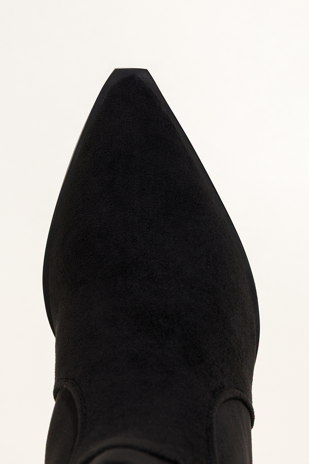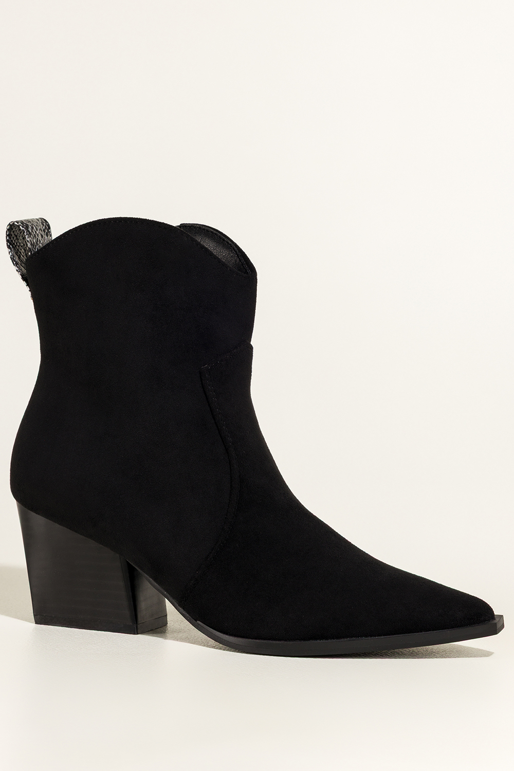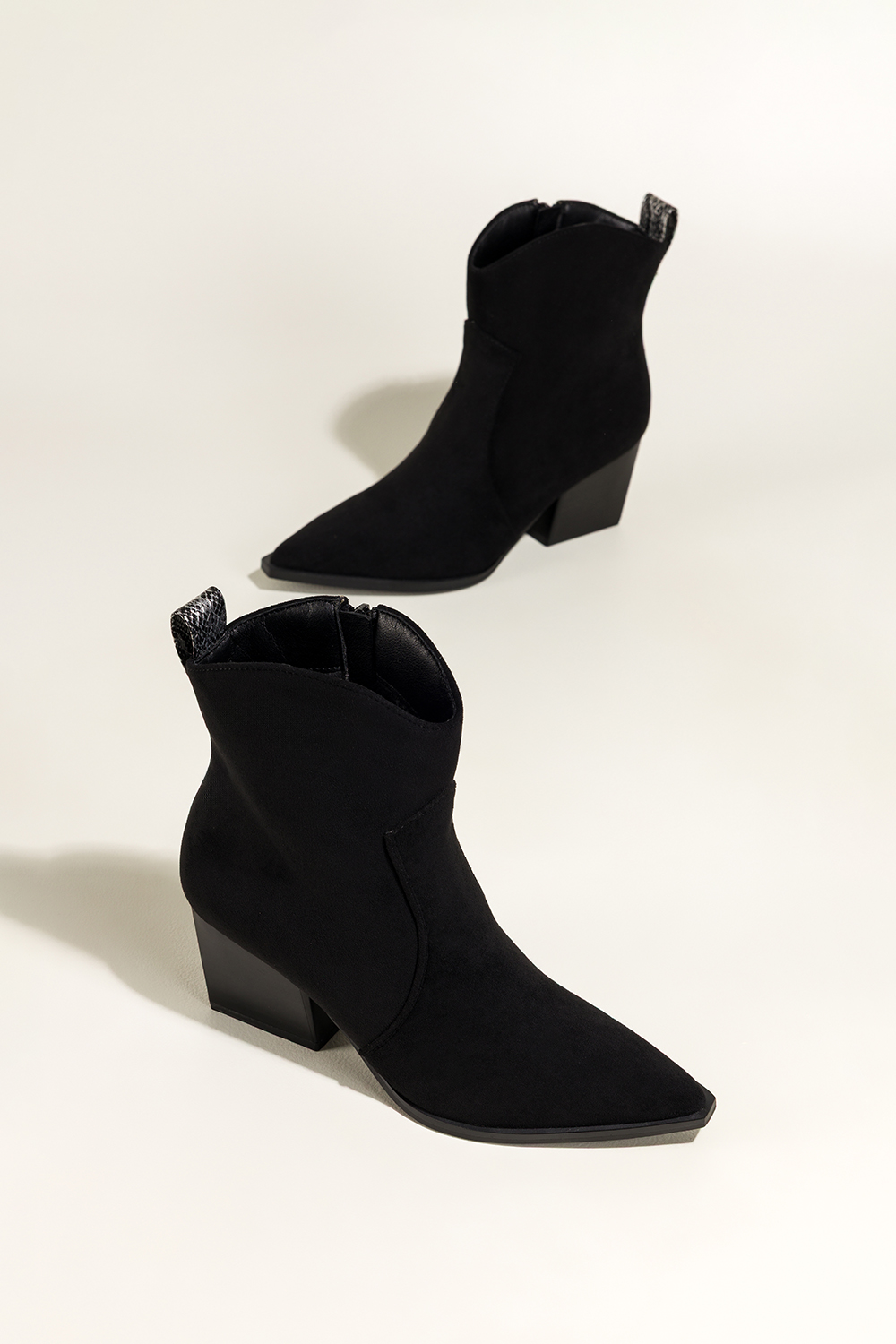 Czarne botki damskie kowbojki ozdobny pasek z wzorem wężowym szeroki ścięty obcas Casu D25WX4-B