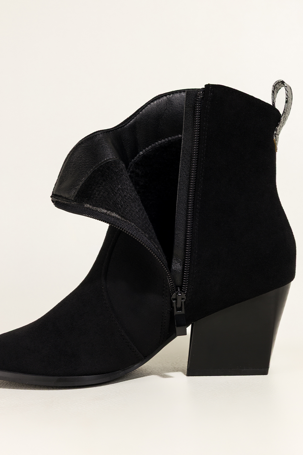 Czarne botki damskie kowbojki ozdobny pasek z wzorem wężowym szeroki ścięty obcas Casu model D25WX4-B, to synonim doskonałego połączenia modnego designu i wygody. Wykonane z wysokogatunkowego zamszu ekologicznego, gwarantują trwałość. Delikatne futerko wewnątrz zapewnia przyjemne ocieplenie, dzięki czemu botki sprawdzą się idealnie w chłodniejsze dni. Ich ergonomiczna konstrukcja oraz solidne wykonanie sprawiają, że każdy krok to czysta przyjemność. Klasyczna czerń przełamana ozdobnym szaro-czarnym paskiem z motywem wężowym dodaje charakteru i wyrazistości, dzięki czemu botki te przyciągają wzrok i świetnie wpisują się zarówno w casualowe, jak i bardziej eleganckie stylizacje. Szpiczasty nosek oraz szeroki, ścięty obcas podkreślają smukłość sylwetki, nadając jej lekko kowbojski, ale zarazem niezwykle kobiecy wygląd. Wycięcie z przodu cholewki wysmukla optycznie nogę i pięknie prezentuje się zarówno z dopasowanymi spodniami, jak i zwiewnymi sukienkami. Zapinane na zamek, botki są szybkie i łatwe w zakładaniu, co czyni je praktycznym wyborem na co dzień. Ich uniwersalny charakter sprawia, że sprawdzą się zarówno w pracy, na spacerze, jak i podczas wieczornego wyjścia. Szeroki obcas zapewnia stabilność. Idealne dla kobiet, które szukają modnego obuwia. Cechy wyróżniające Wysokiej jakości zamsz ekologiczny Ocieplane miękkim futerkiem Stylowy pasek z motywem wężowym Szeroki, ścięty i stabilny obcas Modny szpiczasty nosek Cholewka z wycięciem optycznie wydłużająca nogi Łatwe zapinanie na zamek Kowbojki to idealny wybór dla kobiet ceniących modę, wygodę i wyrazisty styl. Zamów je już dziś na stronie Casu i podkreśl swój charakter każdego dnia!