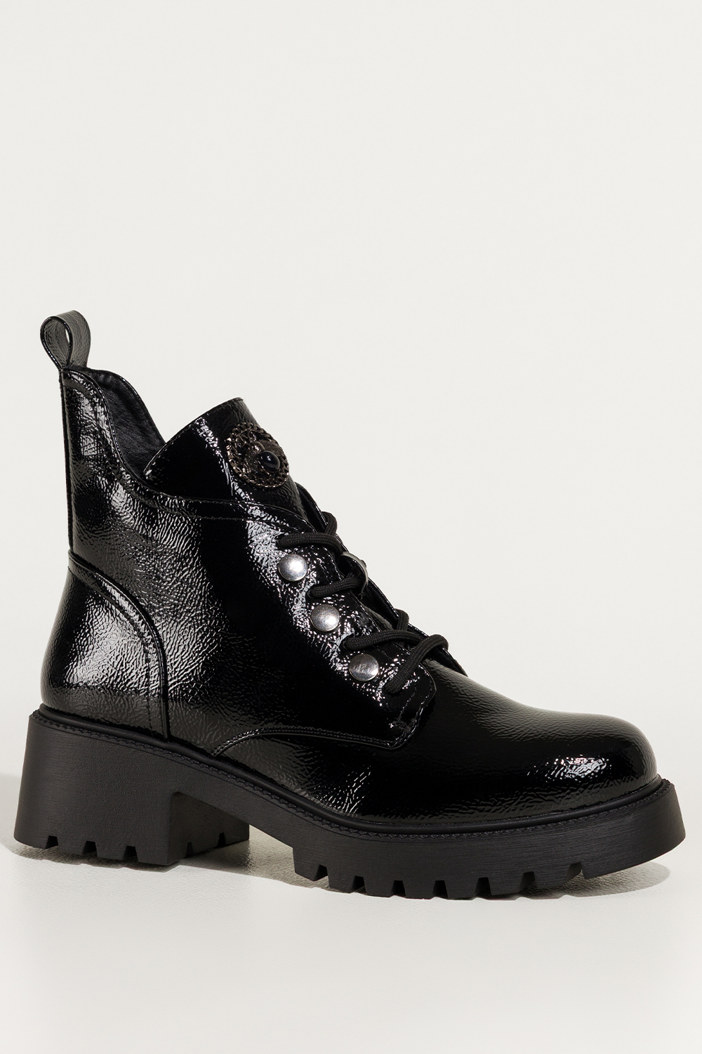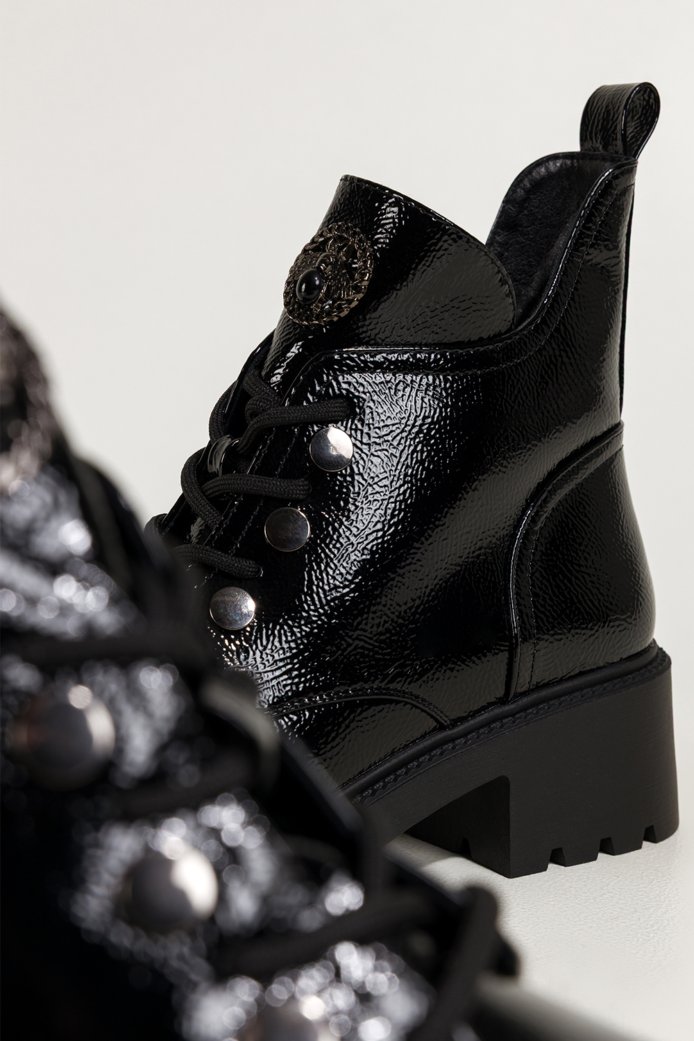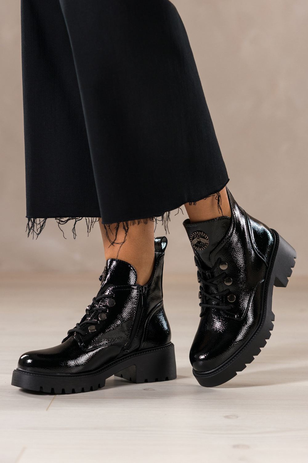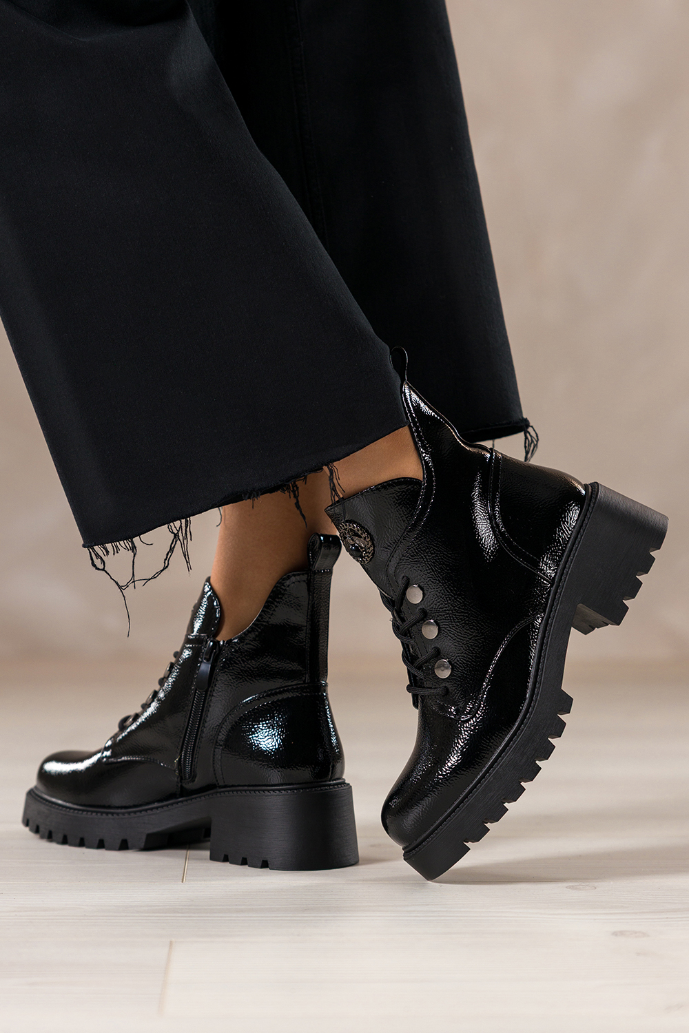 Czarne botki damskie lakierowane na bieżnikowanej platformie ozdobny owad na języku sznurowane Casu