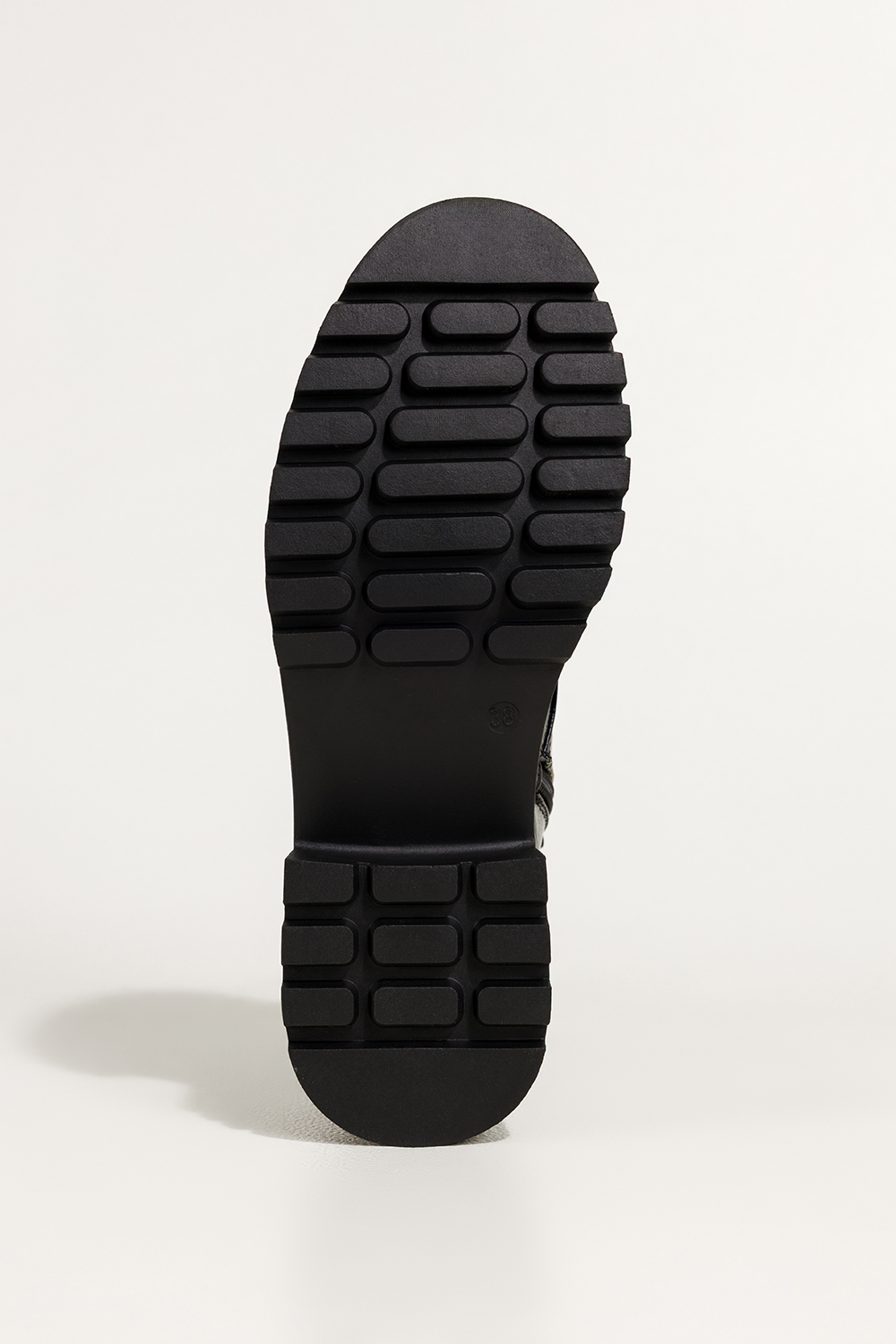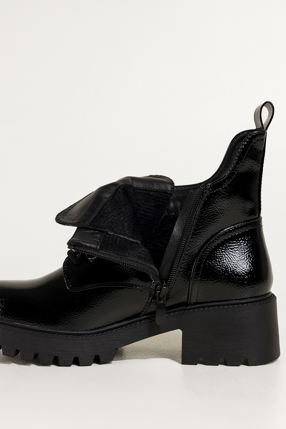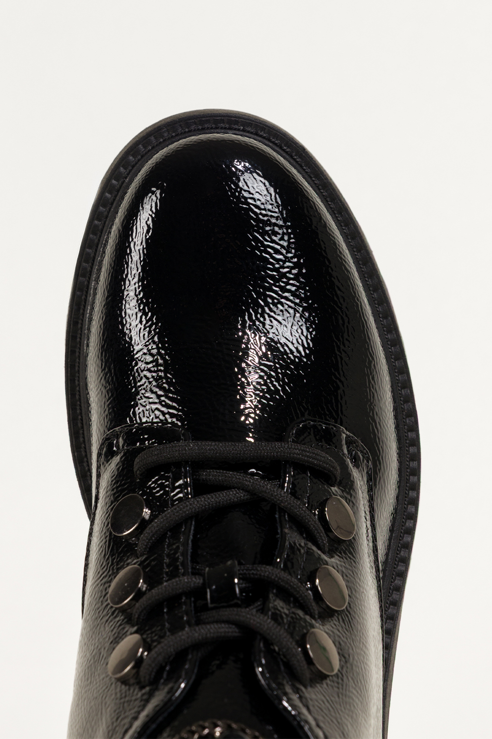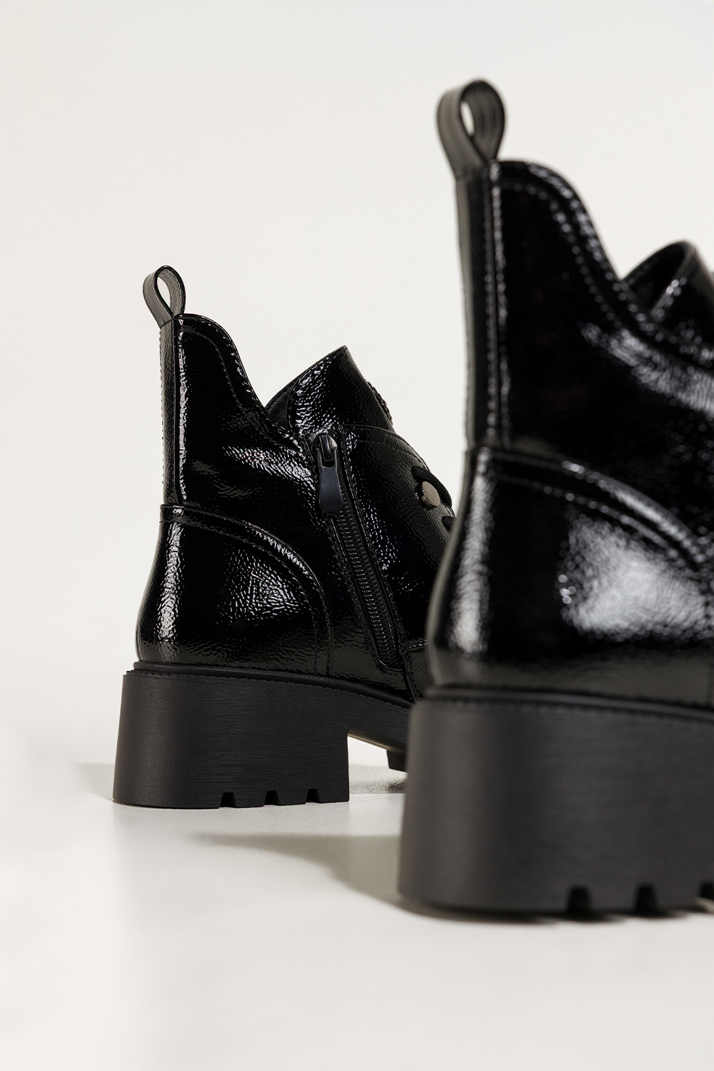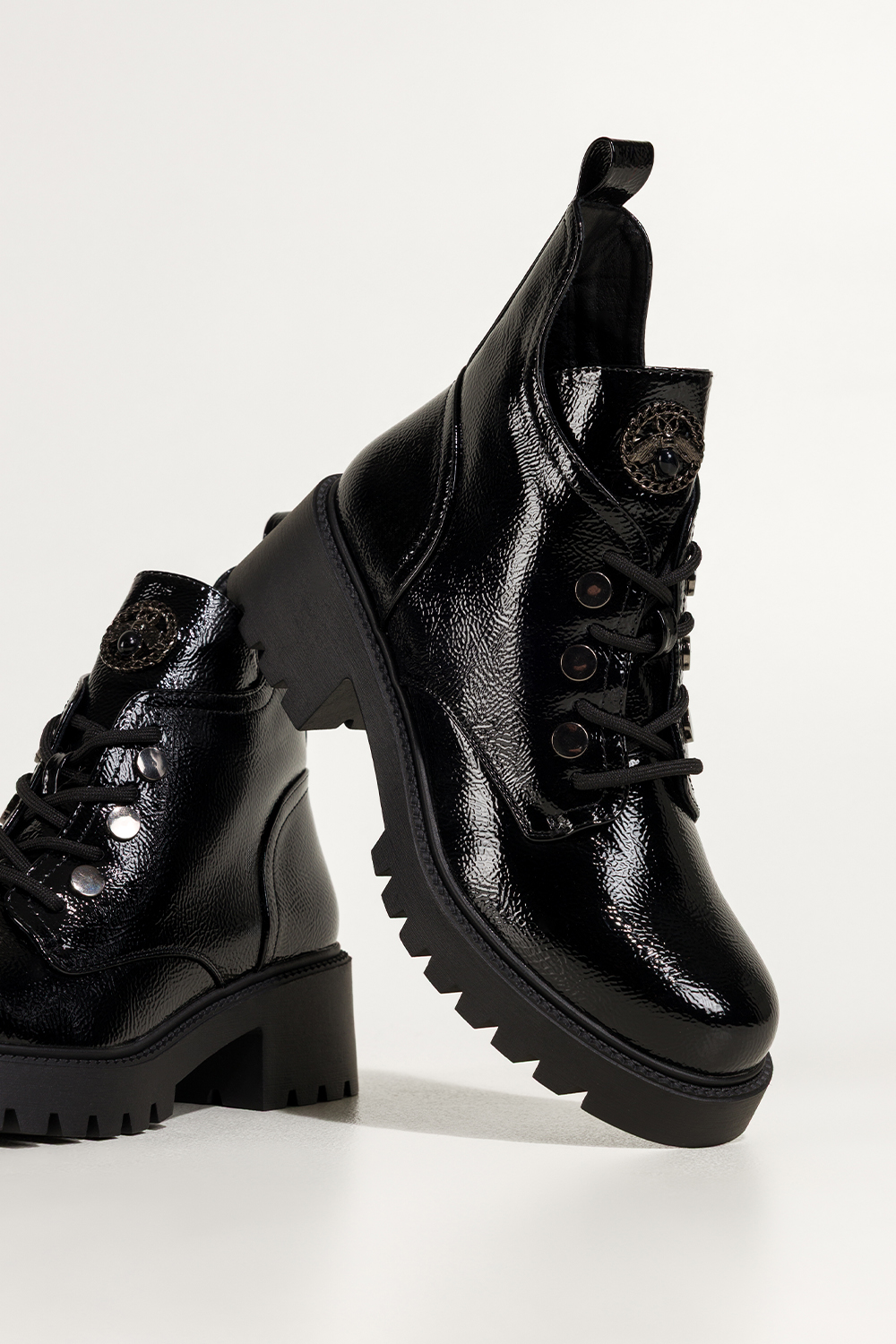 Czarne botki damskie lakierowane na bieżnikowanej platformie ozdobny owad na języku sznurowane Casu