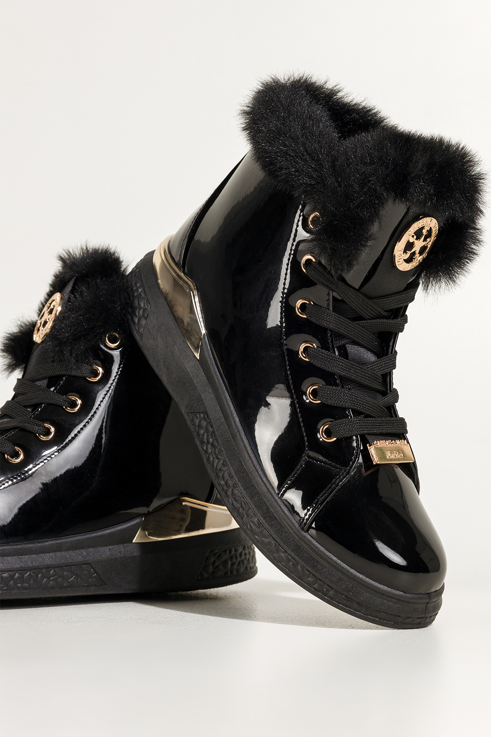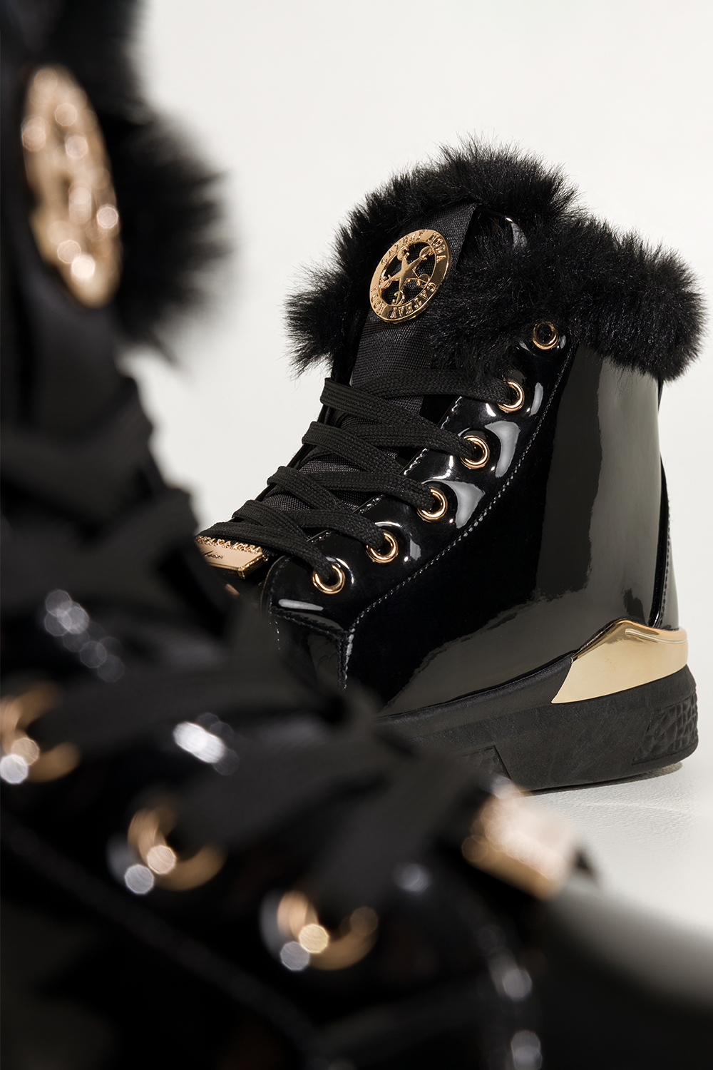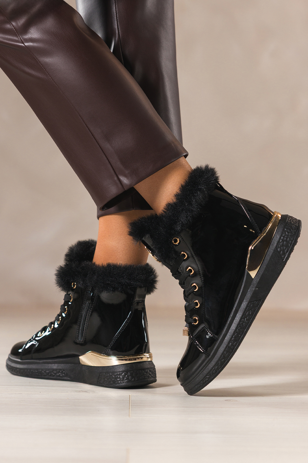 Czarne botki damskie lakierowane platforma ze złotym akcentem złota ozdoba na języku sznurowane Cas