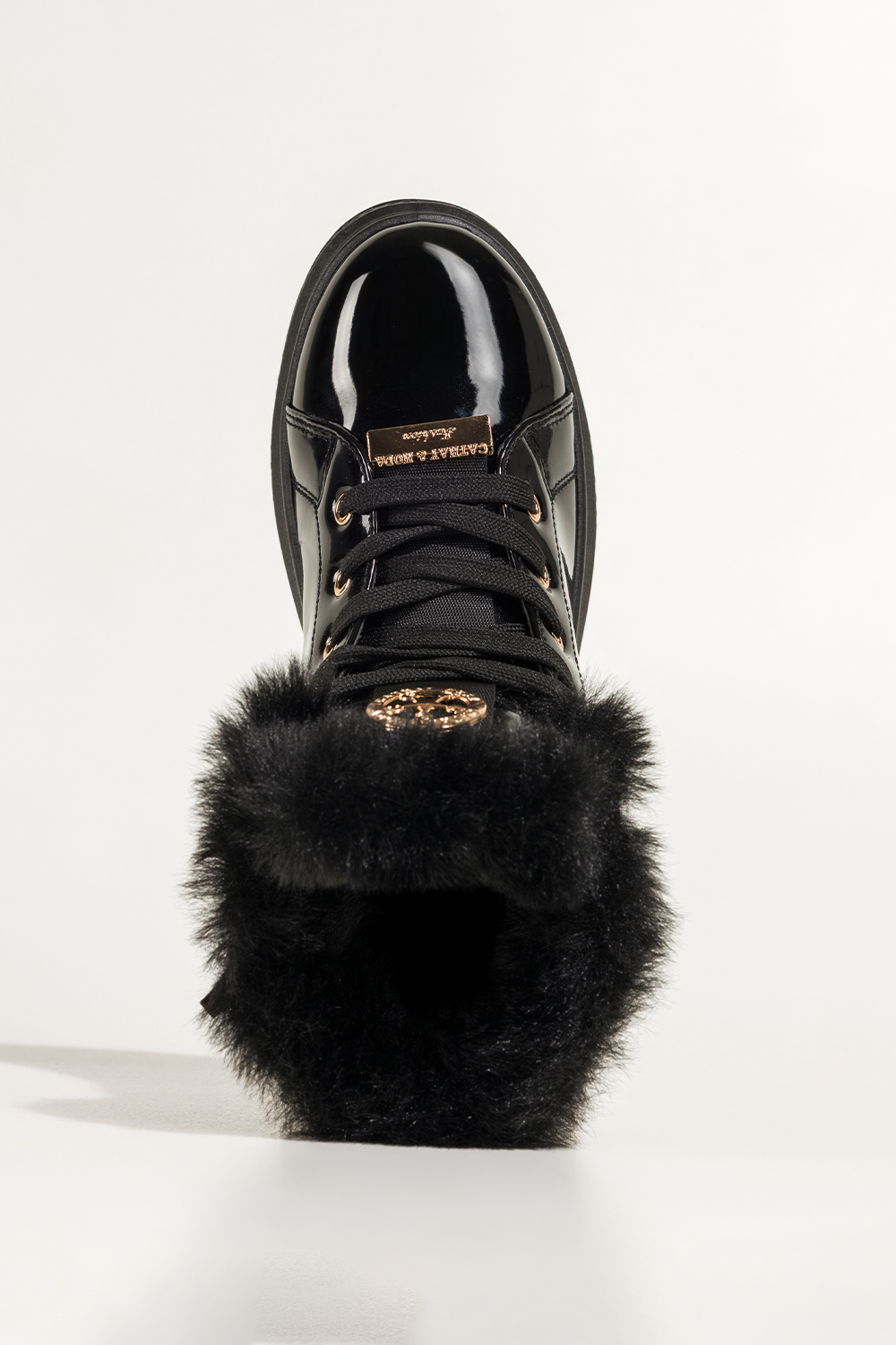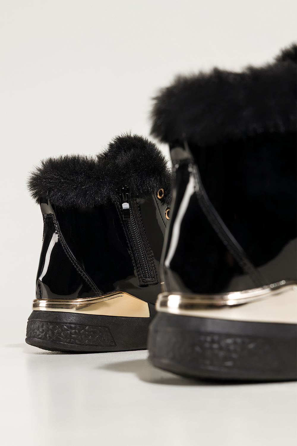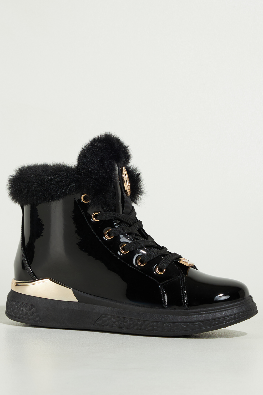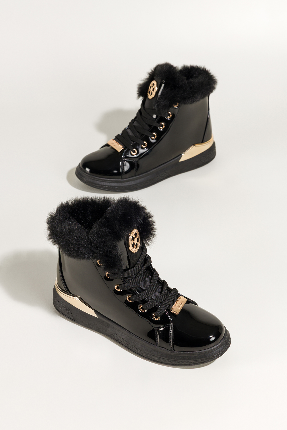Czarne botki damskie lakierowane platforma ze złotym akcentem złota ozdoba na języku sznurowane Cas