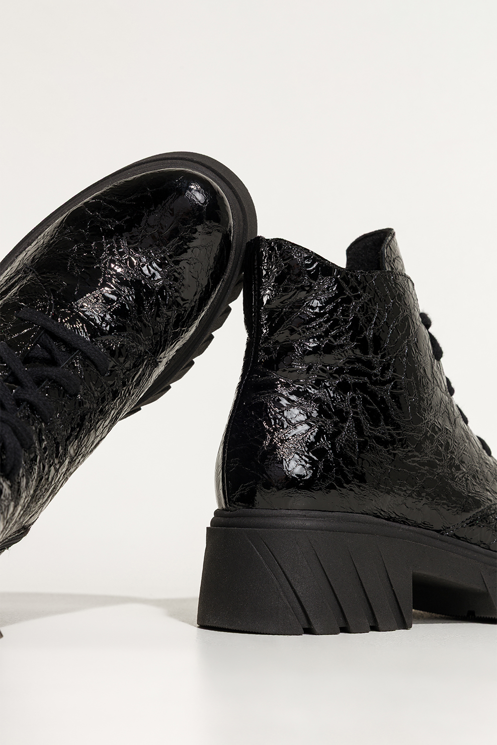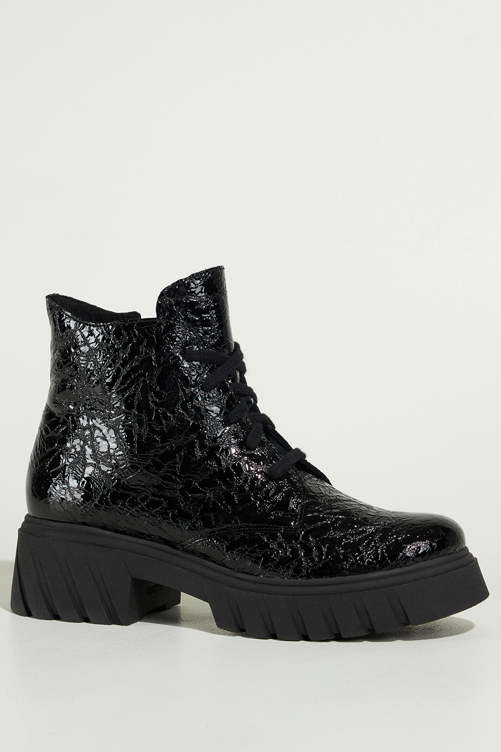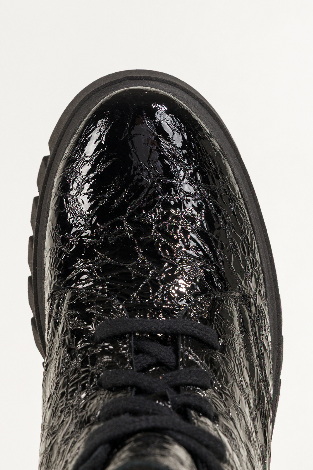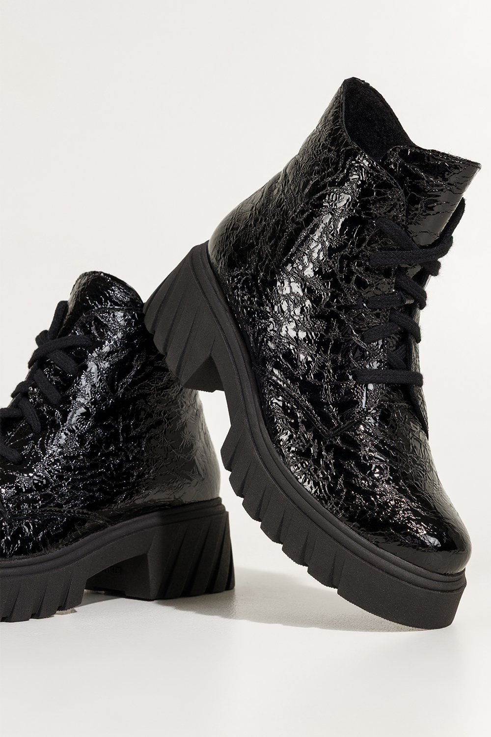 Czarne botki skórzane damskie lakierowane z wzorem bieżnikowana platforma sznurowane PRODUKT POLSKI