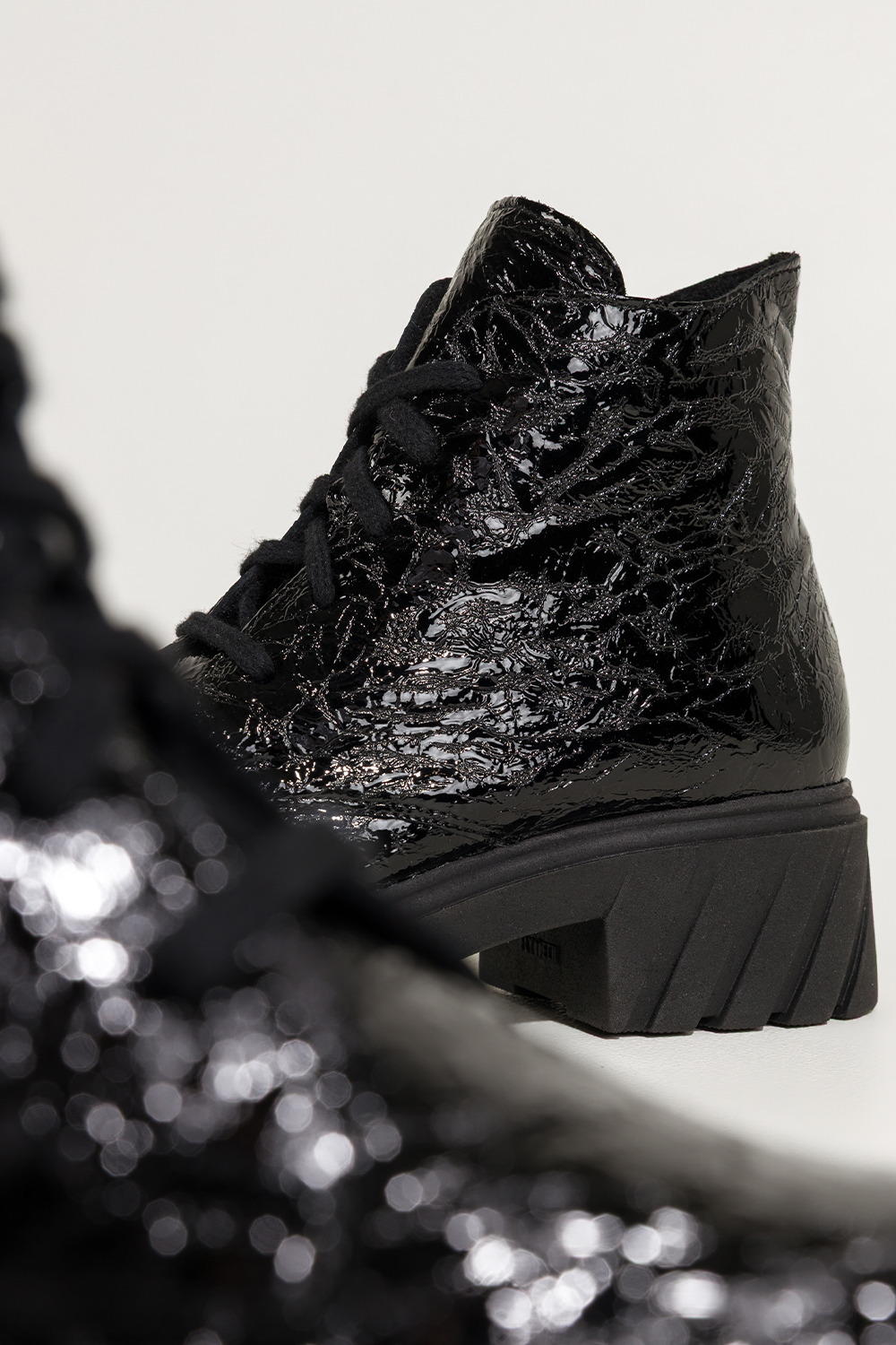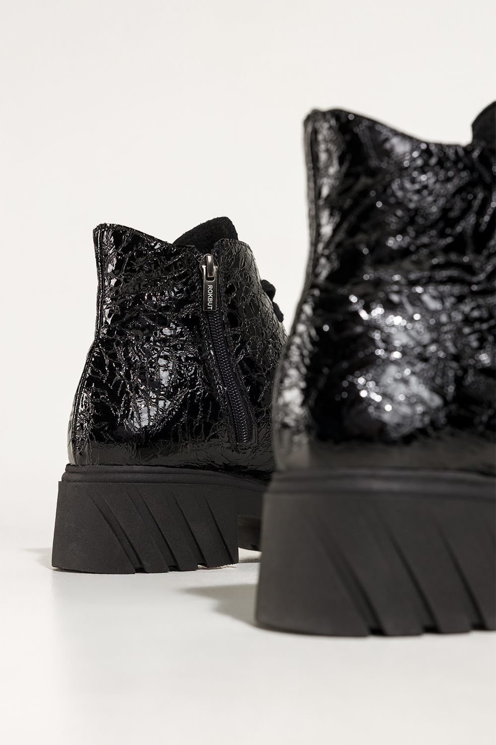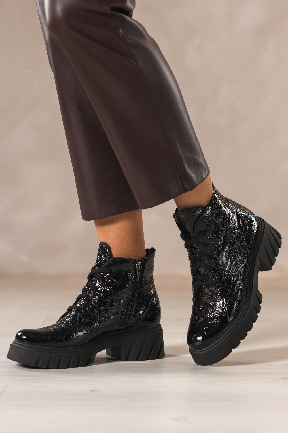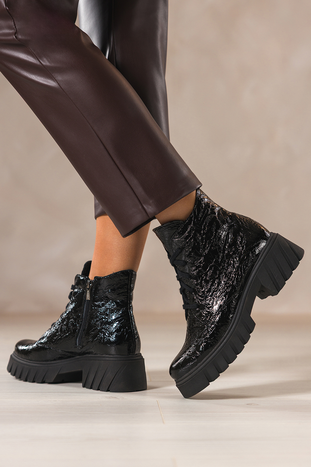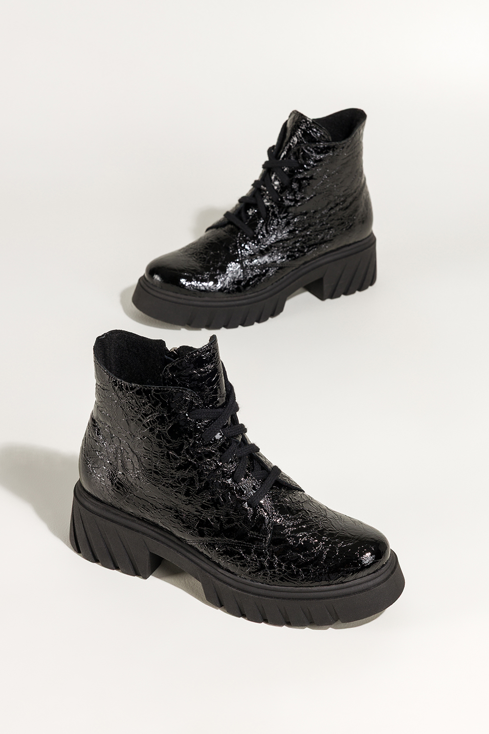 Czarne botki skórzane damskie lakierowane z wzorem bieżnikowana platforma sznurowane PRODUKT POLSKI