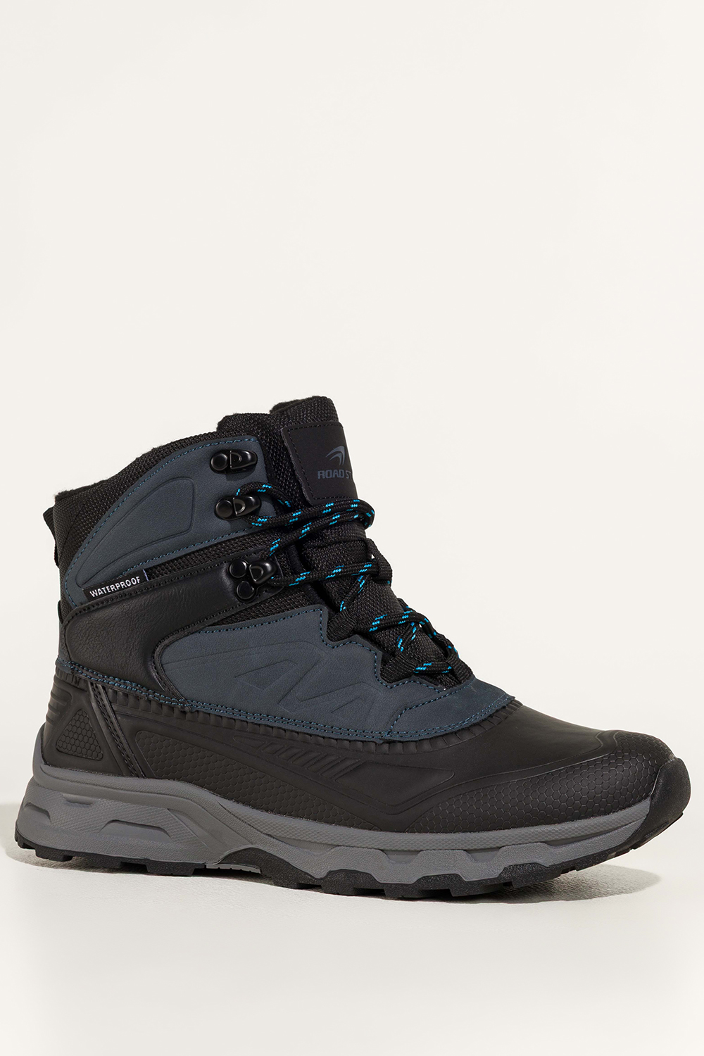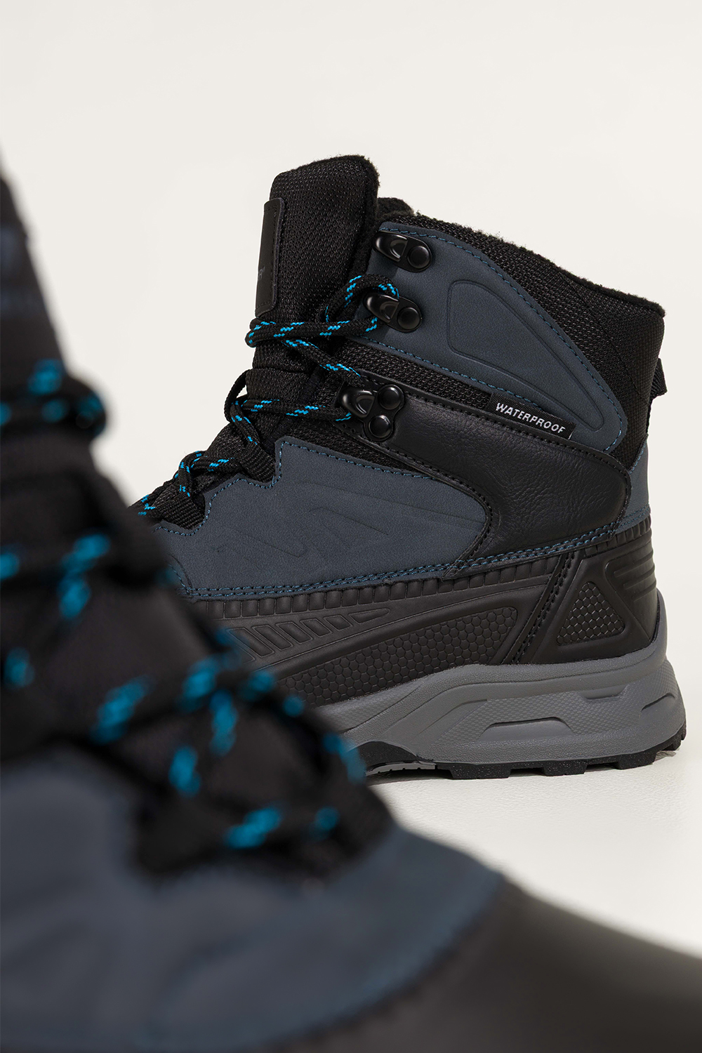 Czarne buty sportowe trekkingowe damskie wodoodporne na bieżnikowanej podeszwie sznurowane granatow