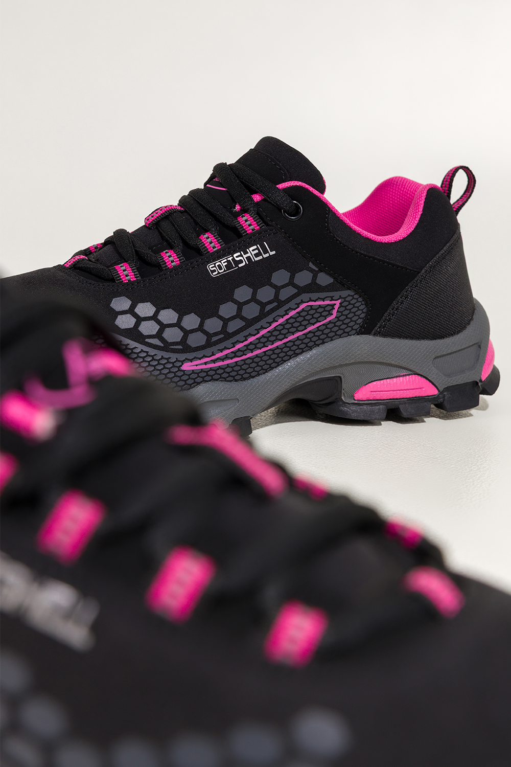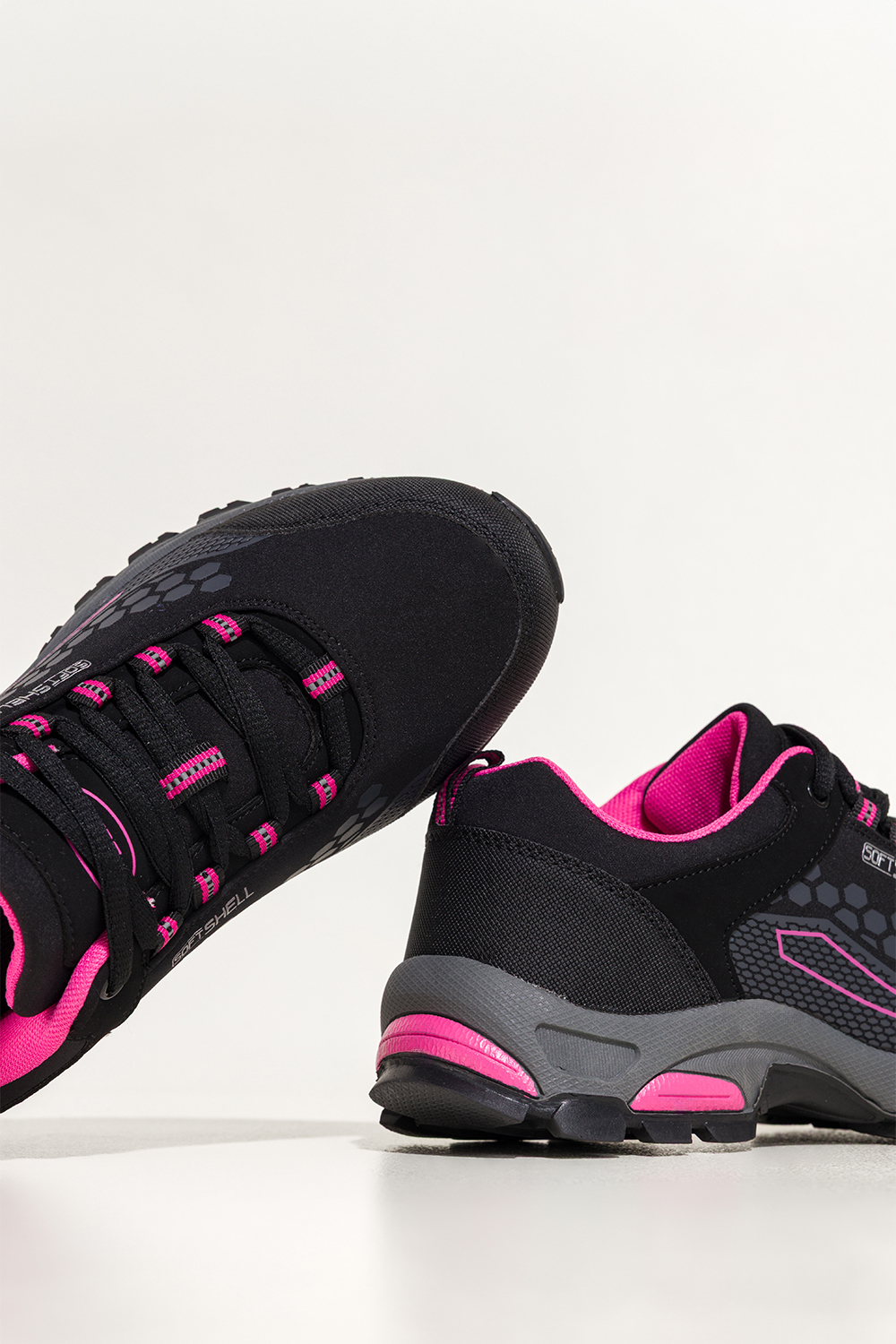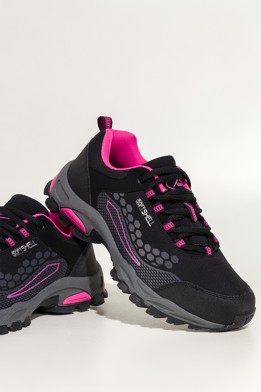 Czarne buty trekkingowe damskie sznurowane z różowymi wstawkami softshell Casu Y8187-1