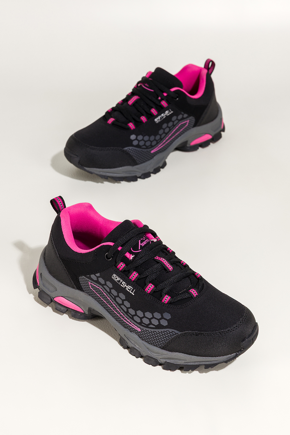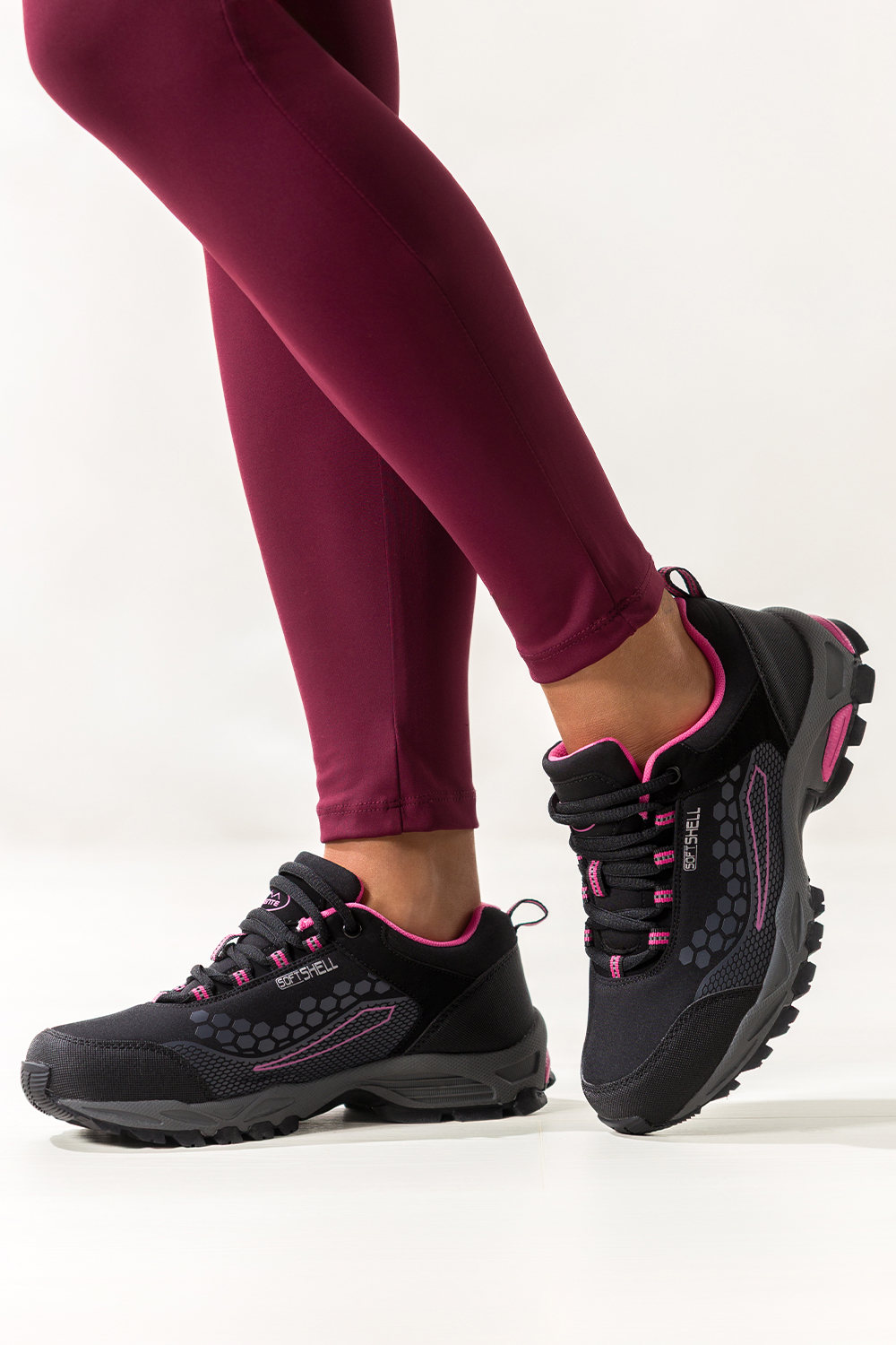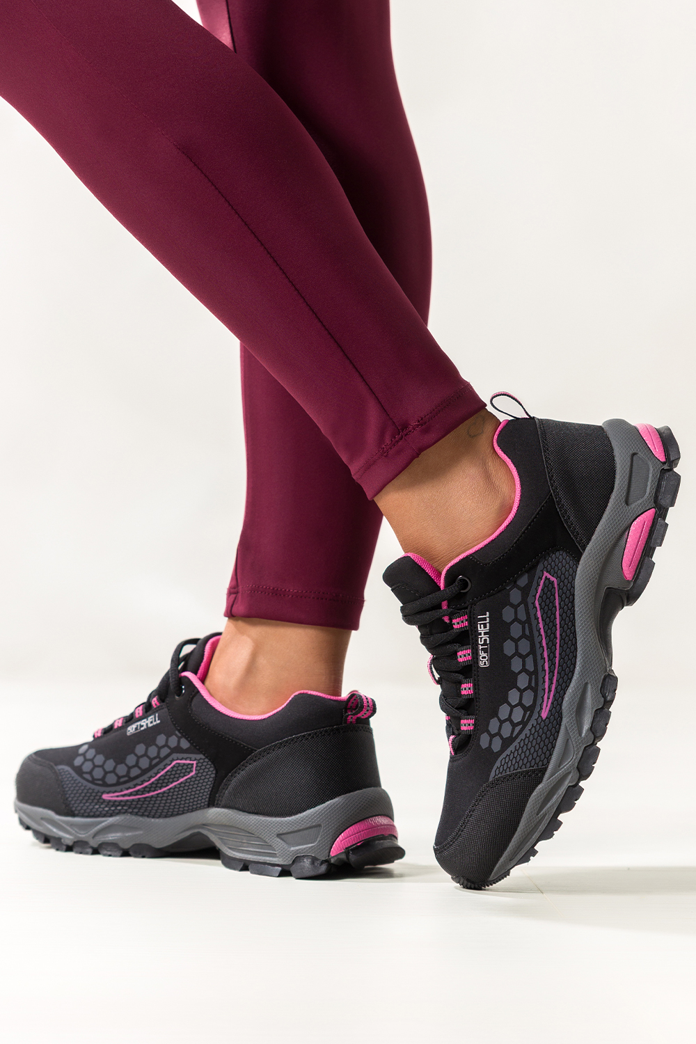 Czarne buty trekkingowe damskie sznurowane z różowymi wstawkami softshell Casu Y8187-1