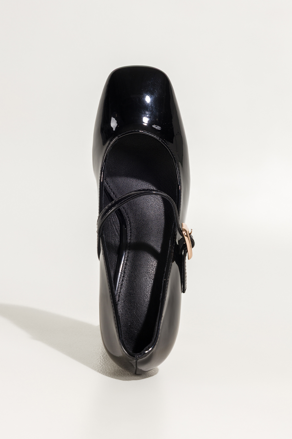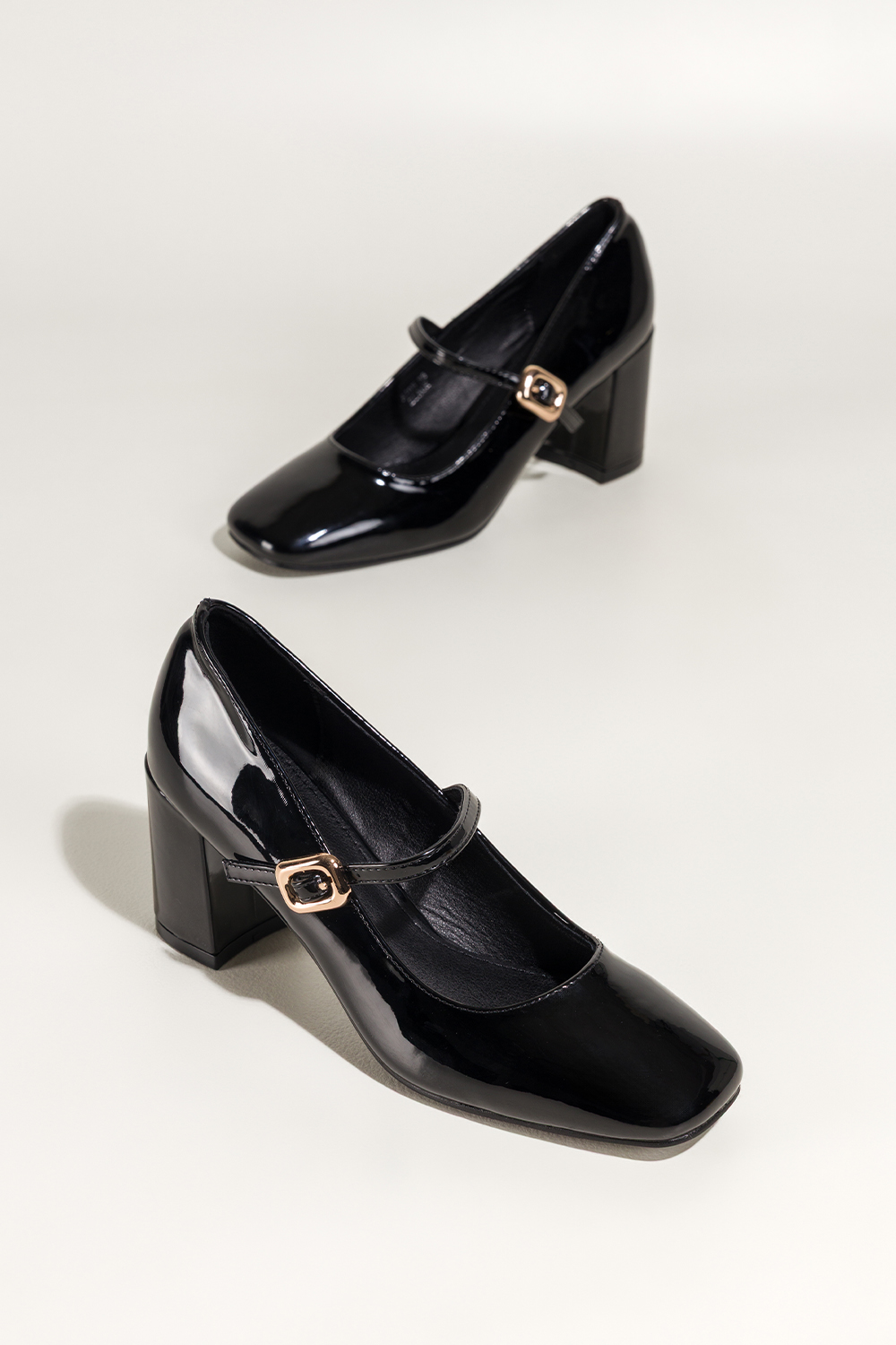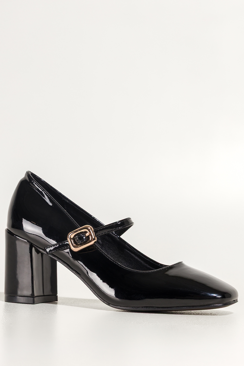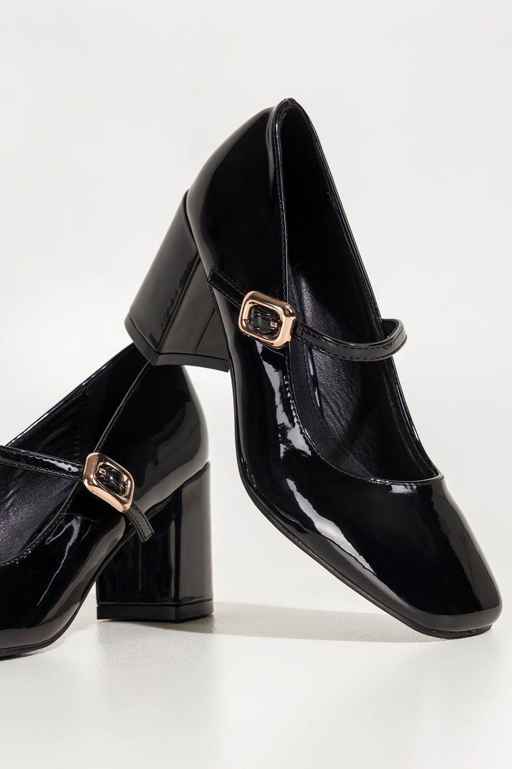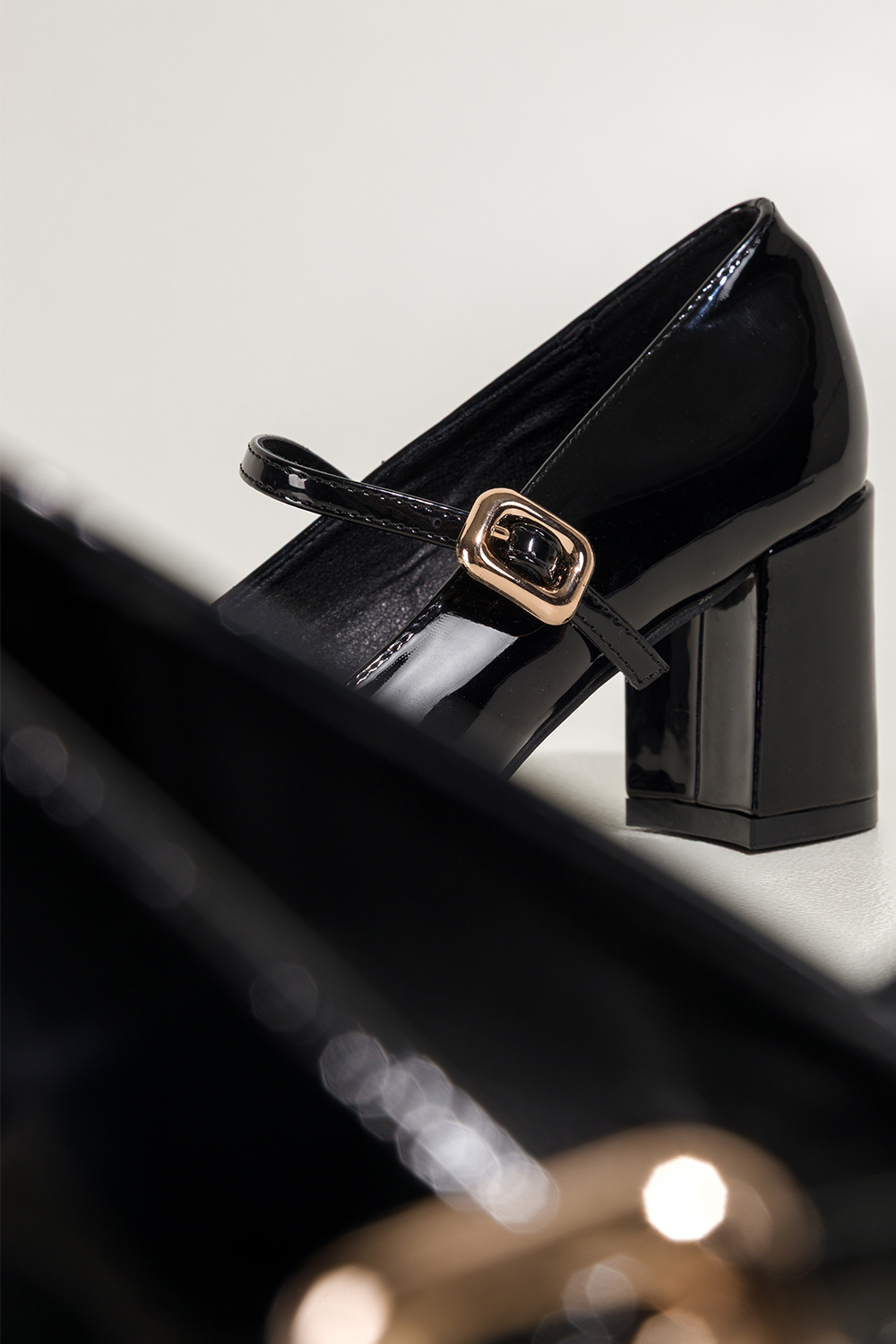 Czarne czółenka damskie na słupku lakierowane Mary Jane z paskiem Carla ZR94