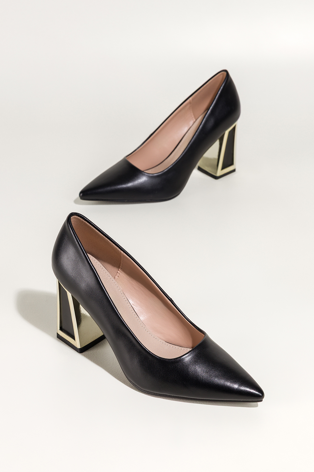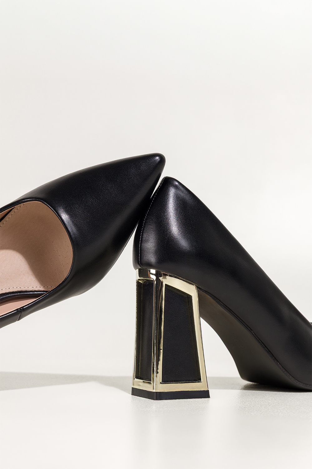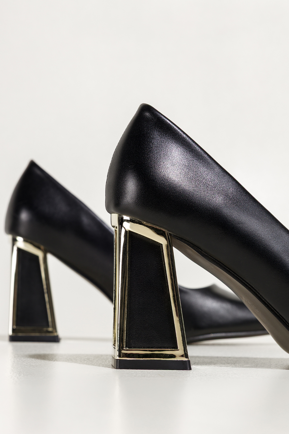 Czarne czółenka damskie na szerokim ozdobnym klocku ze złotymi akcentami Carla N476K