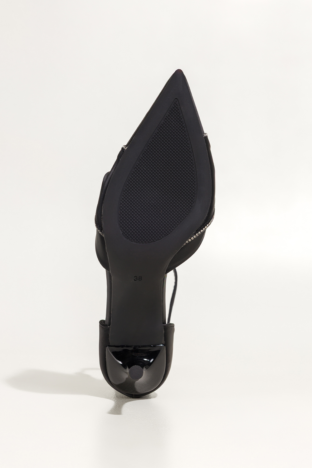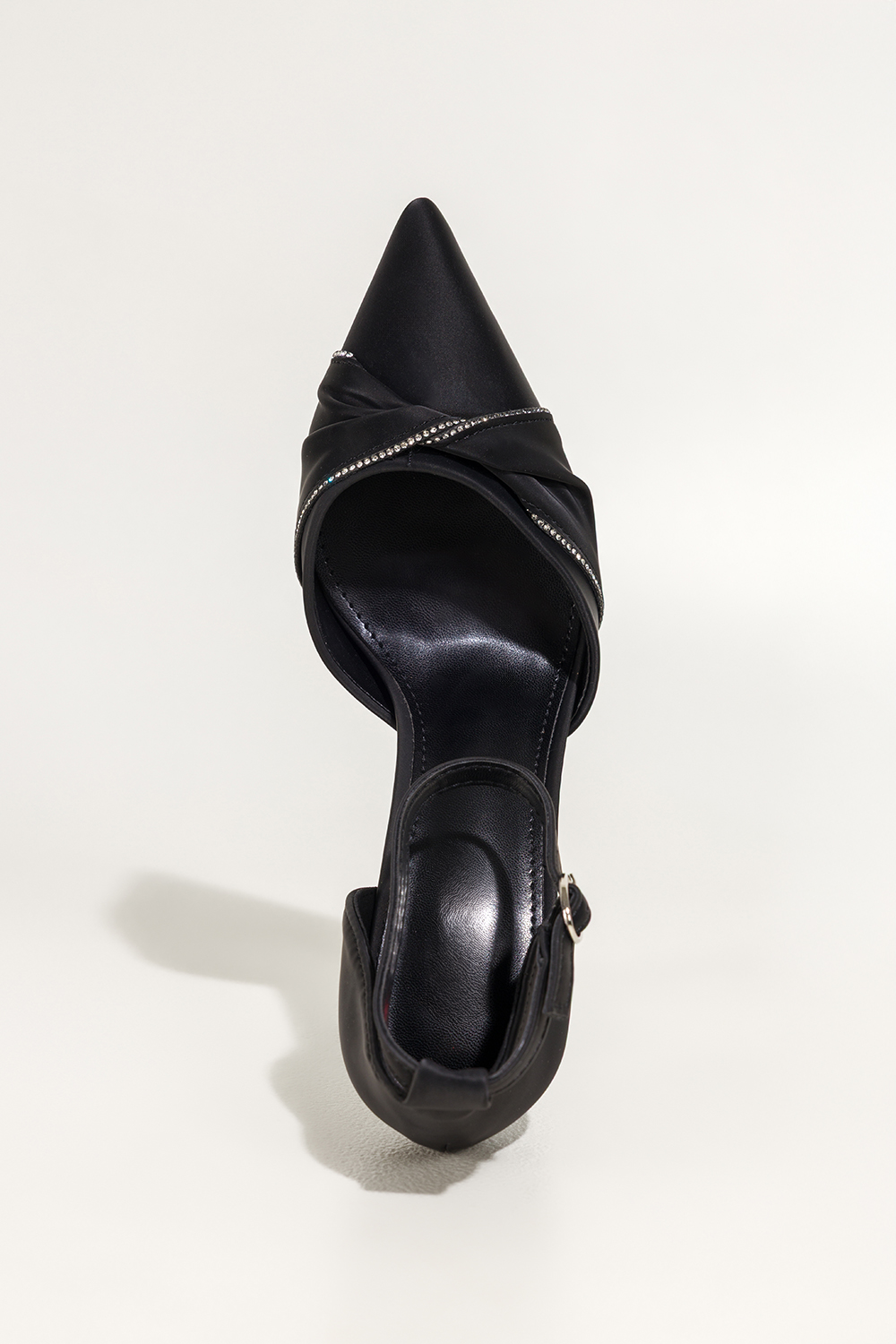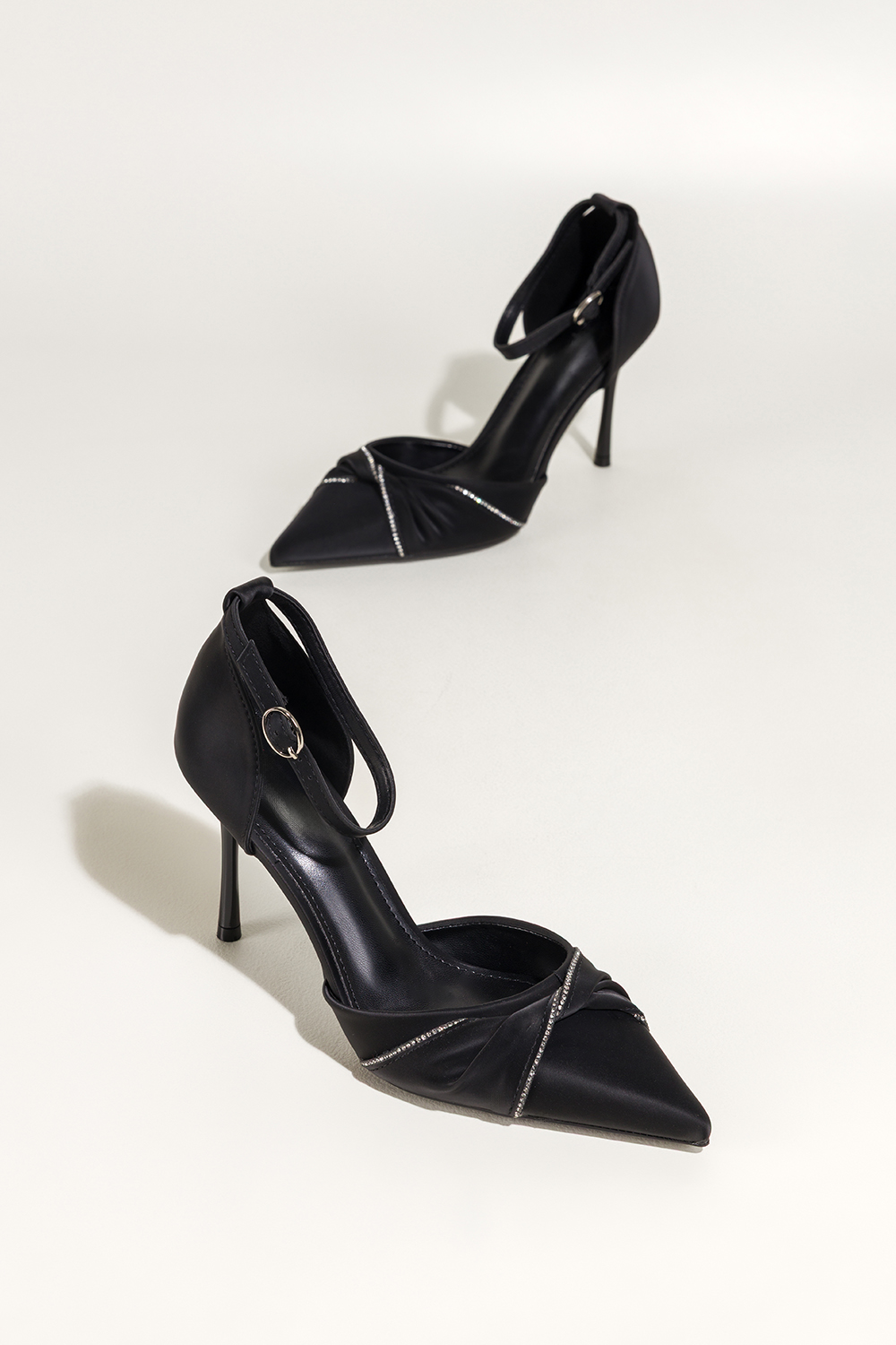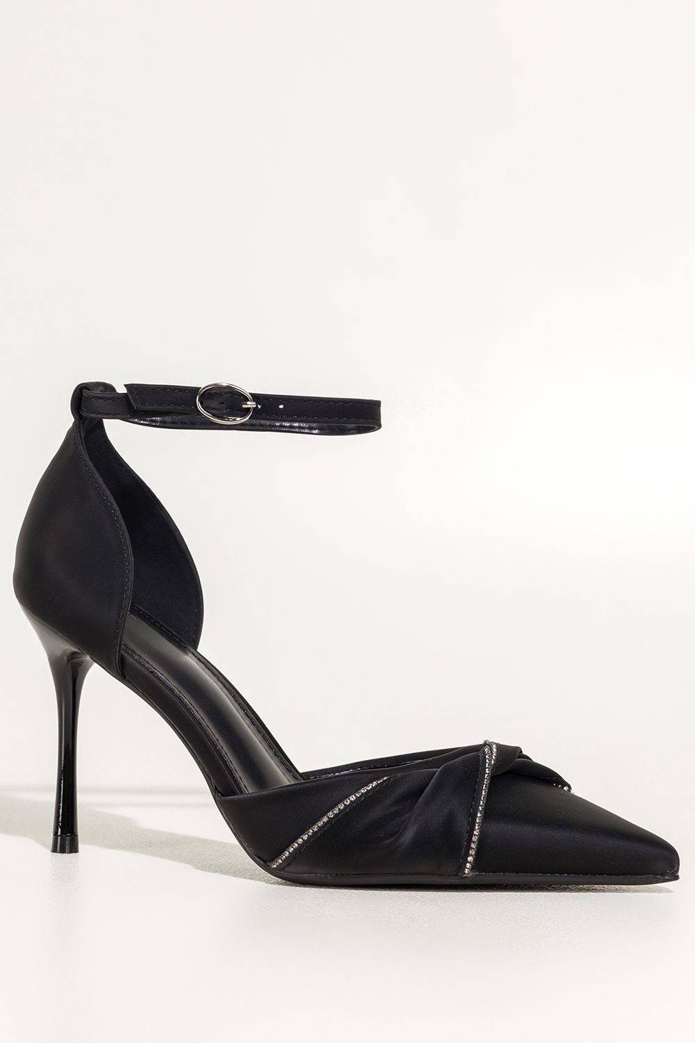 Czarne czółenka damskie szpilki satynowe z zakrytą piętą pasek wokół kostki kokarda z cyrkoniami Ca
