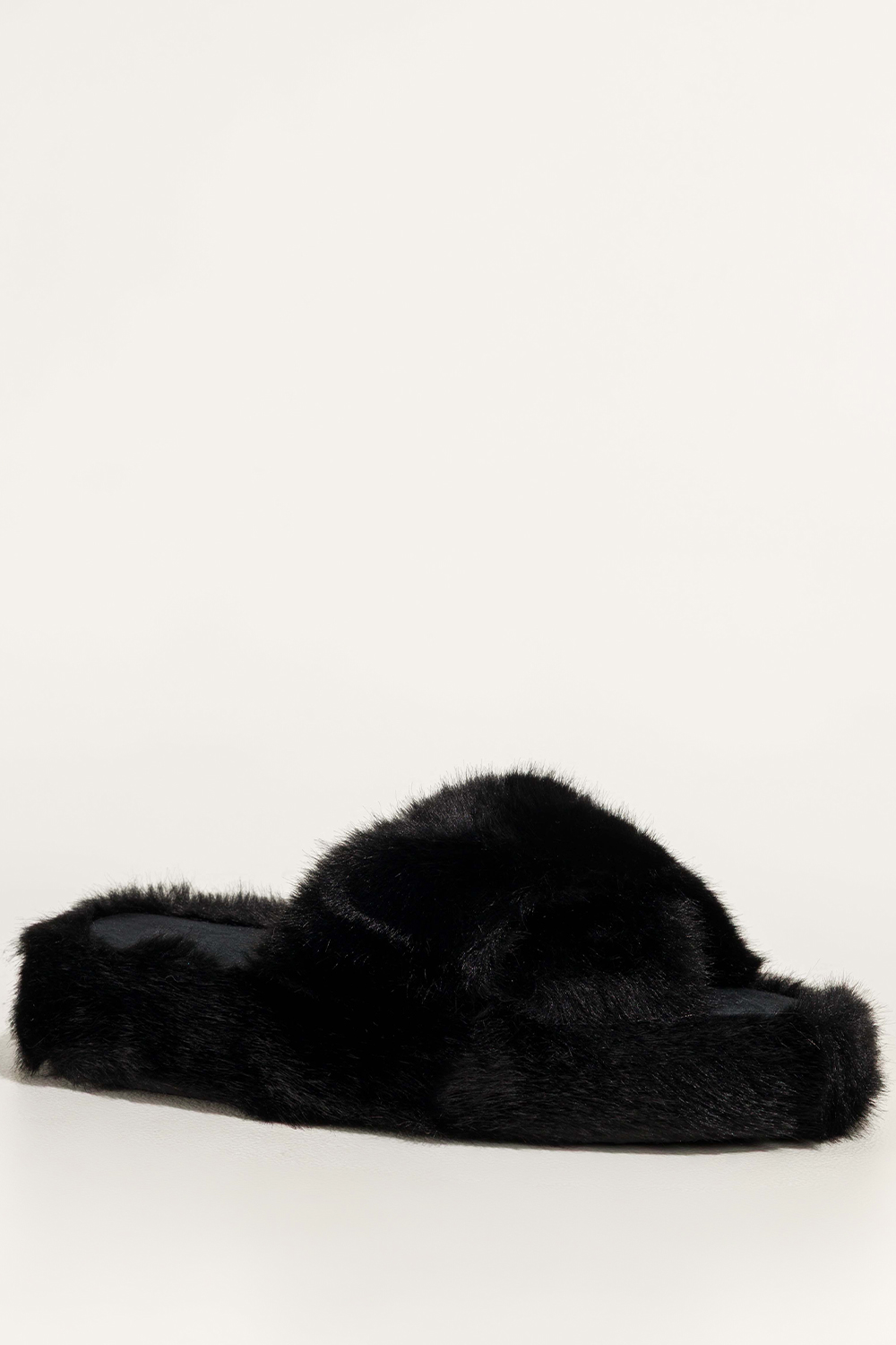 Czarne kapcie damskie obuwie domowe futrzane na platformie ozdobny pasek ze złotą klamrą Carla UO96
