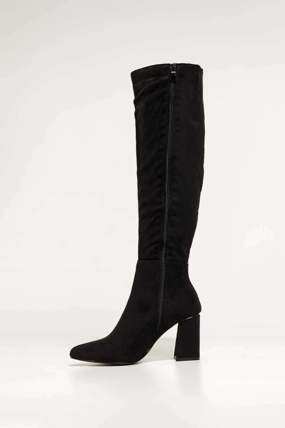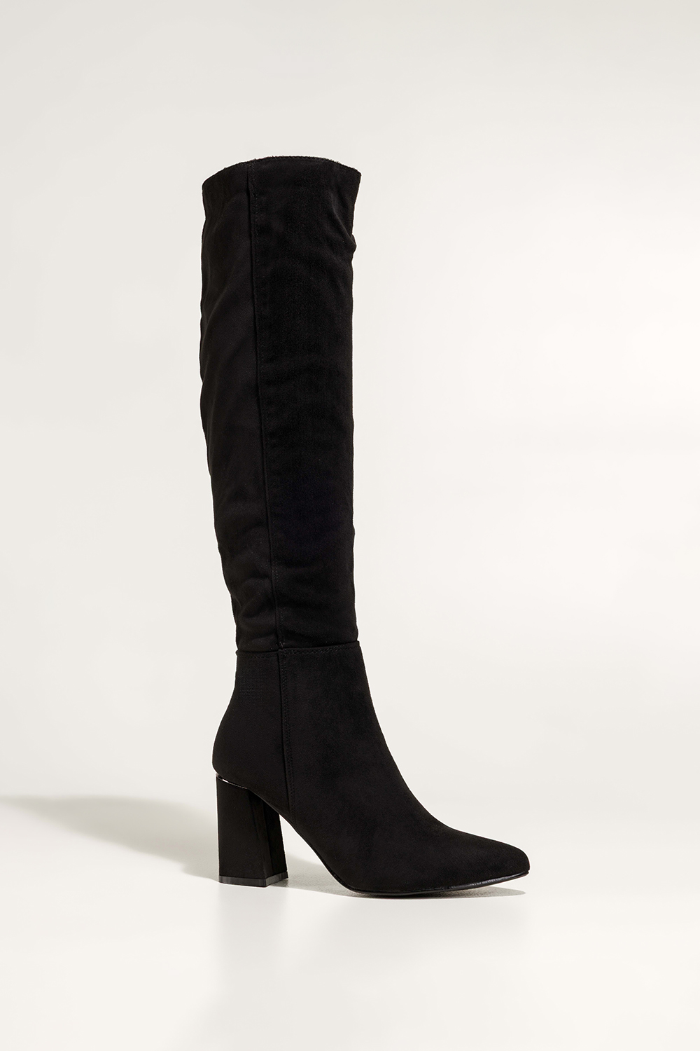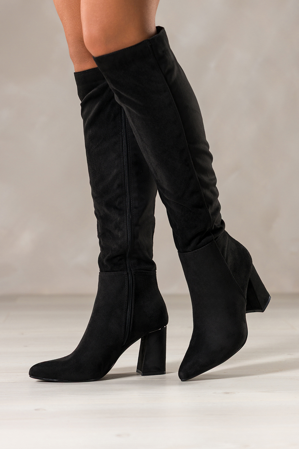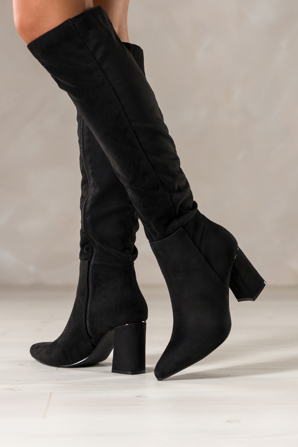 Czarne kozaki za kolano damskie na ozdobnym obcasie z elastyczną cholewką Casu D212X12-B