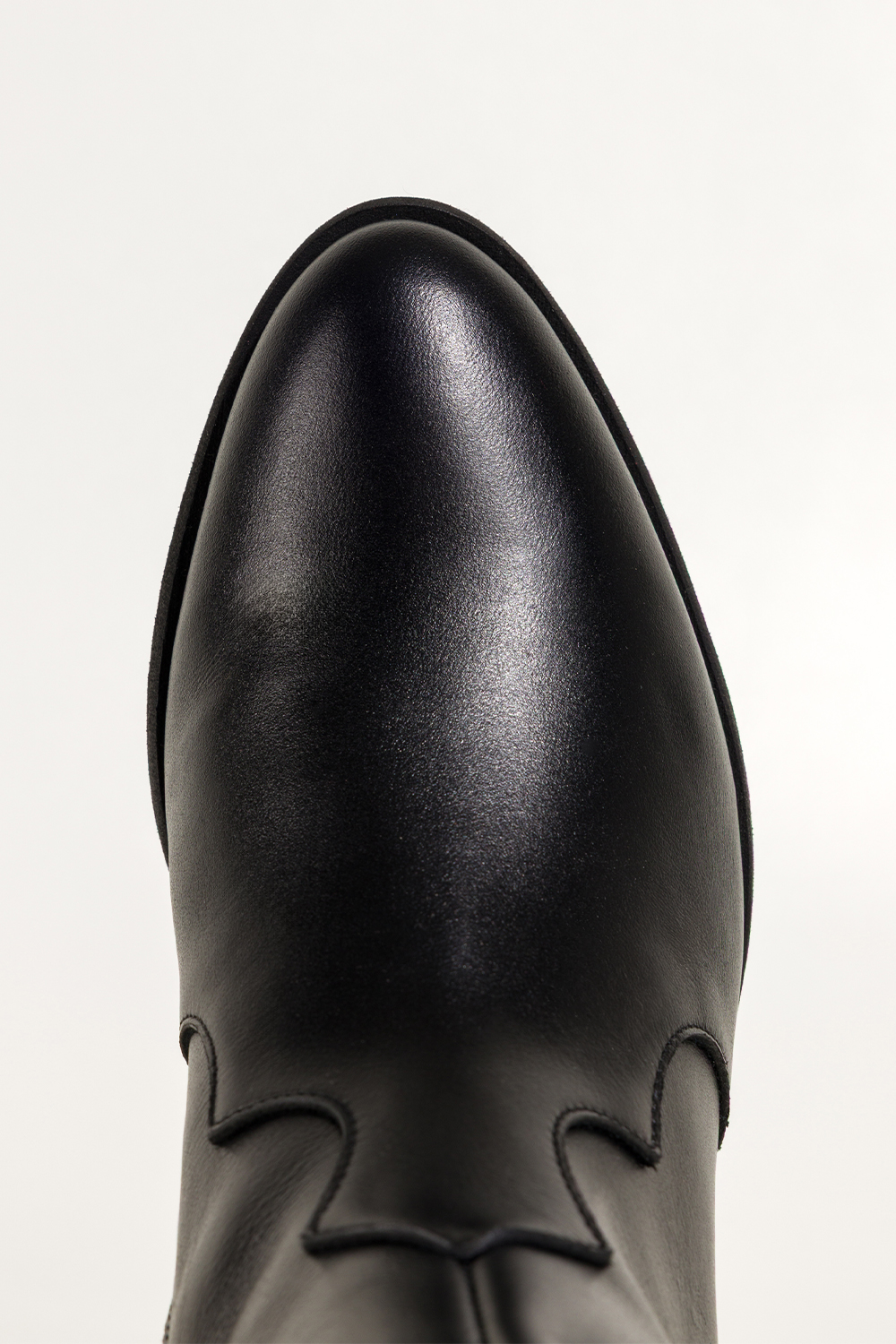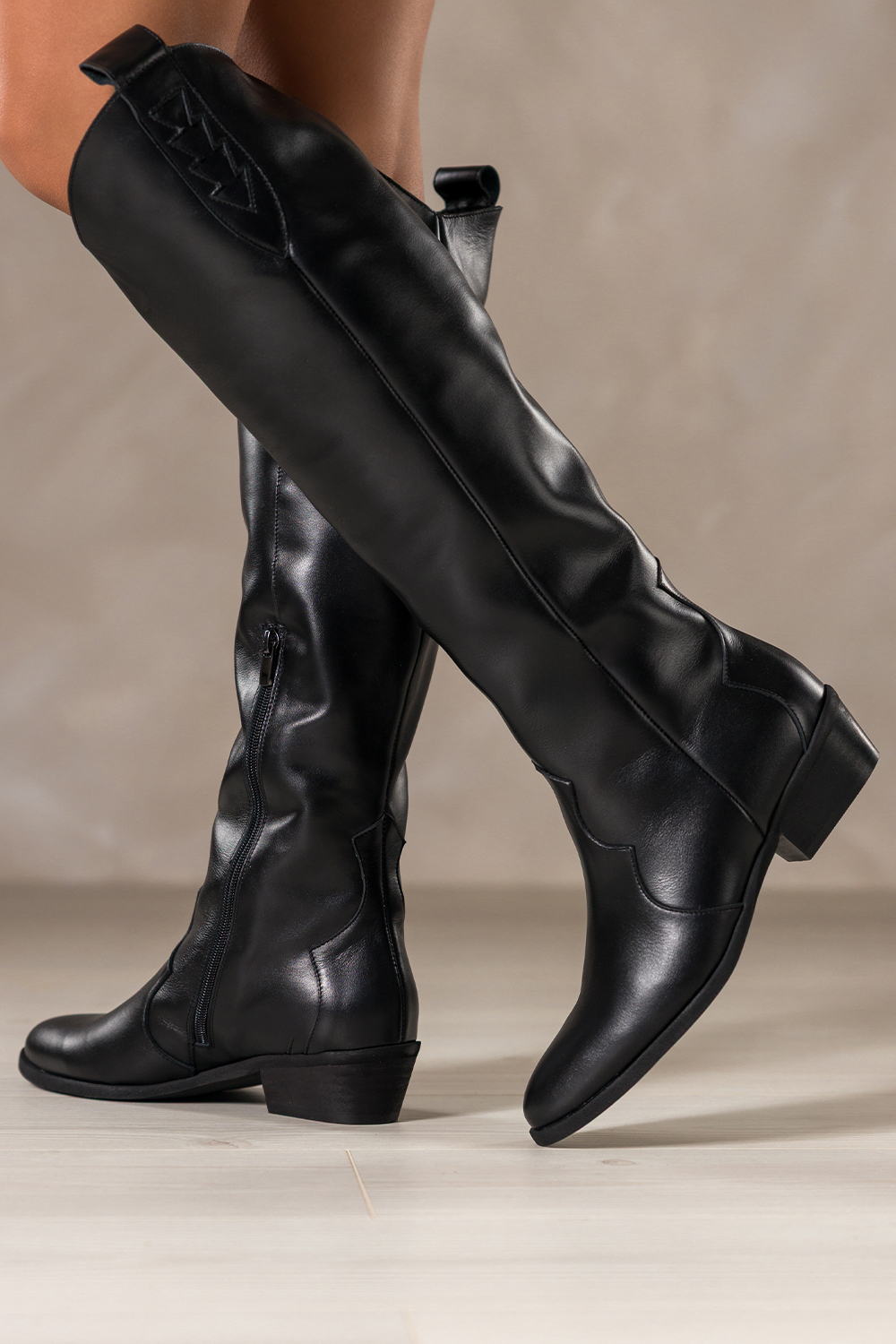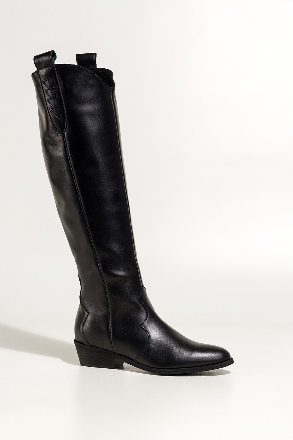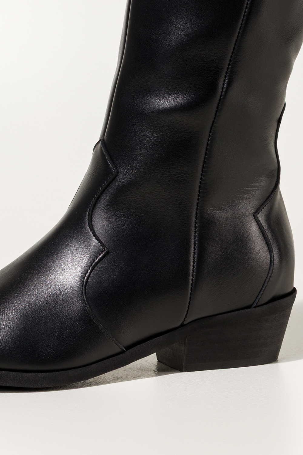 Czarne kozaki skórzane damskie kowbojki na ściętym klocku wycięta cholewka z ozdobnymi paskami PROD