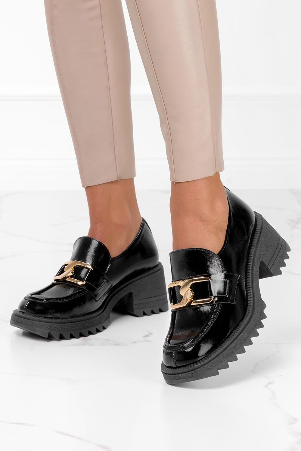 Czarne mokasyny skórzane lakierowane damskie na platformie z łańcuchem PRODUKT POLSKI Casu 2523-600