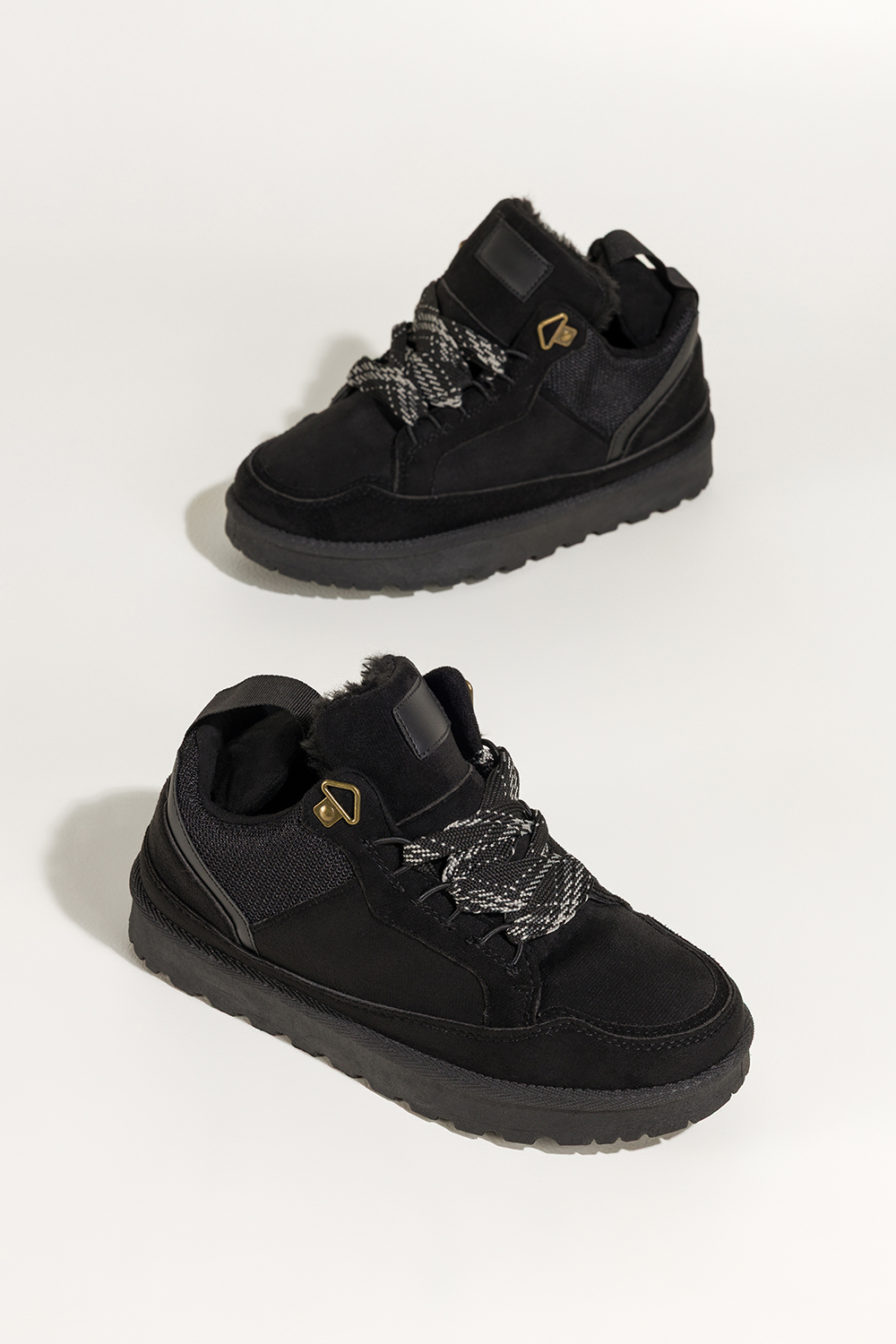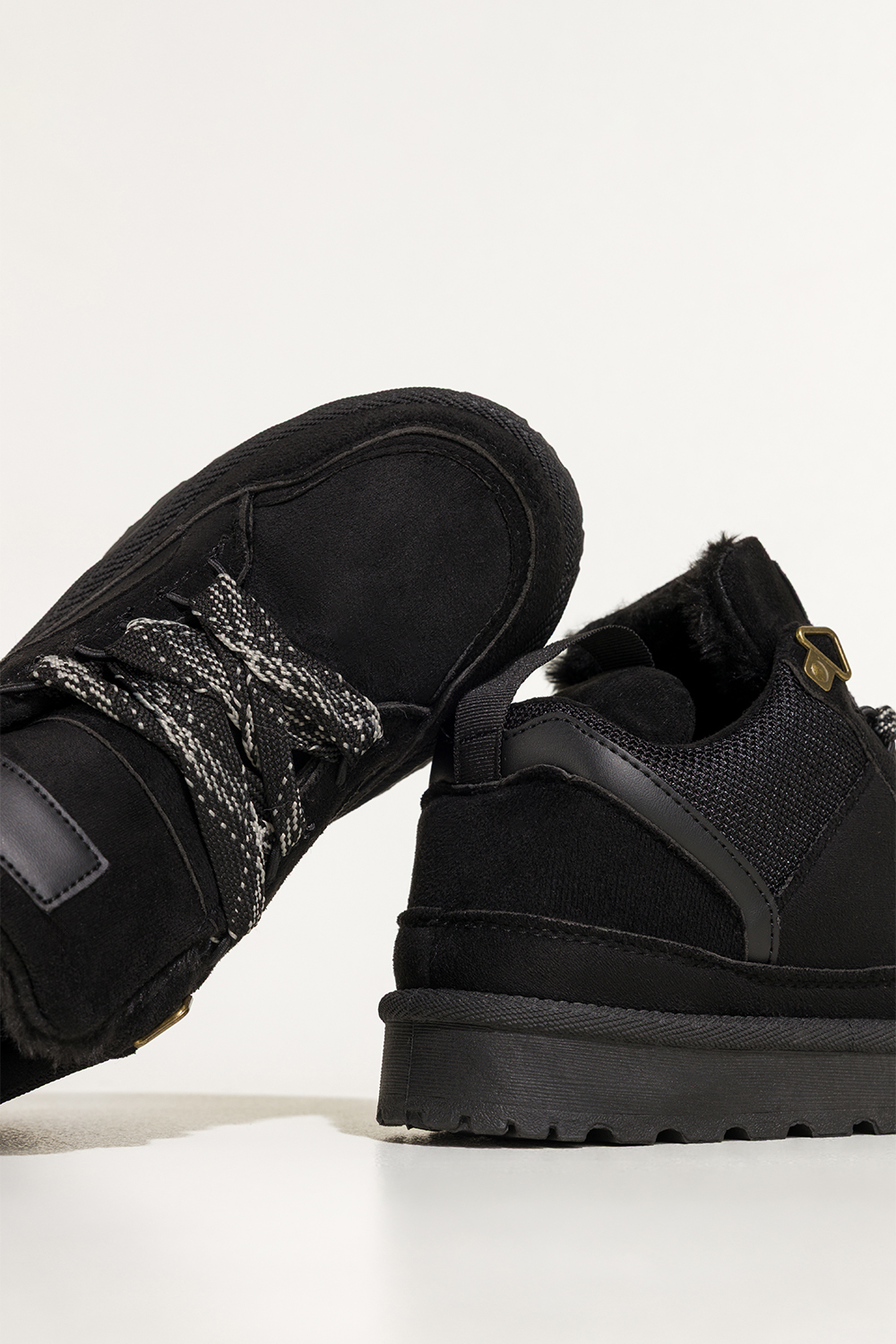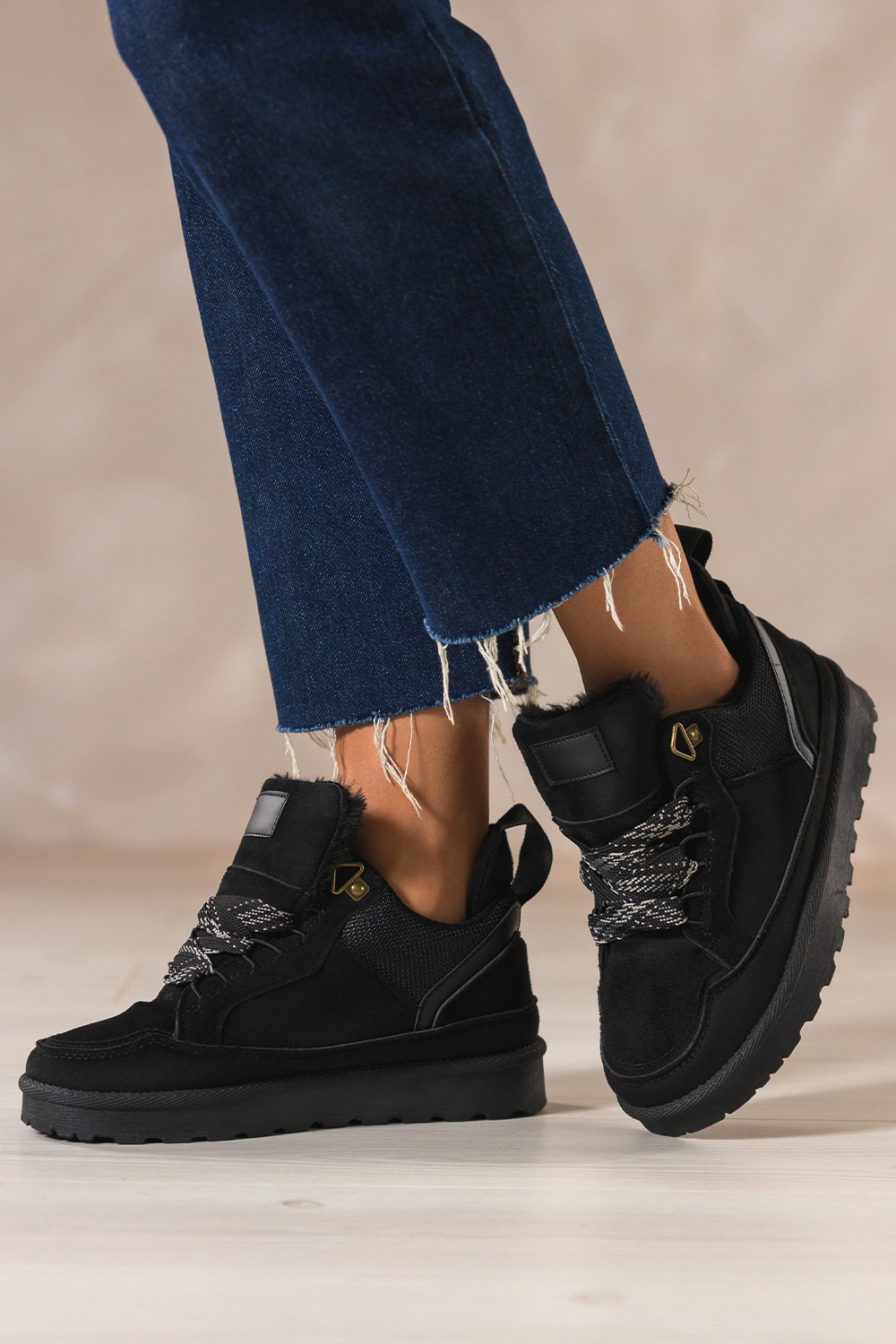 Czarne sneakersy damskie z futerkiem na bieżnikowanej platformie ozdobne sznurówki z wzorem Casu 22