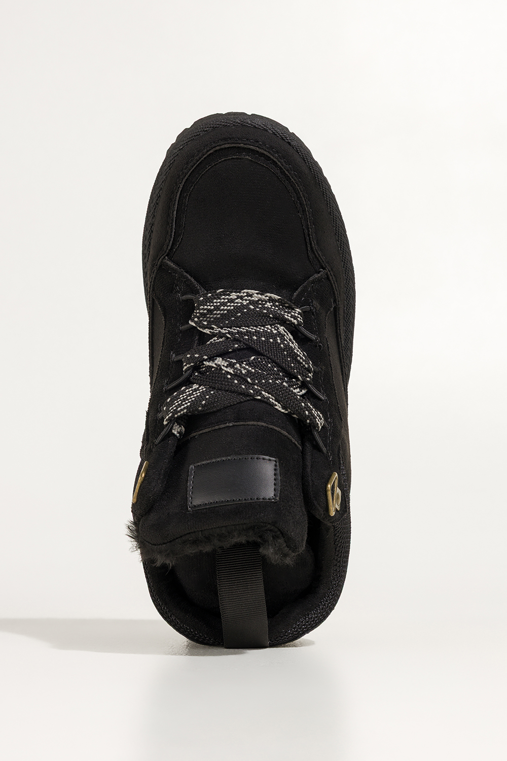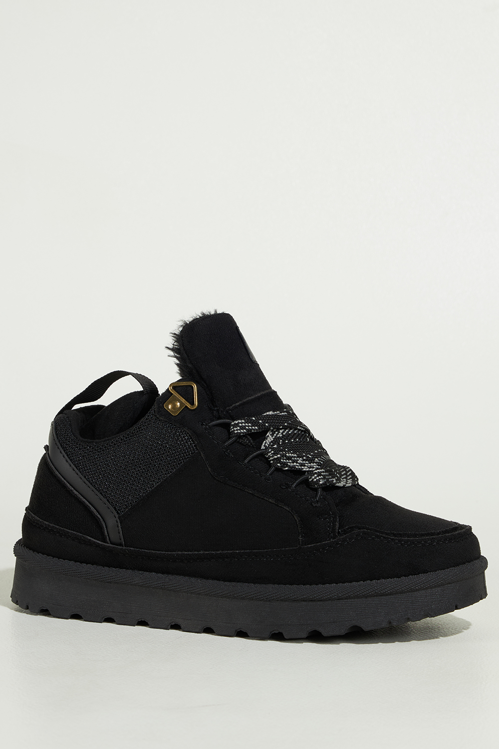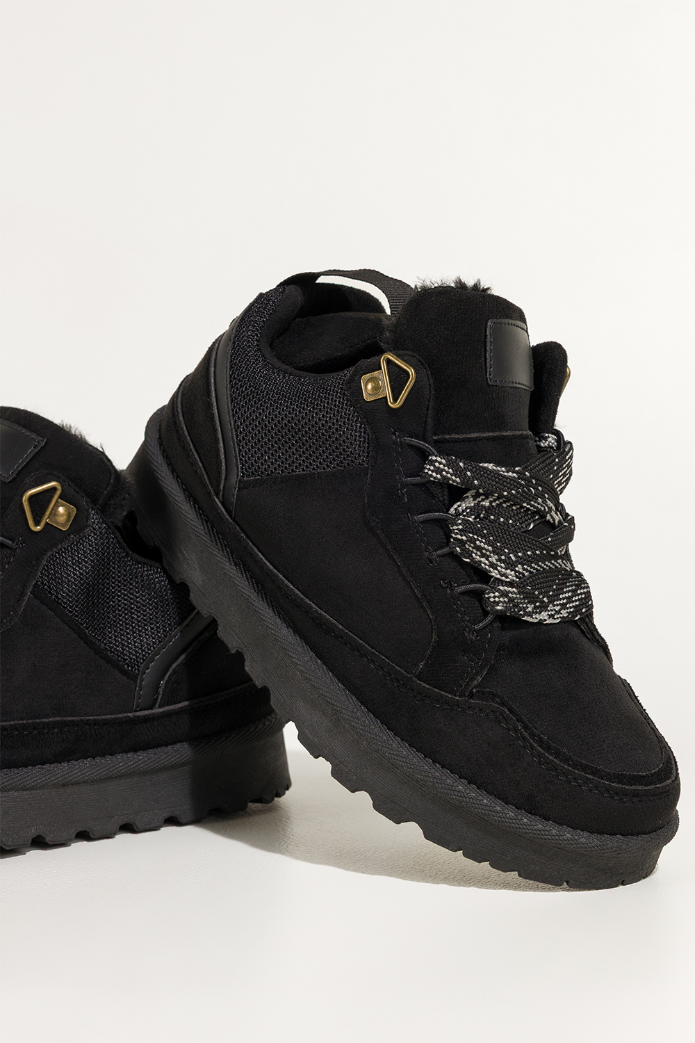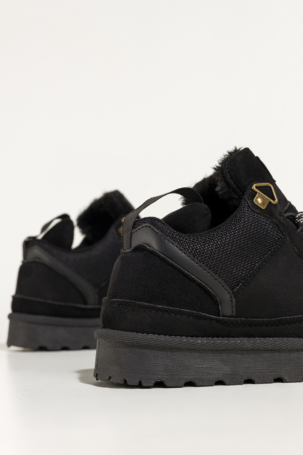 Czarne sneakersy damskie z futerkiem na bieżnikowanej platformie ozdobne sznurówki z wzorem Casu 22